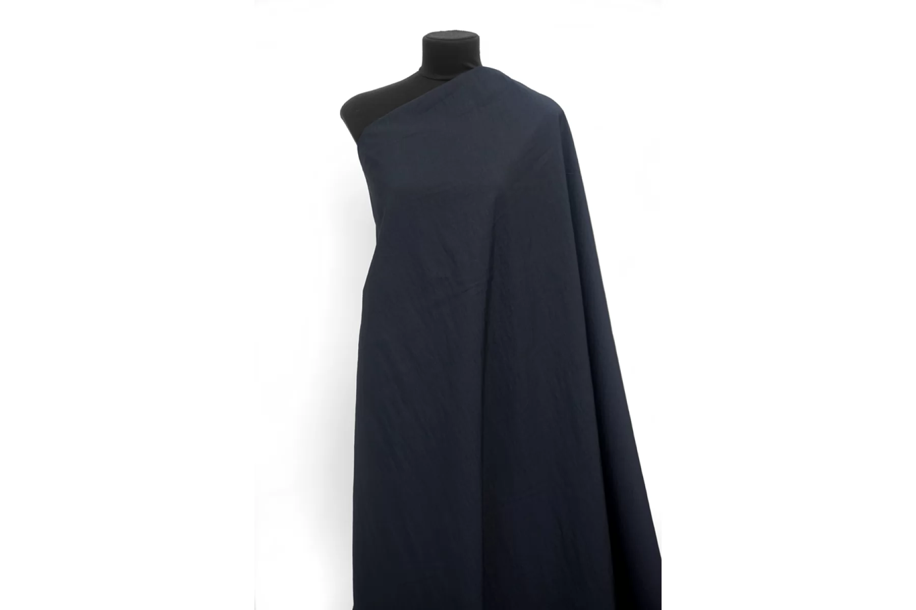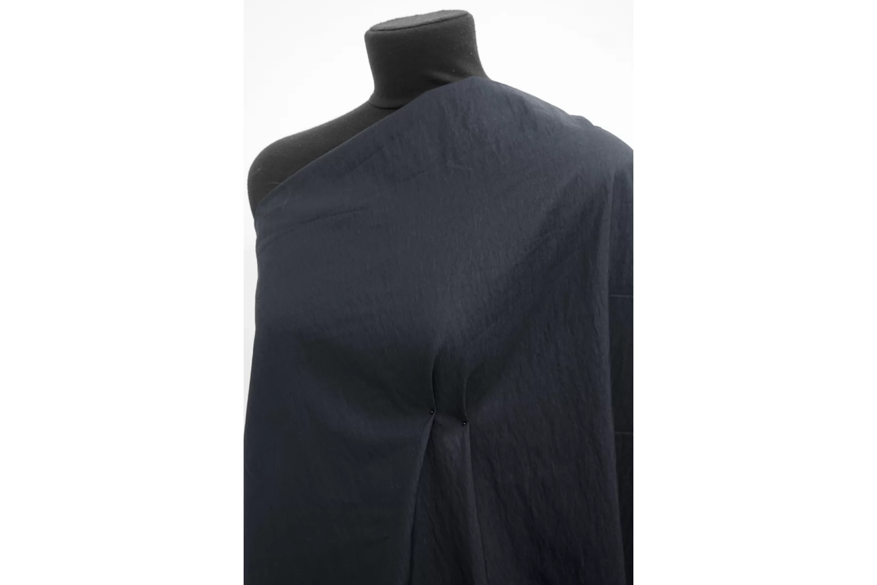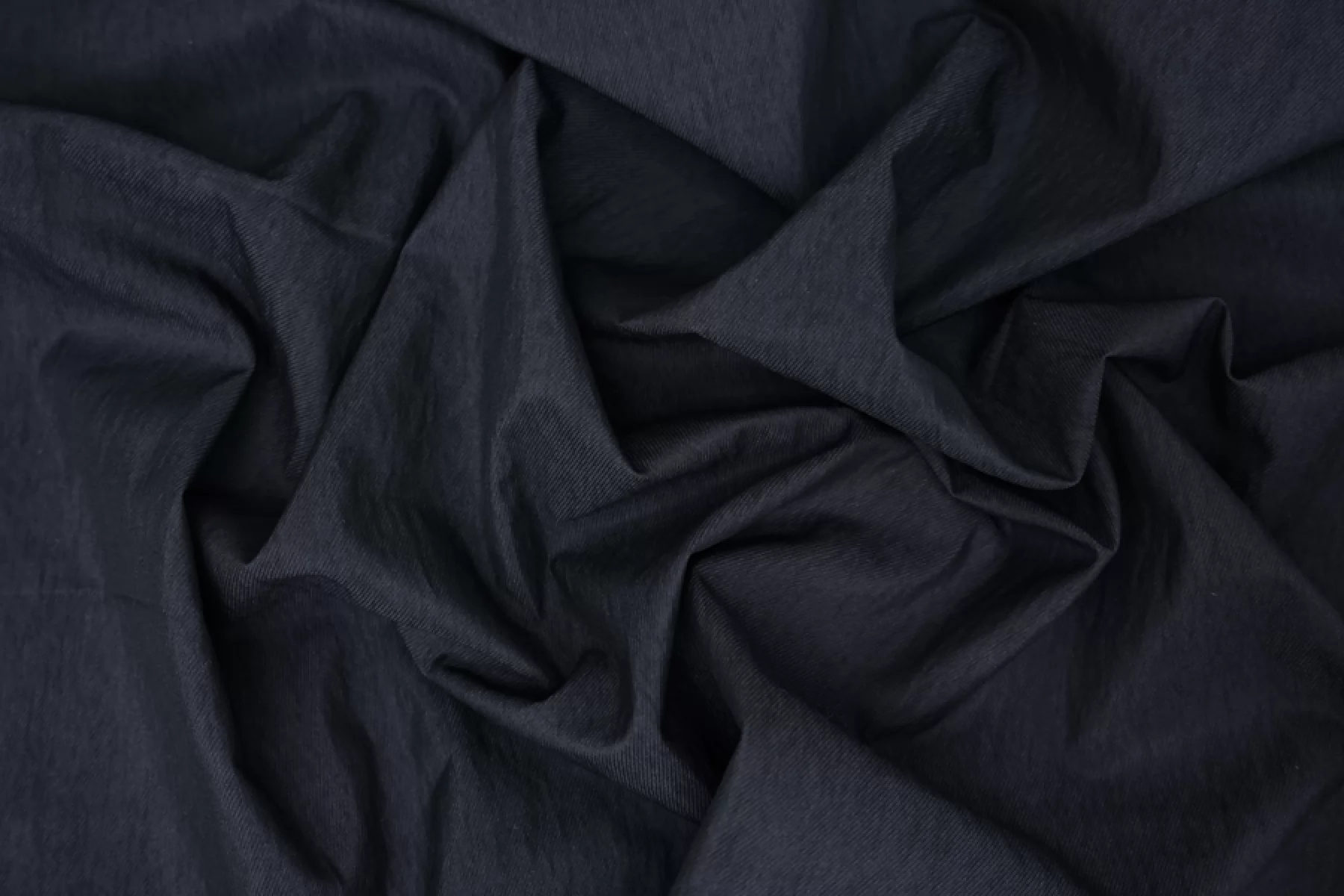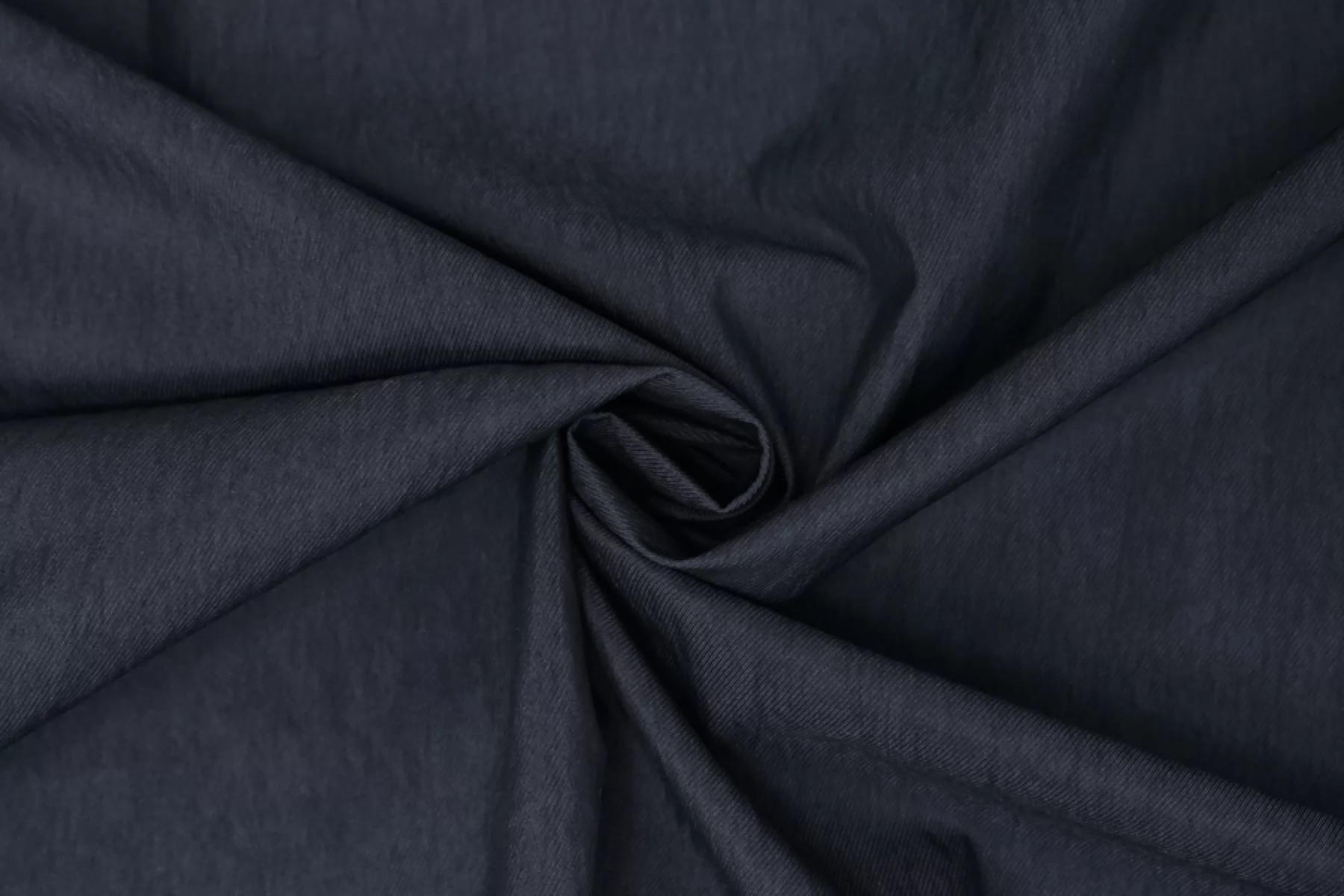 Плащевый хлопок диагонального плетения в сложном темном оттенке серо-синего. Приятный, шероховатый, с легким эффектом креширования. С приятным лоском. Хорошо держит форму. Ветрозащитная и водоотталкивающая, капли легко скатываются и не впитываются. Сминается. Не тянется, не просвечивает. Прекрасно подойдет на пуховики, куртки и плащи (можно простегать с наполнителем и подкладкой).