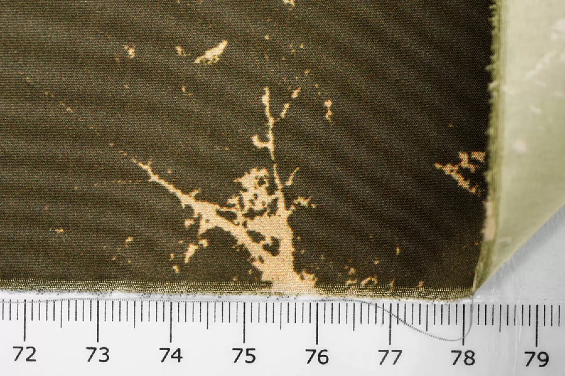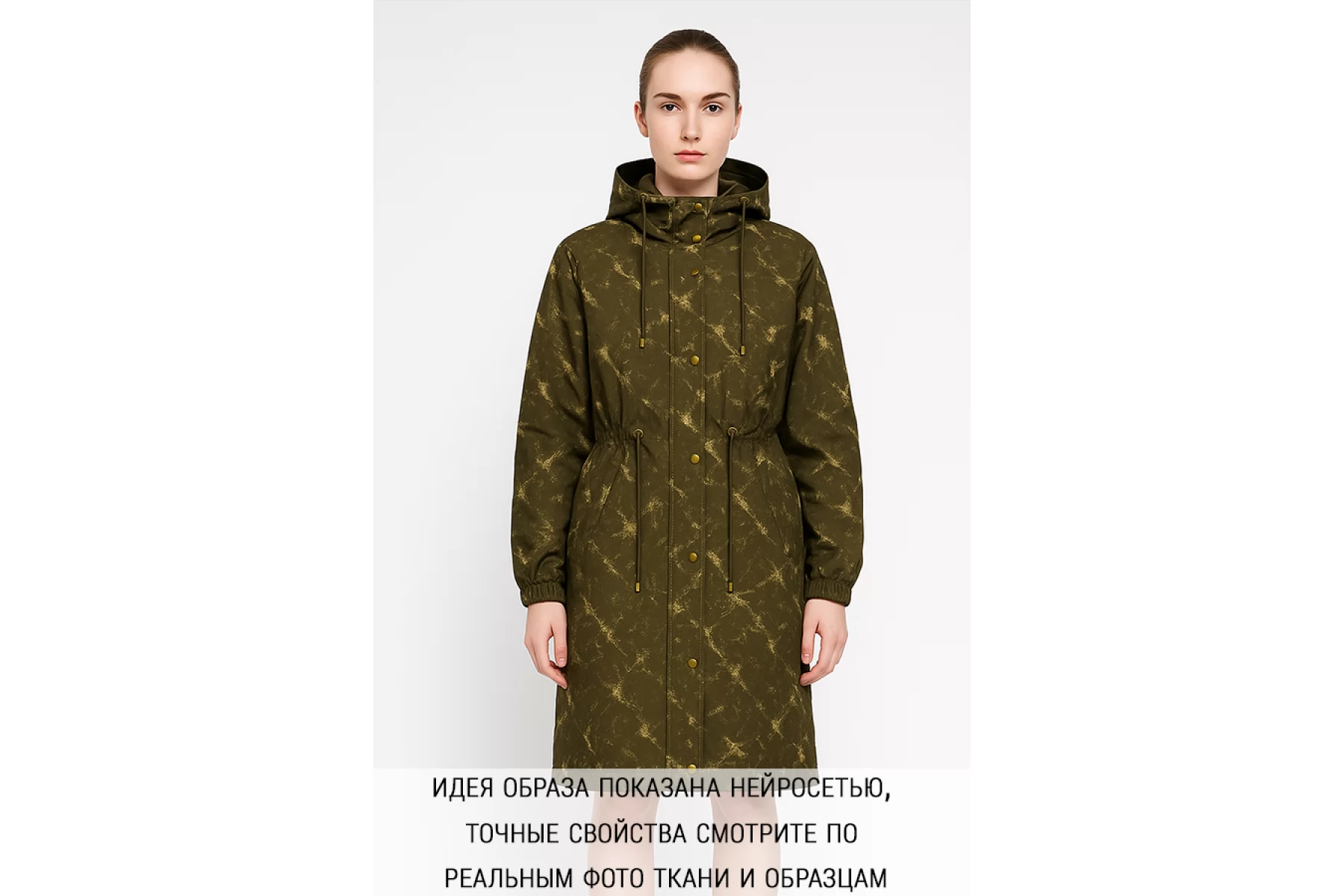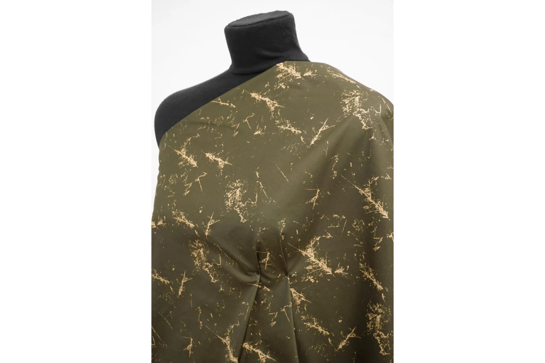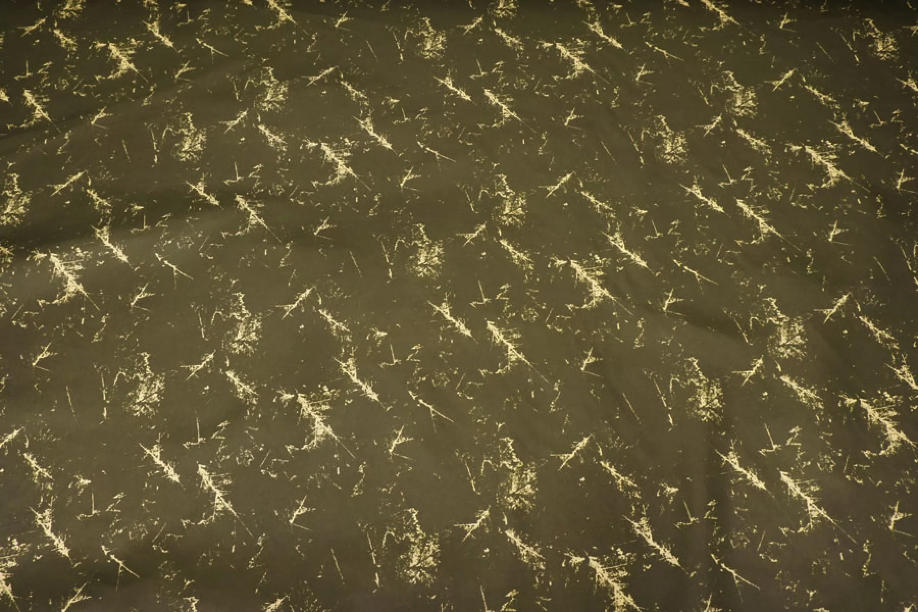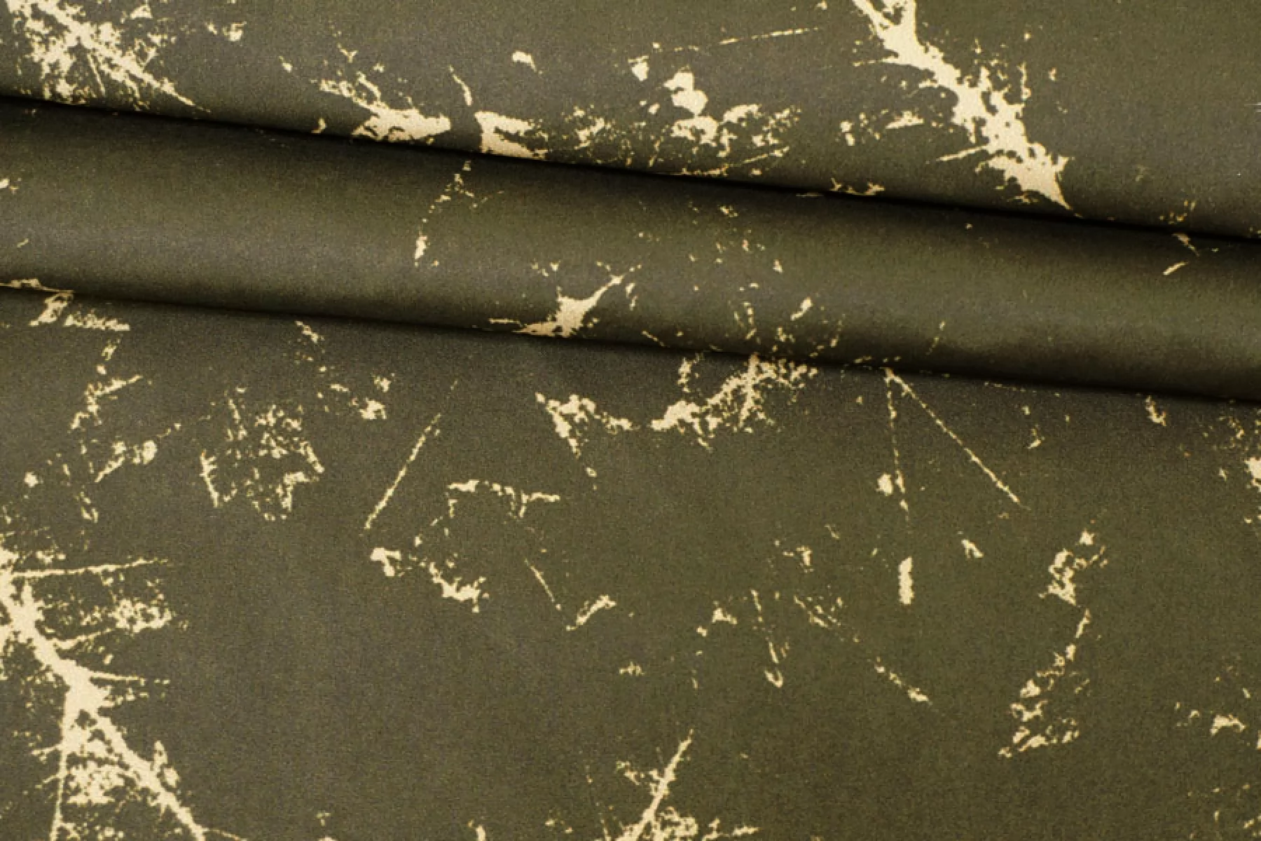 Плащевый нейлон оттенка хаки с абстрактным принтом в виде "потертых" пятен (напоминает отпечатки кленовых листьев) бежевого оттенка. Полотно с матовым лоском, тонкая, гладкая, мягкая и приятная. Не тянется. Ветрозащитная, капли легко скатываются и не впитываются. Несильно сминается. Не просвечивает. Отличный вариант на куртки, стежки, плащи и пуховики (простегать с наполнителем и подкладкой).
