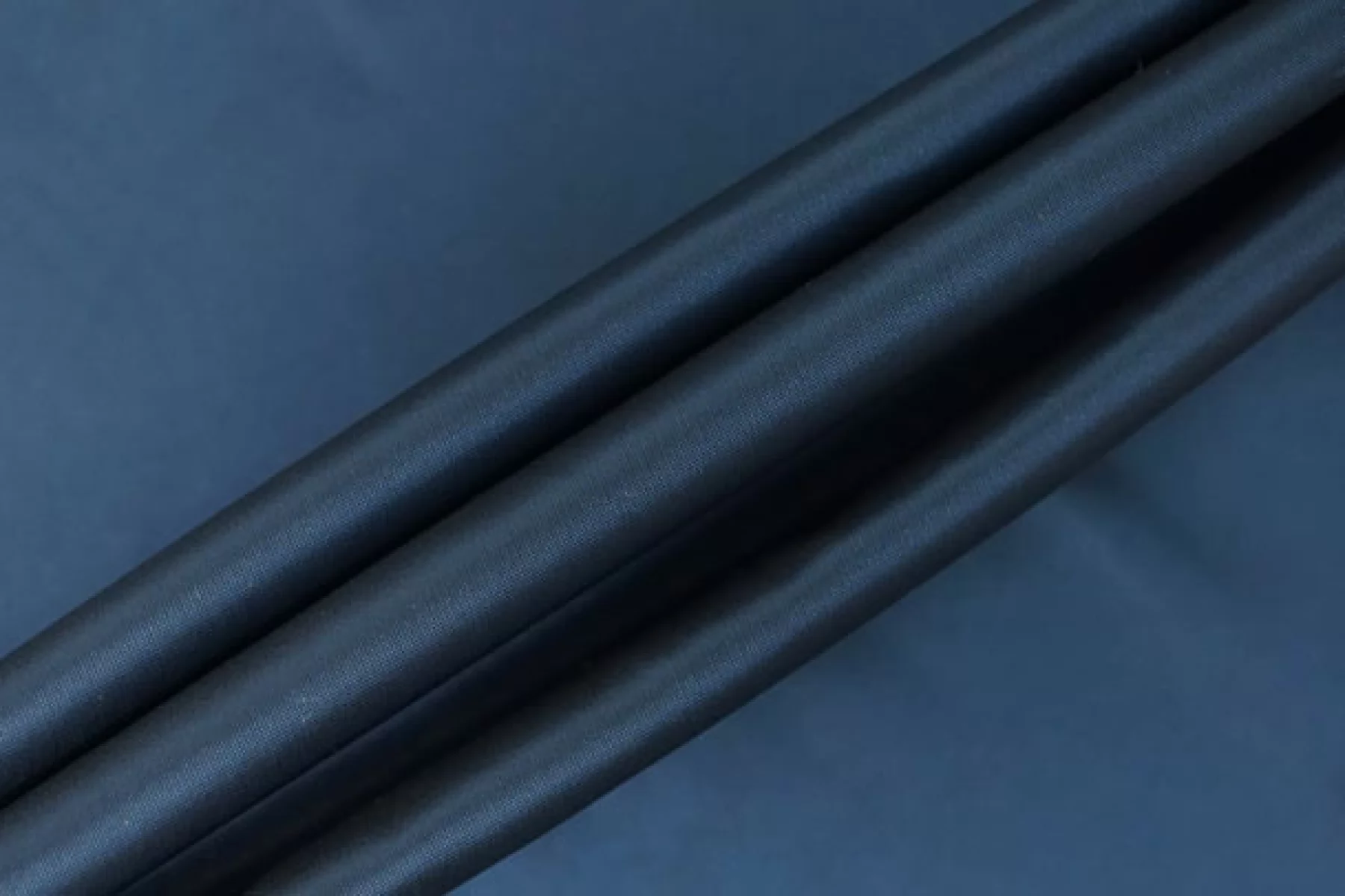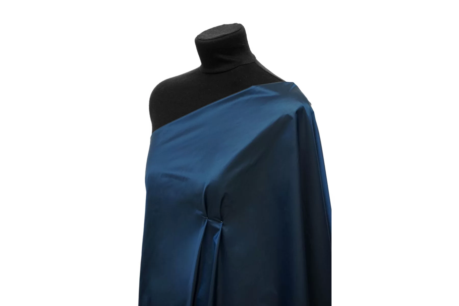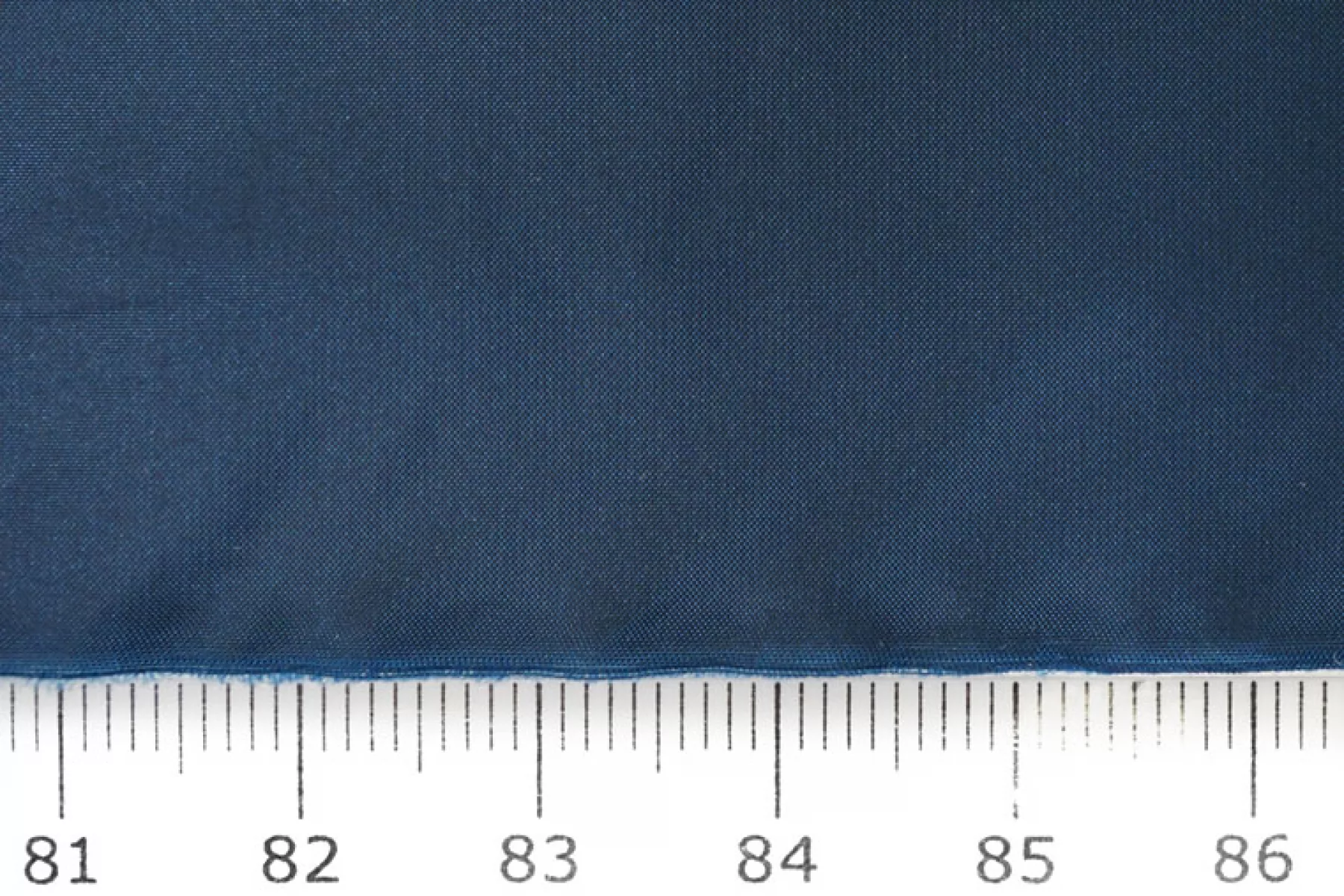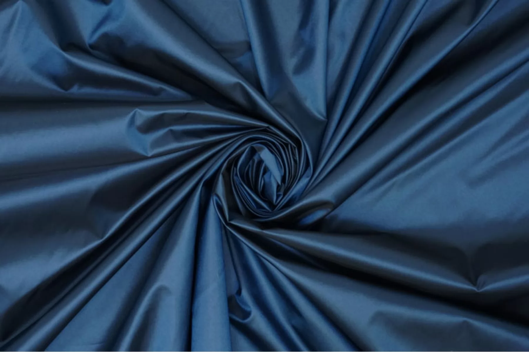 Плащевый нейлон перламутрово-синего оттенка от MAX MARA. Ткань обладает красивым матовым лоском, гладкая, мягкая, тонкая и приятная . Ветрозащитная, капли легко скатываются и не впитываются. Сминается. Достаточно плотная, хотя и тонкая. Не просвечивает. Не тянется. Хорошо держит форму. Прекрасно подойдет на пуховики, куртки и плащи (простегать с наполнителем и подкладкой).