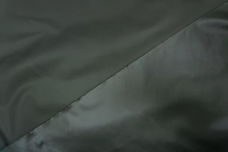 Плащевка тонкая, тёмного зелёного цвета от MAX MARA. Одна сторона матовая, другая с отблеском. Тактильно очень приятная, мягкая. Плотная, легкая. Ветрозащитная, вода скатывается с поверхности. Сминается. Может слегка просвечивать силуэт. Минимально держит форму. Прекрасно подойдет для пошива дождевика, куртки, плаща, жилета (простегать с наполнителем и подкладкой).
