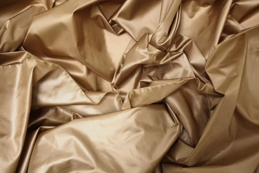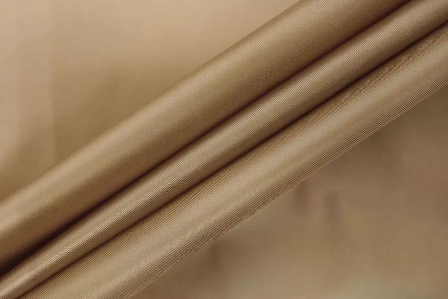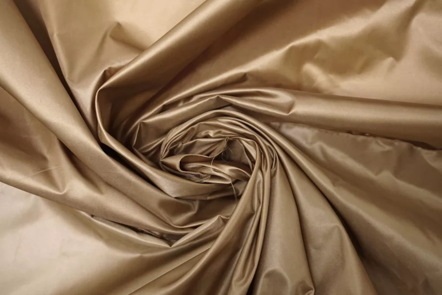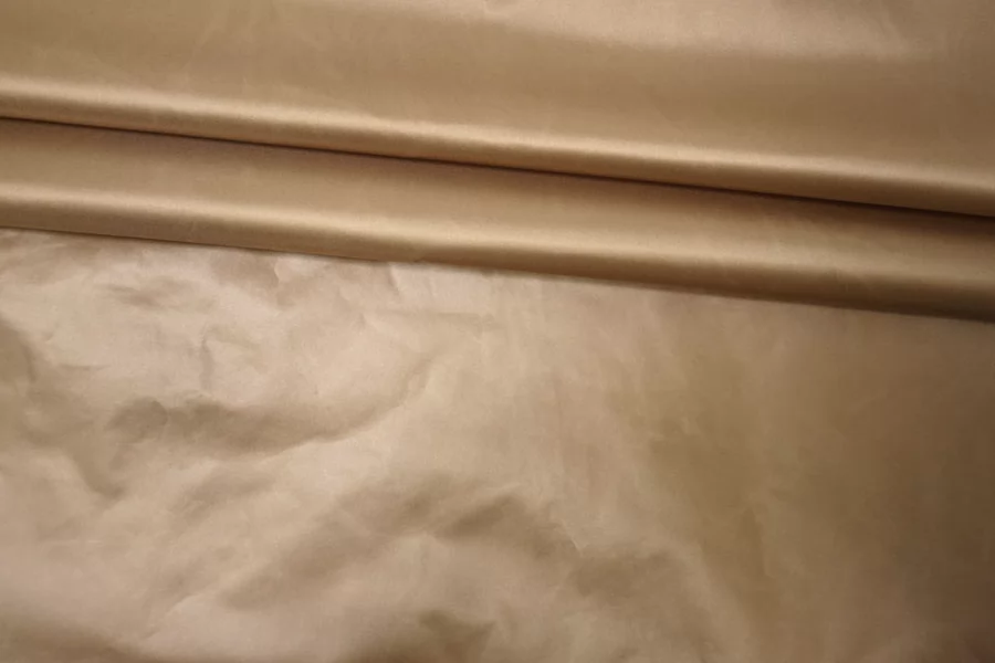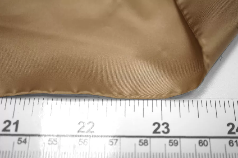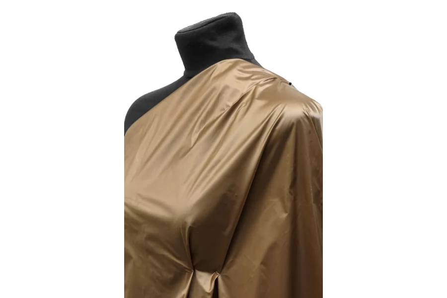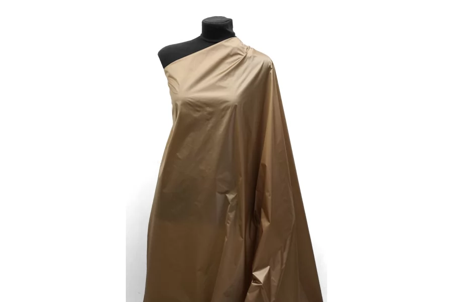 Плащевка тонкая в темном бежевом цвете, от MAX MARA. Обе стороны с отблеском. Тактильно очень приятная, мягкая. Плотная, легкая. Ветрозащитная, вода скатывается с поверхности, но в сильный дождь со временем начинает промокать. Сминается. Может слегка просвечивать силуэт. Минимально держит форму. Прекрасно подойдет для пошива дождевика, куртки, плаща, жилета (простегать с наполнителем и подкладкой).