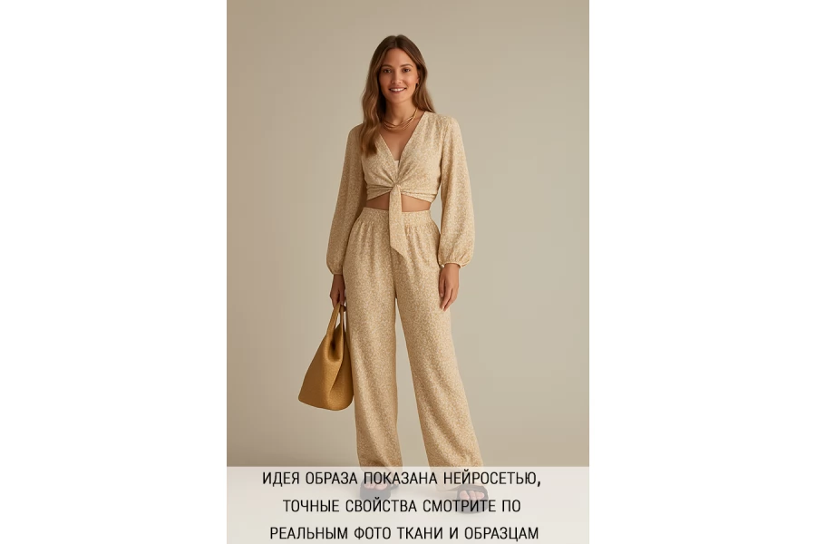 Креповая вискоза от Hugo Boss c абстрактным принтом, использован молочный и песочно-бежевый цвет. Приятная и шероховатая наощупь. Тонкая, пластичная, красиво драпируется, форму не держит. Немного просвечивает насквозь в один слой. Немного мнется. Отличный вариант на платья, юбки, блузки. Учитывайте усадку.