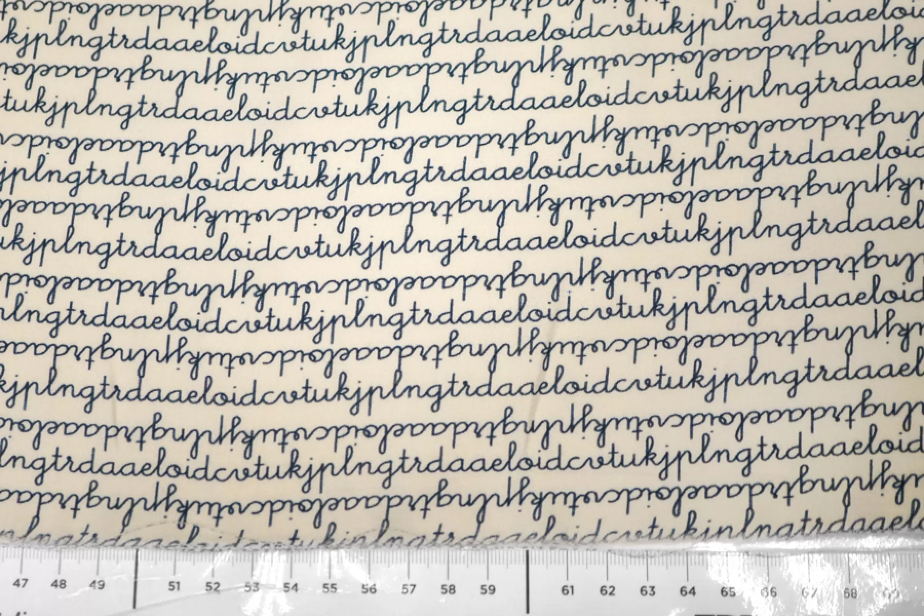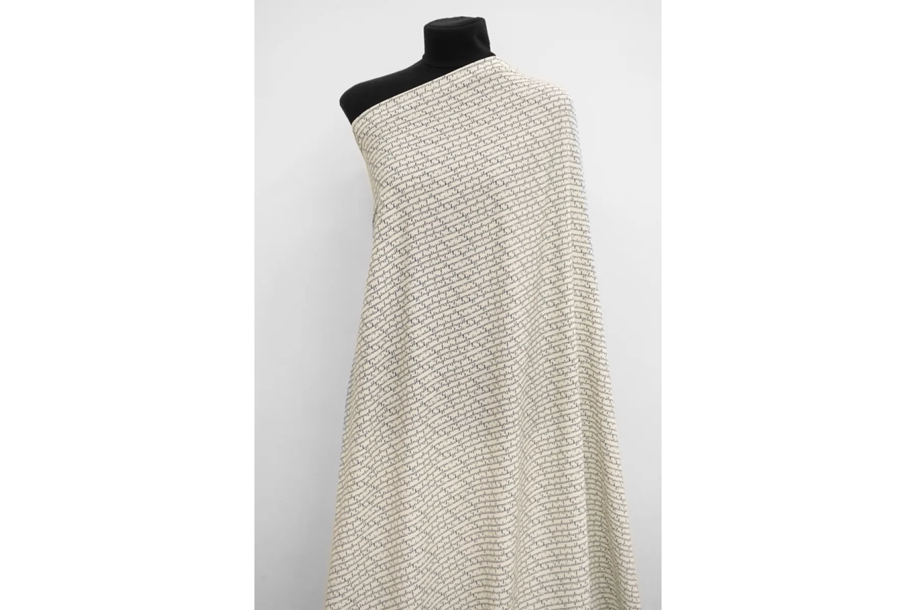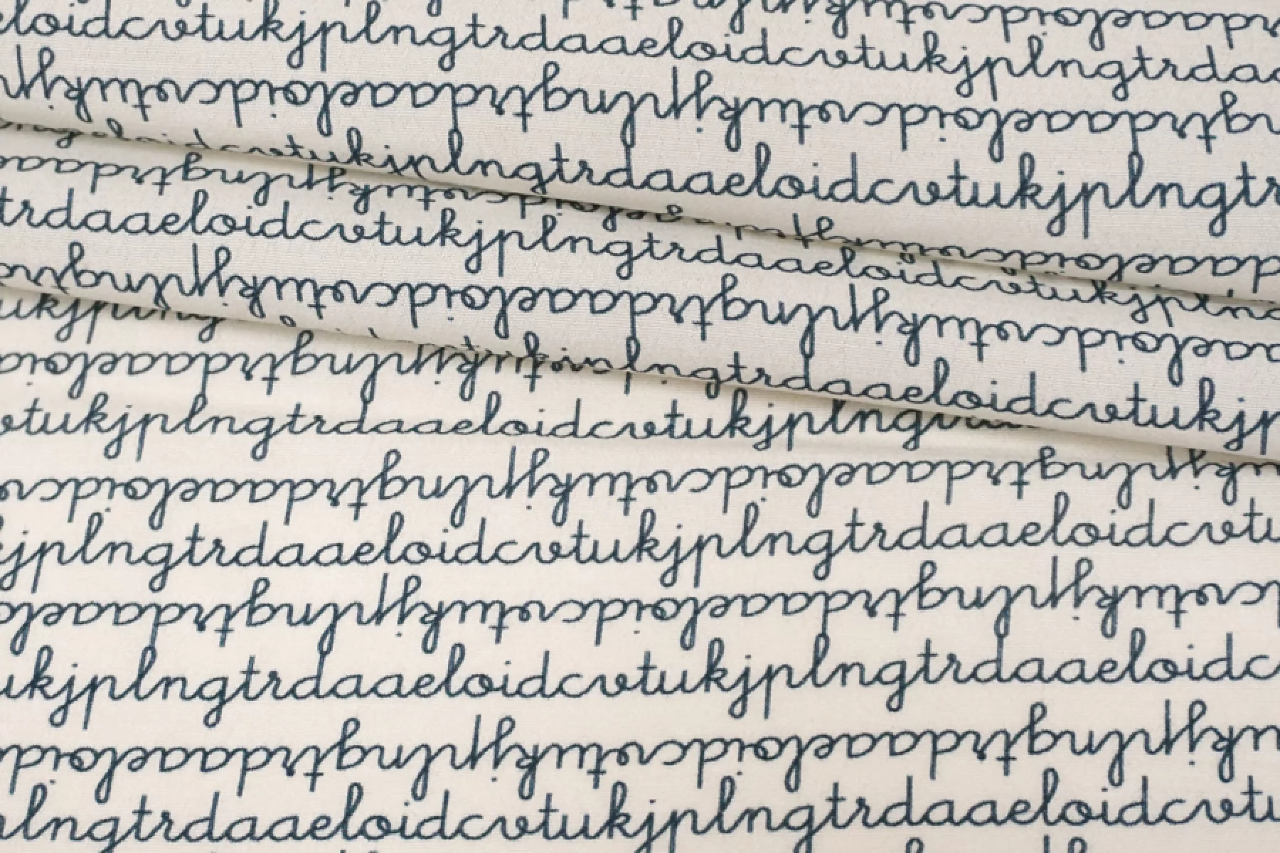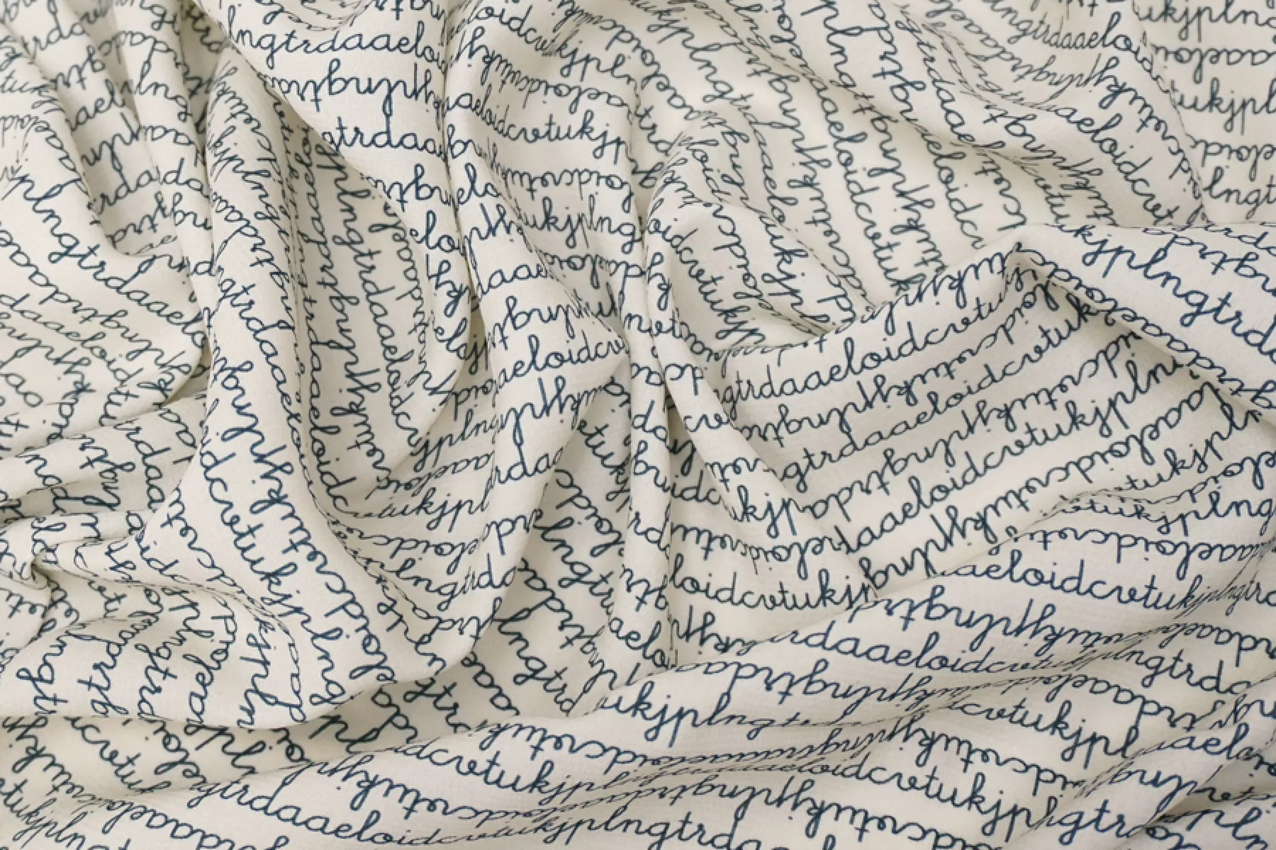 Креповая вискоза c принтом в виде бесконечного текста, буквы темно-синего цвета, фон молочный. Приятная и шероховатая наощупь. Тонкая, пластичная, красиво драпируется, форму не держит. Немного просвечивает. Немного мнется. Плетение немного тянется (пружинит). Отличный вариант на платья, юбки, блузки. Учитывайте усадку.