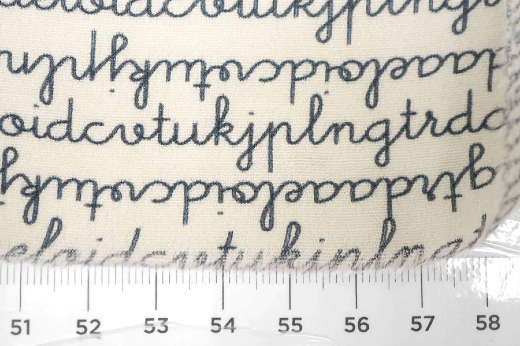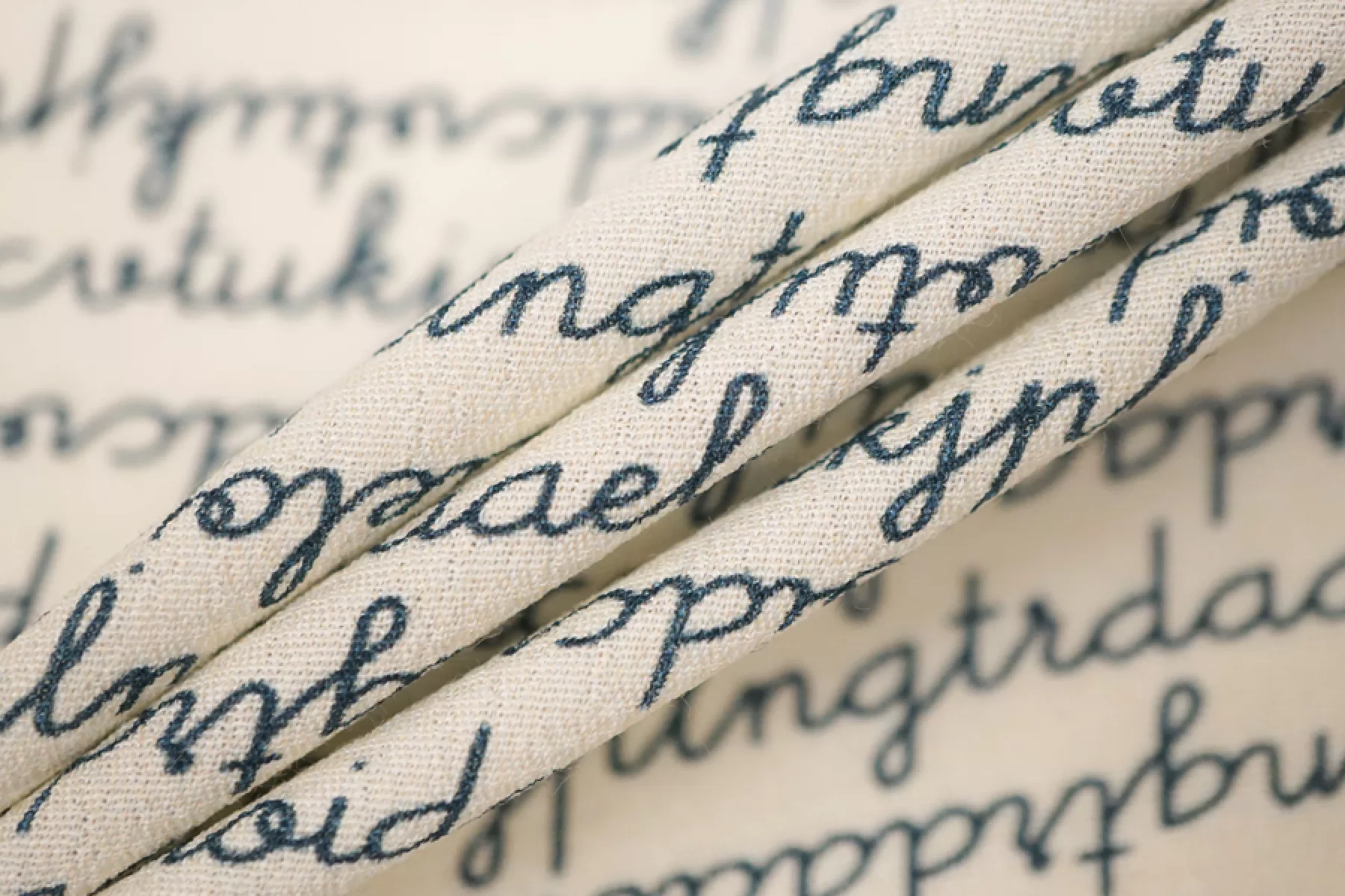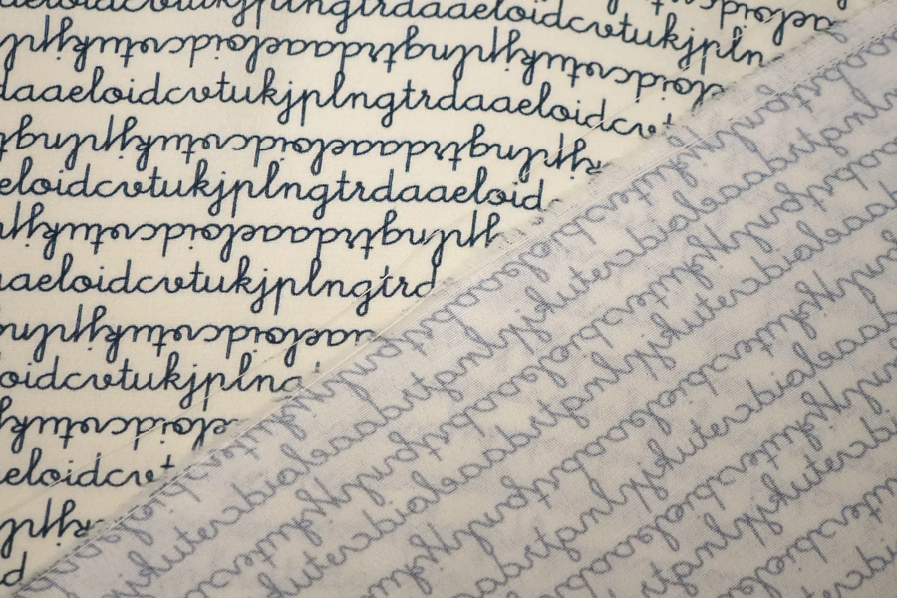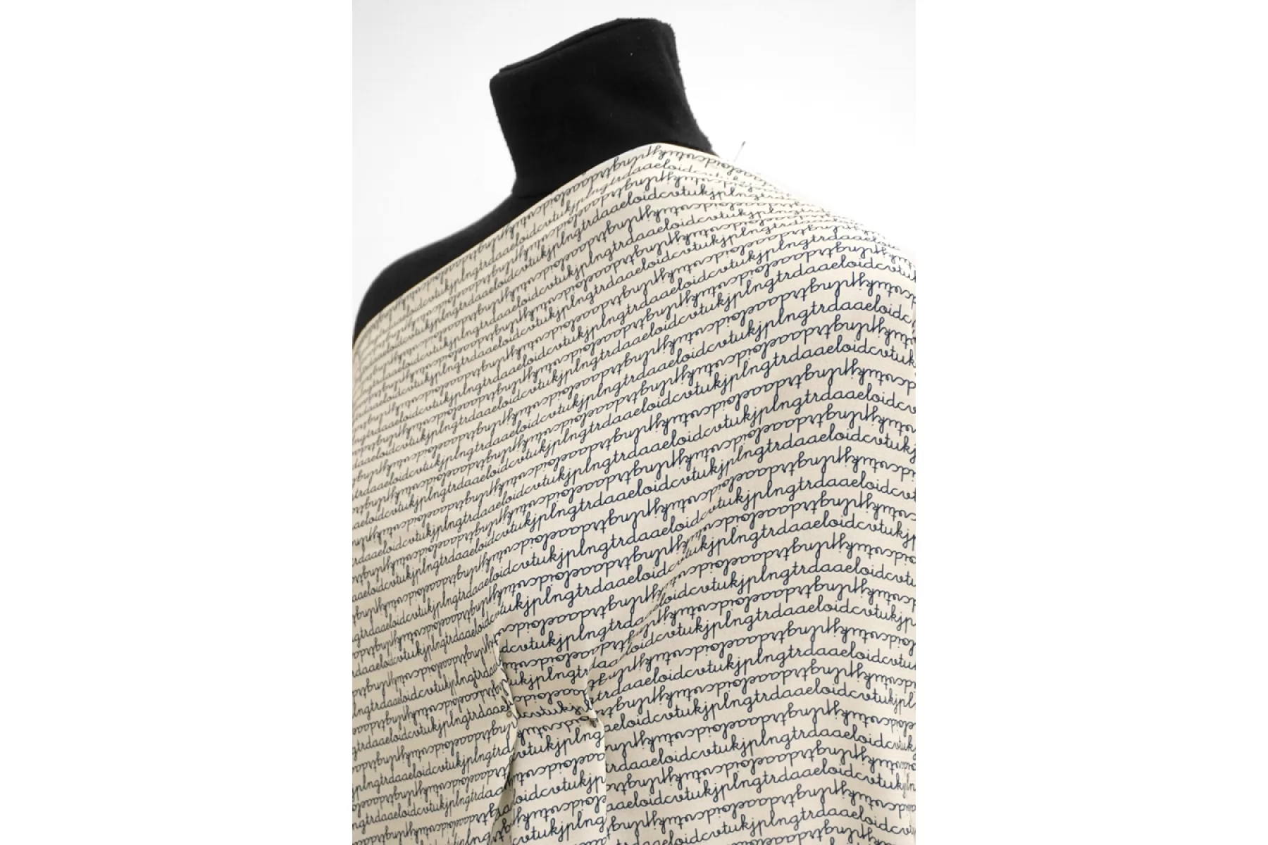 Креповая вискоза c принтом в виде бесконечного текста, буквы темно-синего цвета, фон молочный. Приятная и шероховатая наощупь. Тонкая, пластичная, красиво драпируется, форму не держит. Немного просвечивает. Немного мнется. Плетение немного тянется (пружинит). Отличный вариант на платья, юбки, блузки. Учитывайте усадку.