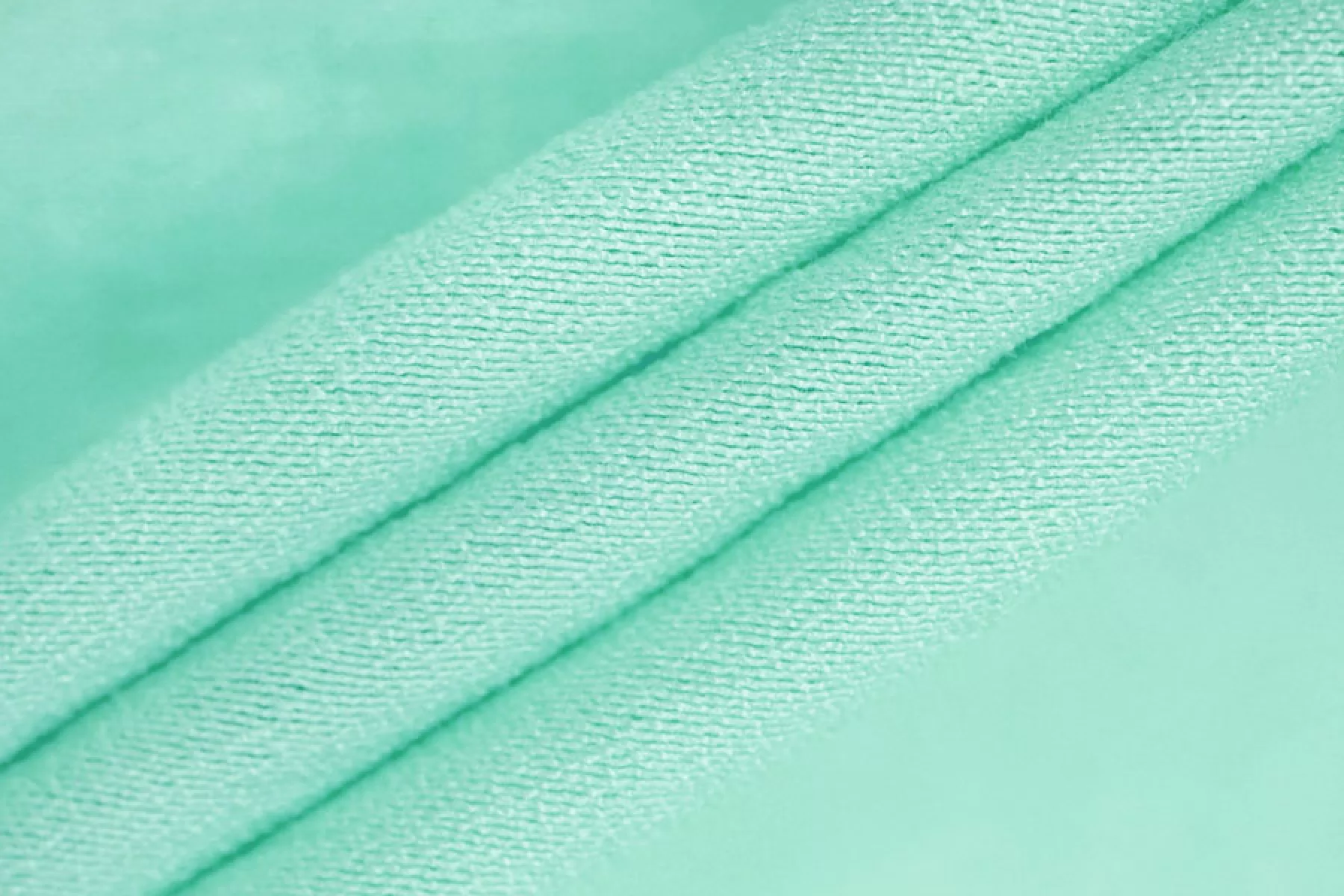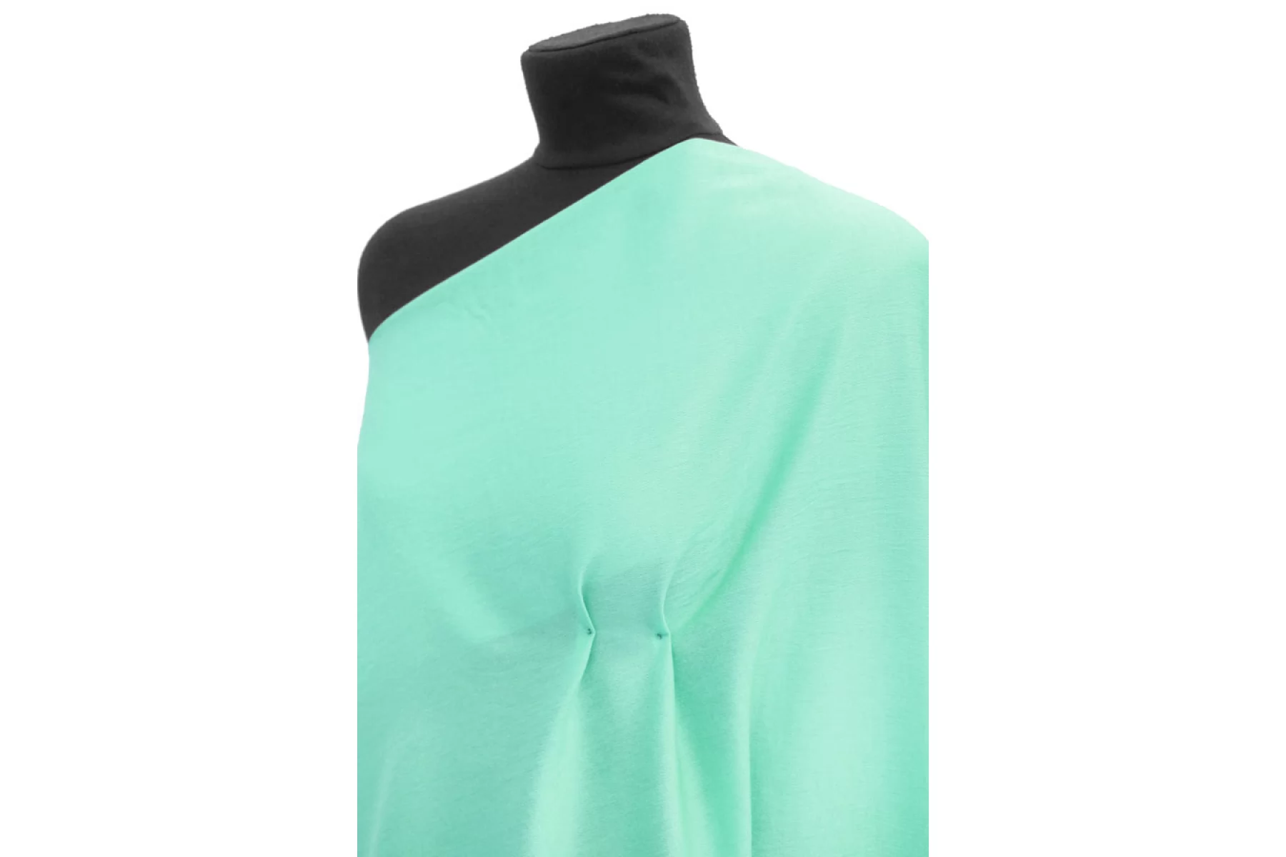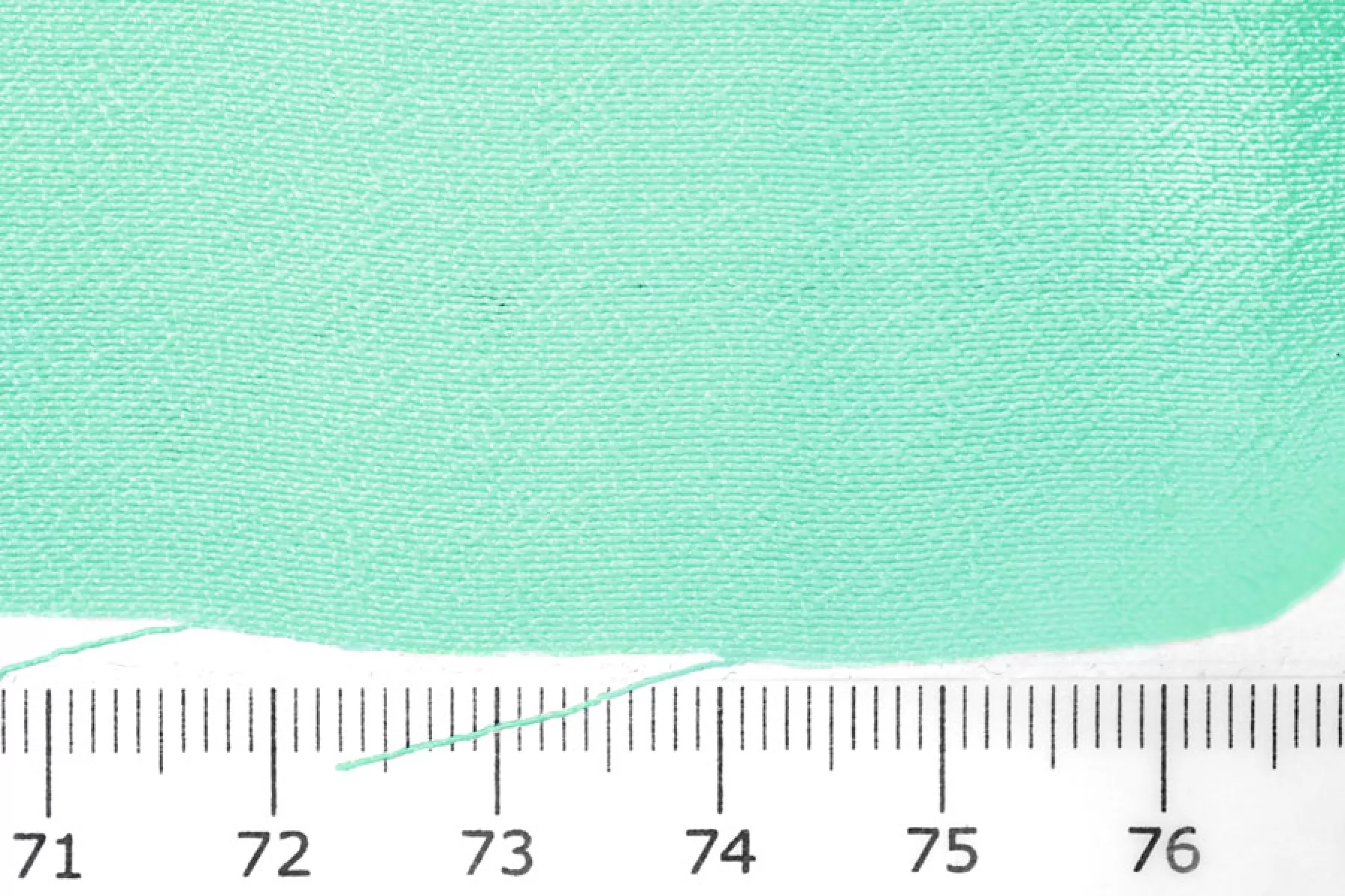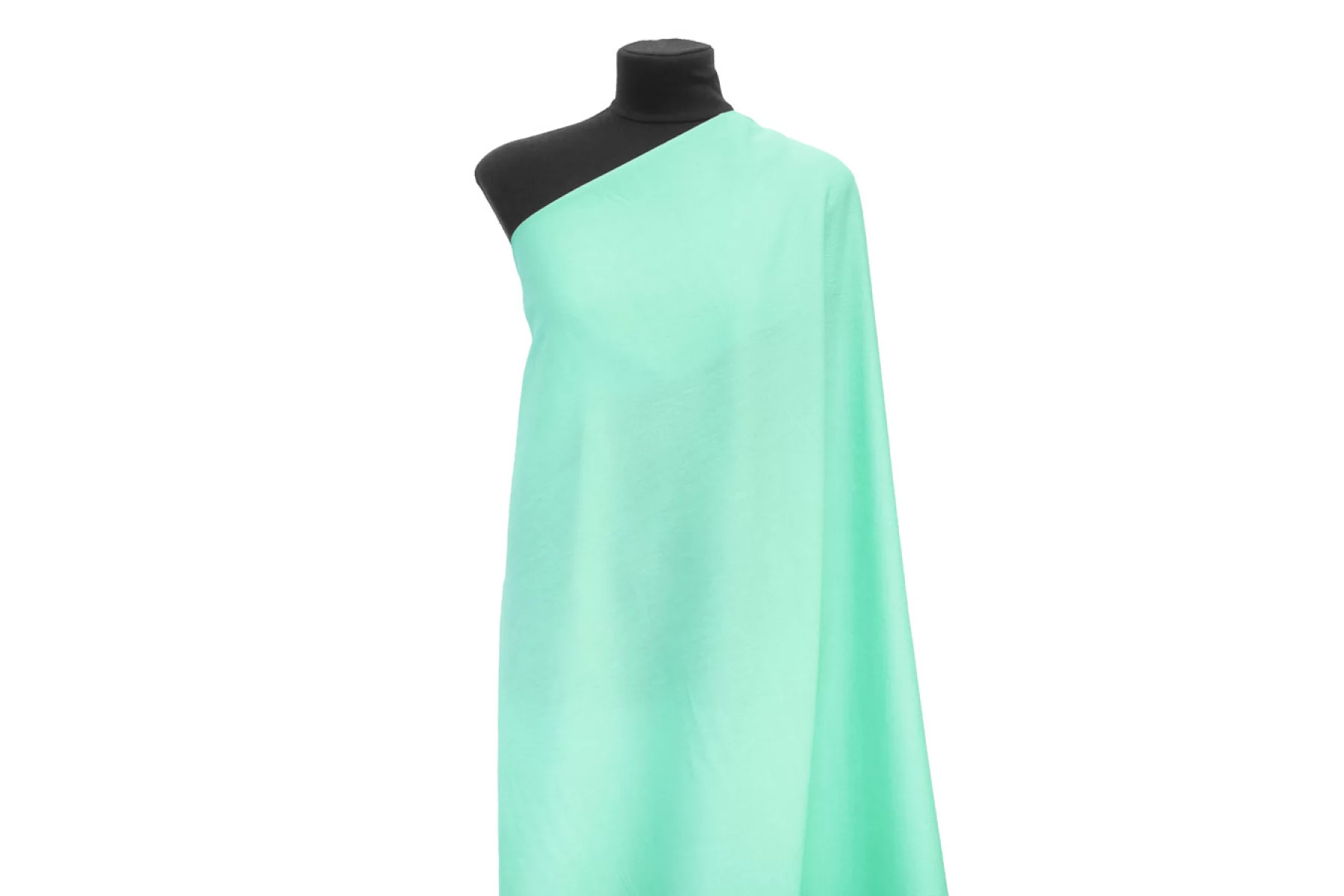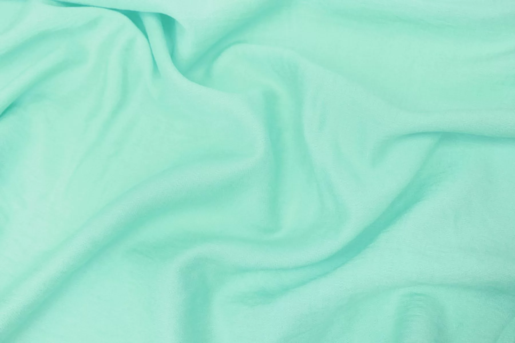 Плательная вискоза мятного оттенка. Тактильно приятная, мягкая, со слегка шероховатой и слегка жатой поверхностью. Обладает красивой пластикой, красива в складках. Форму практически не держит. Немного просвечивает контур силуэта. Не тянется. Несильно сминается. С легким приятным лоском. Прекрасный вариант на платья, блузки, юбки и не только. Обязательно учитывайте возможную усадку 5-10%