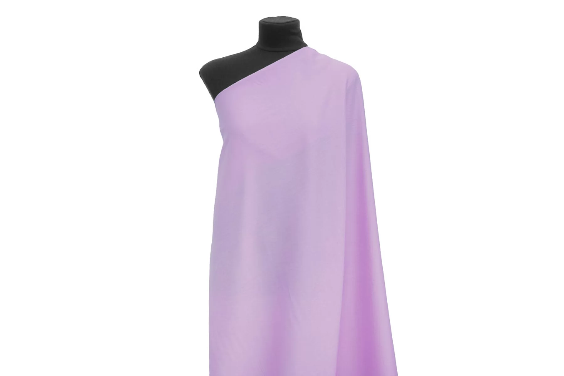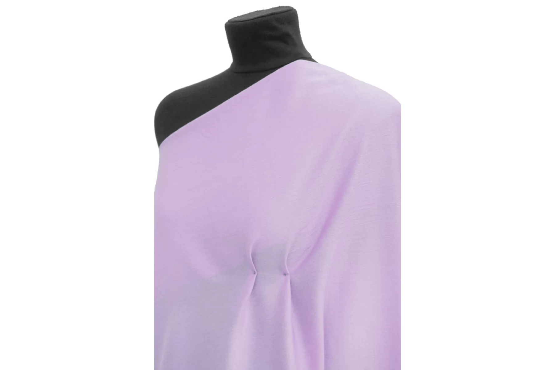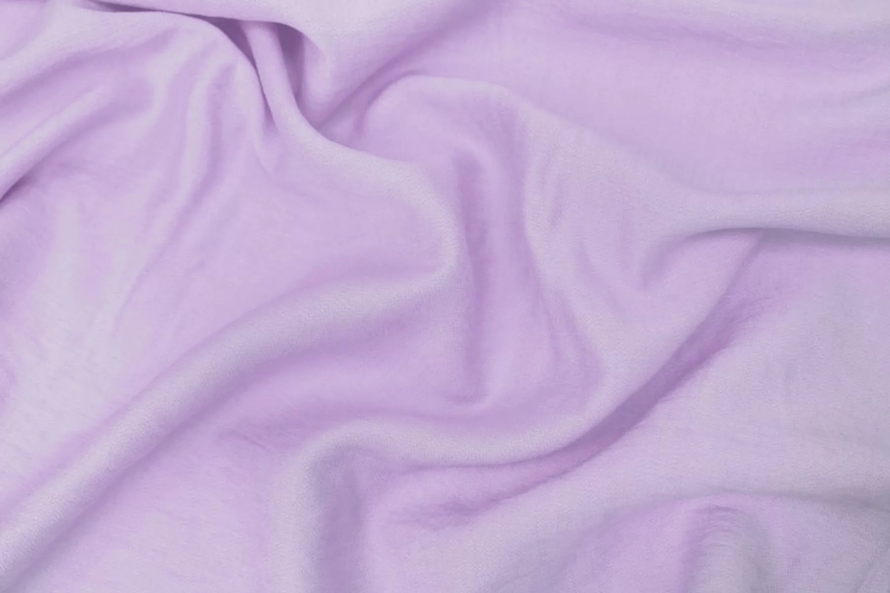 Плательная вискоза лавандового оттенка. Тактильно приятная, мягкая, со слегка шероховатой и слегка жатой поверхностью. Обладает красивой пластикой, красива в складках. Форму практически не держит. Немного просвечивает контур силуэта. Не тянется. Несильно сминается. С легким приятным лоском. Прекрасный вариант на платья, блузки, юбки и не только. Обязательно учитывайте возможную усадку 5-10%