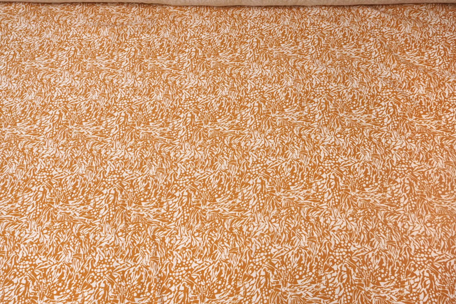 Прекрасная позиция - плательно-блузочная купра оттенка оранжевой охры с абстрактным принтом молочного оттенка. Тонкая, не тянется, просвечивает контур силуэта, если смотреть прямо на просвет. Приятная, мягкая, совсем слегка шероховатая. Обладает прекрасной пластикой. Сминается, но не сильно. Слегка держит форму. Подойдет для пошива платья, юбки, туники, блузки, рубашки. При работе с этой тканью советуем использовать тонкие иглы и нитки.