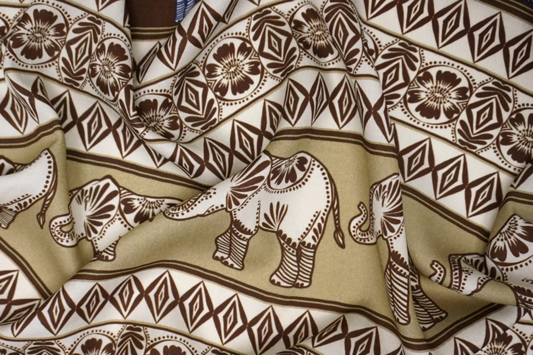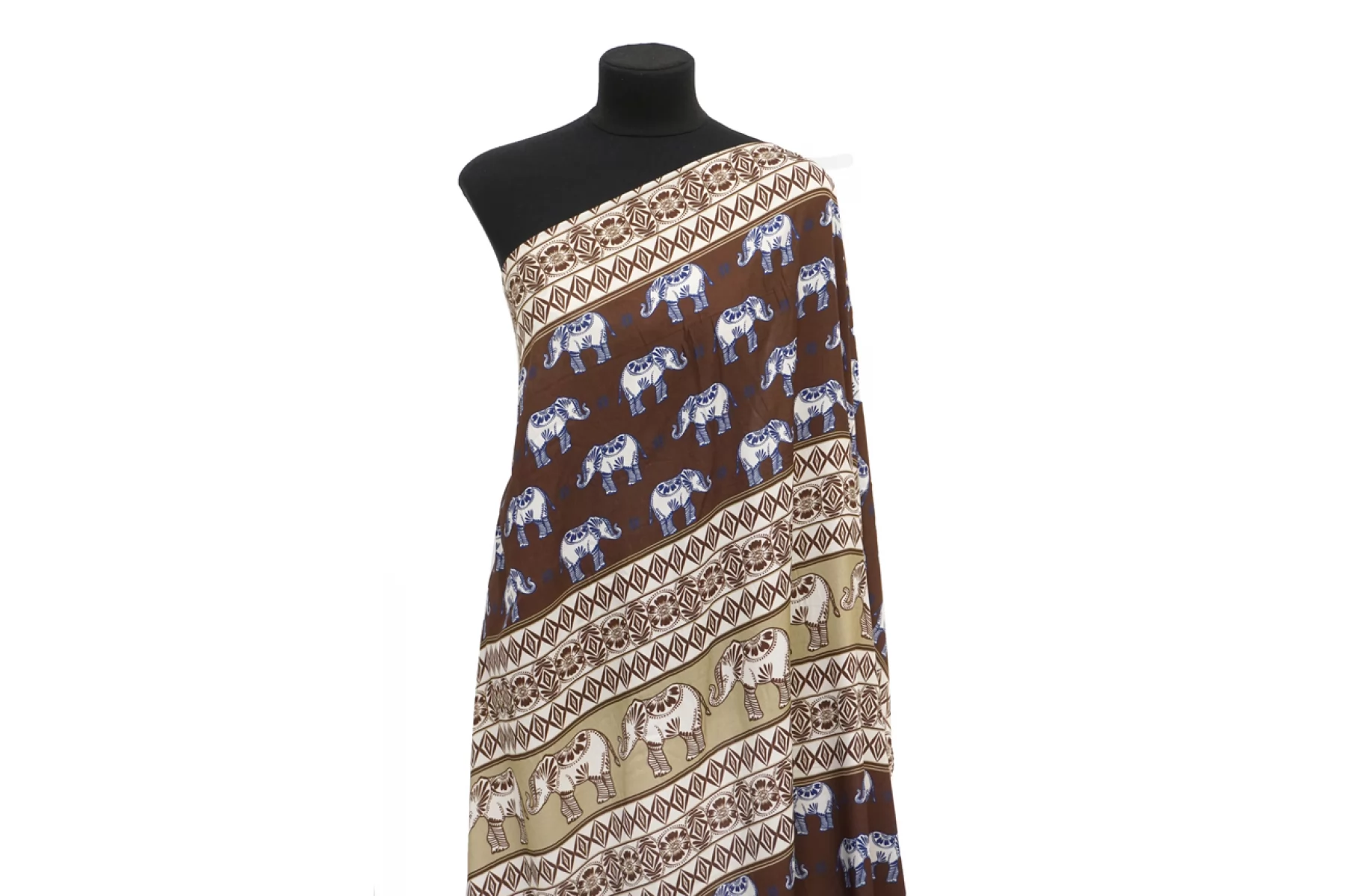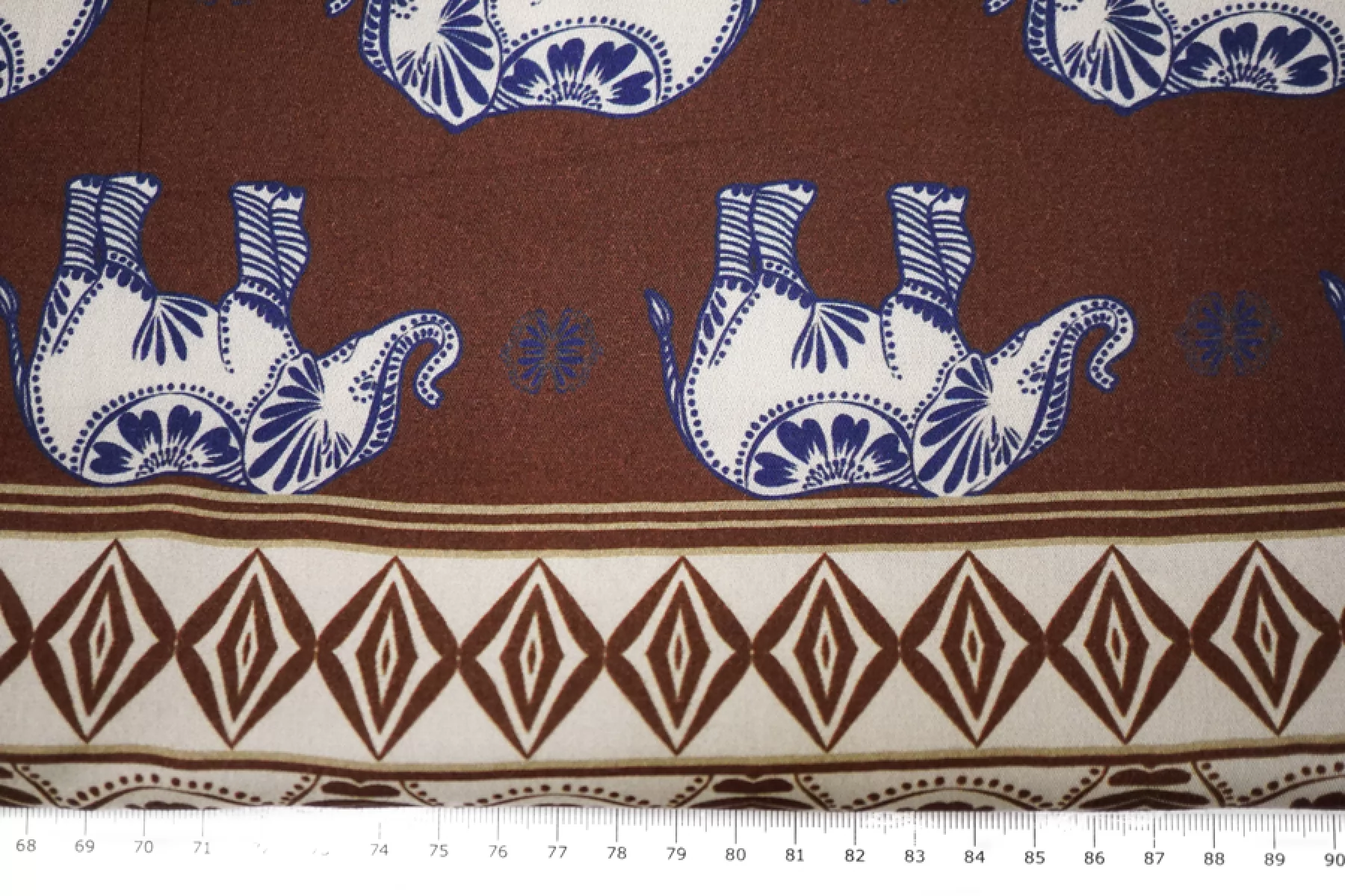ВНИМАНИЕ! Ткань купонная, длина купона 61 см, цена за купон - 909 руб. Очень классная вискоза диагонального плетения, с ориентированным по ширине принтом в виде слонов и орнамента. Цветовая гамма: коричневый, синий, бежевый и молочный. Тактильно приятная, тонкая, мягкая, с красивой пластикой. Просвечивает силуэт, если смотреть прямо на просвет. Обладает легким лоском. Не тянется. Мнется совсем немного. Отличный вариант на платки, платья, блузки и юбки. Обязательно учитывайте возможную усадку порядка 5-10% При необходимости используйте подкладочный материал.