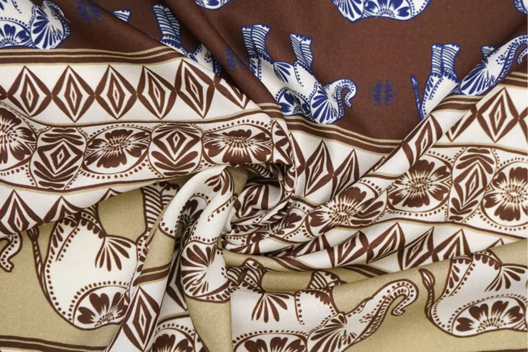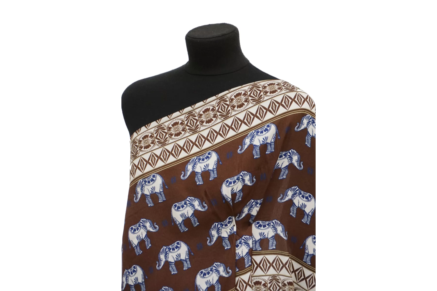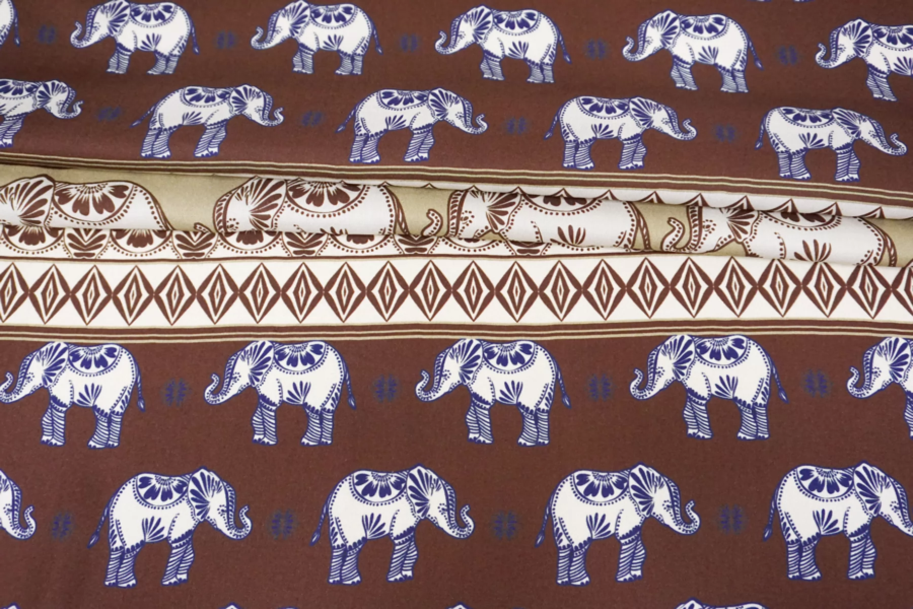 ВНИМАНИЕ! Ткань купонная, длина купона 61 см, цена за купон - 909 руб. Очень классная вискоза диагонального плетения, с ориентированным по ширине принтом в виде слонов и орнамента. Цветовая гамма: коричневый, синий, бежевый и молочный. Тактильно приятная, тонкая, мягкая, с красивой пластикой. Просвечивает силуэт, если смотреть прямо на просвет. Обладает легким лоском. Не тянется. Мнется совсем немного. Отличный вариант на платки, платья, блузки и юбки. Обязательно учитывайте возможную усадку порядка 5-10% При необходимости используйте подкладочный материал.