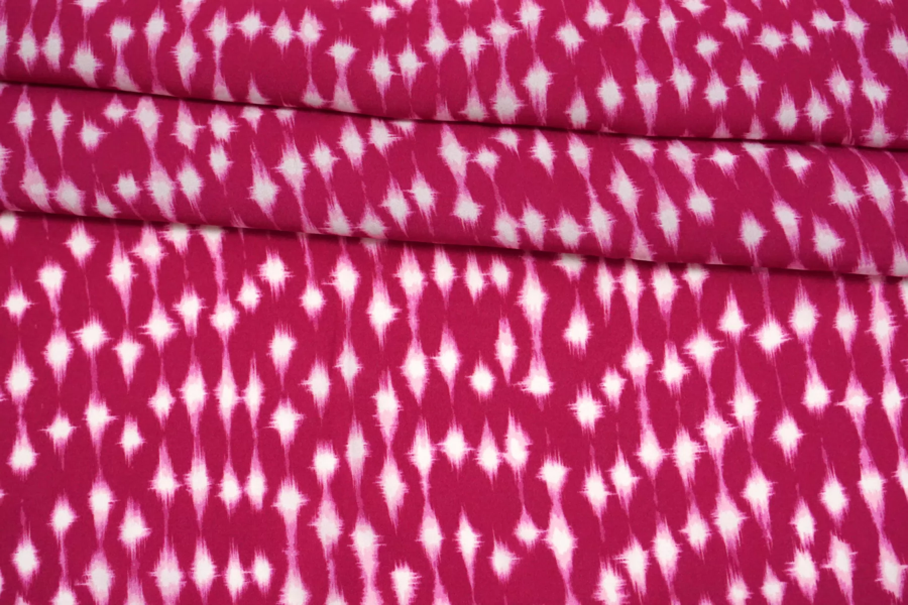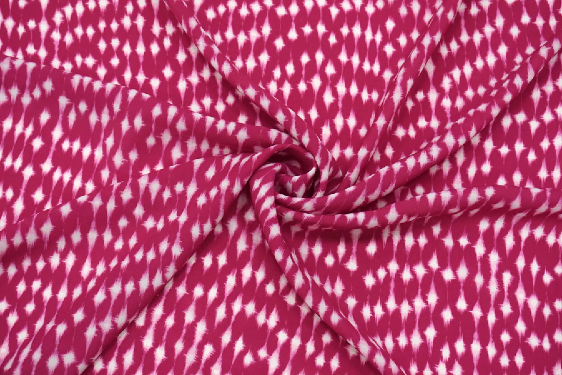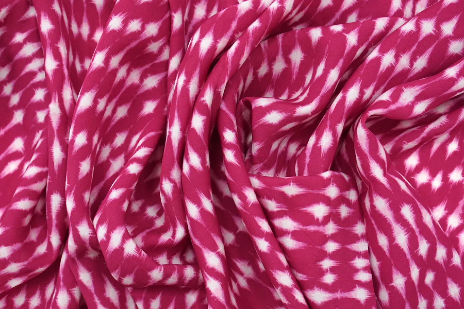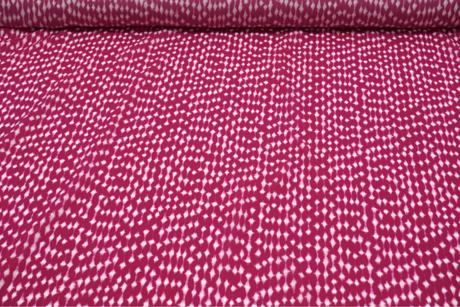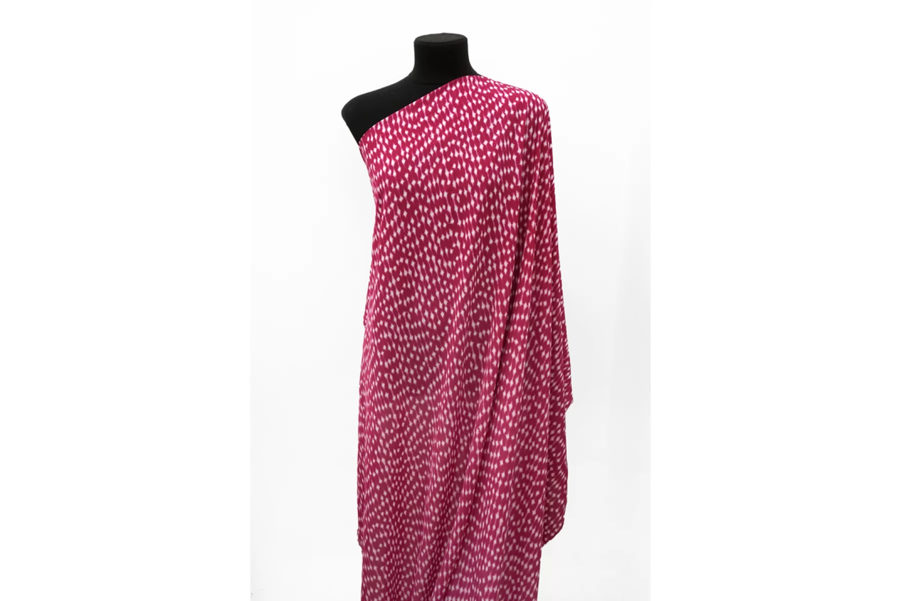 Итальянская плательная вискоза с орнаментальным принтом на темно-розовом фоне. Тонкая, пластичная, не тянется, немного просвечивает, имеет легкий блеск. Подойдет для пошива платья, юбки, туники, блузки, рубашки. При работе с этой тканью советуем использовать тонкие иглы и нитки.
