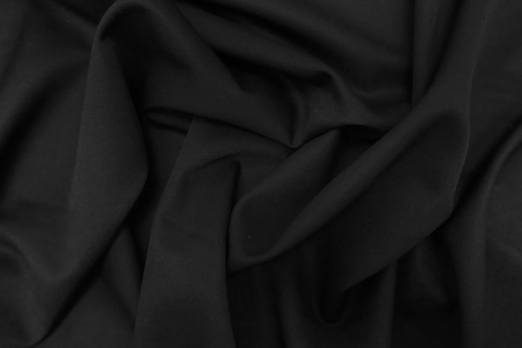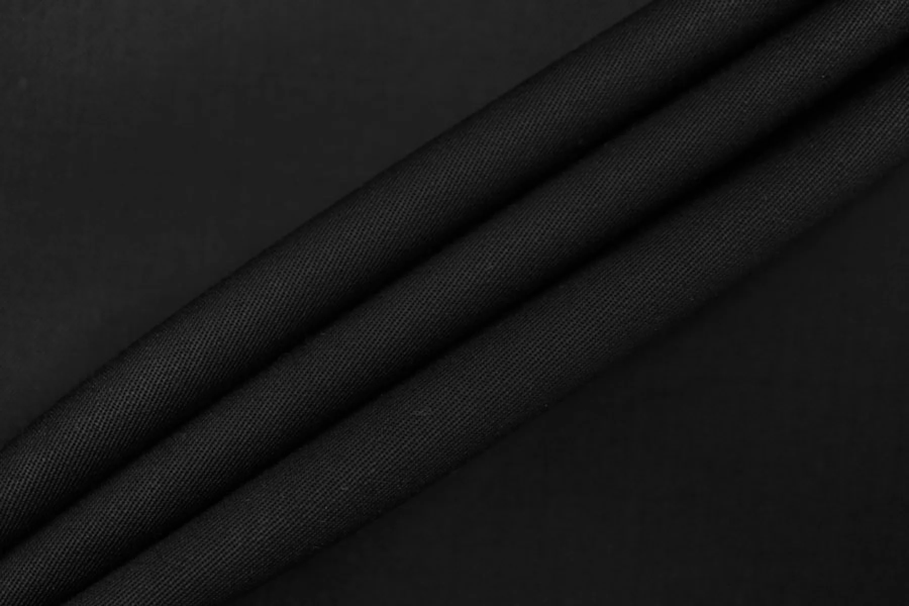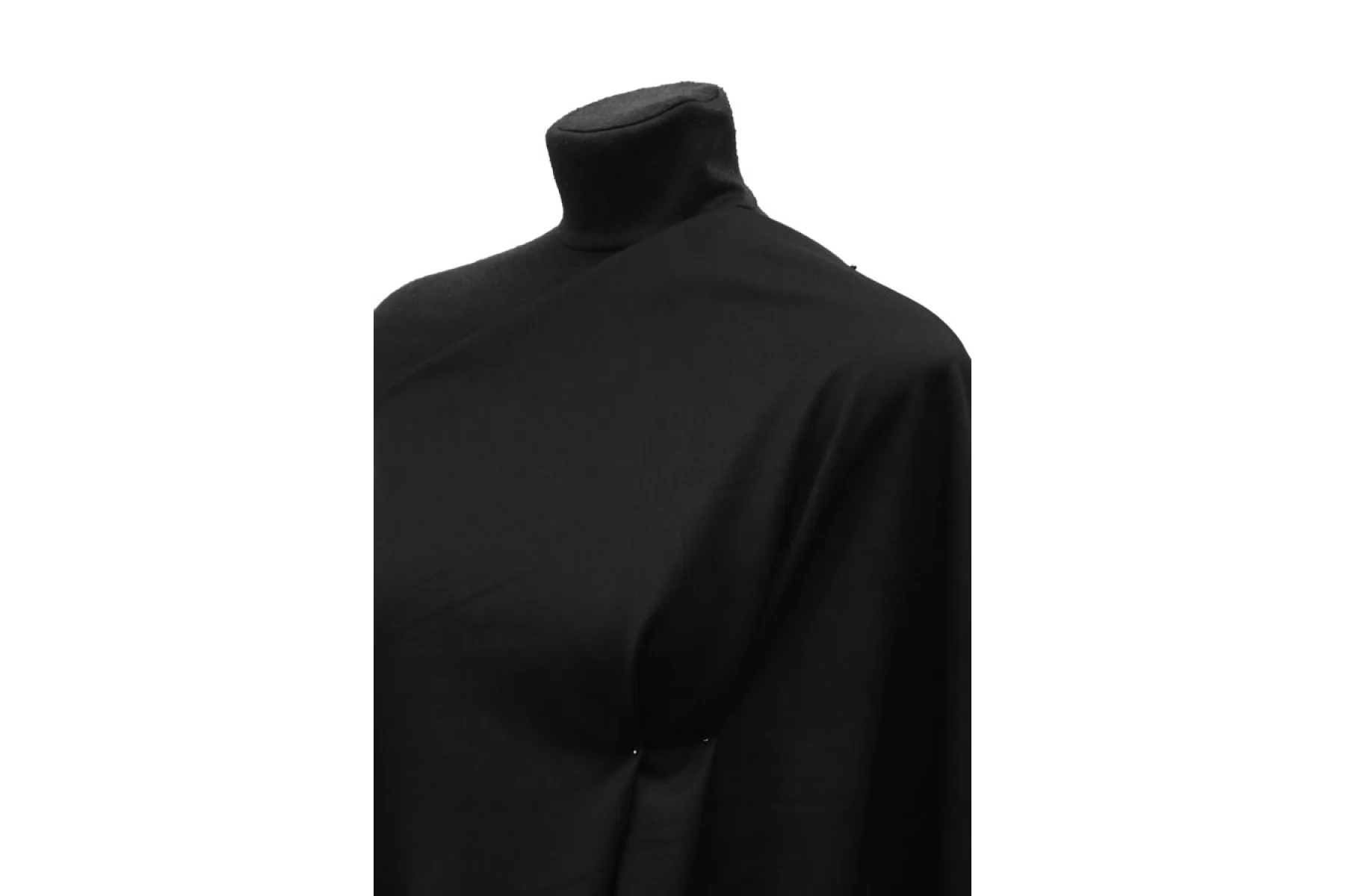 Прекрасная итальянская шерсть качества virgin плательно-костюмной плотности в классическом черном цвете. Плетение диагональное. Приятная, мягкая, гладкая наощупь. Практически не колется. Ткань тонкая, но при это плотная Материал имеет красивый блеск. Слегка пружинит плетение. Очень красива в складках и в своей пластике. Не мнется! Идеальный вариант на классические теплые костюмы, брюки, платья, юбки, мягкие жакеты. Уход деликатный