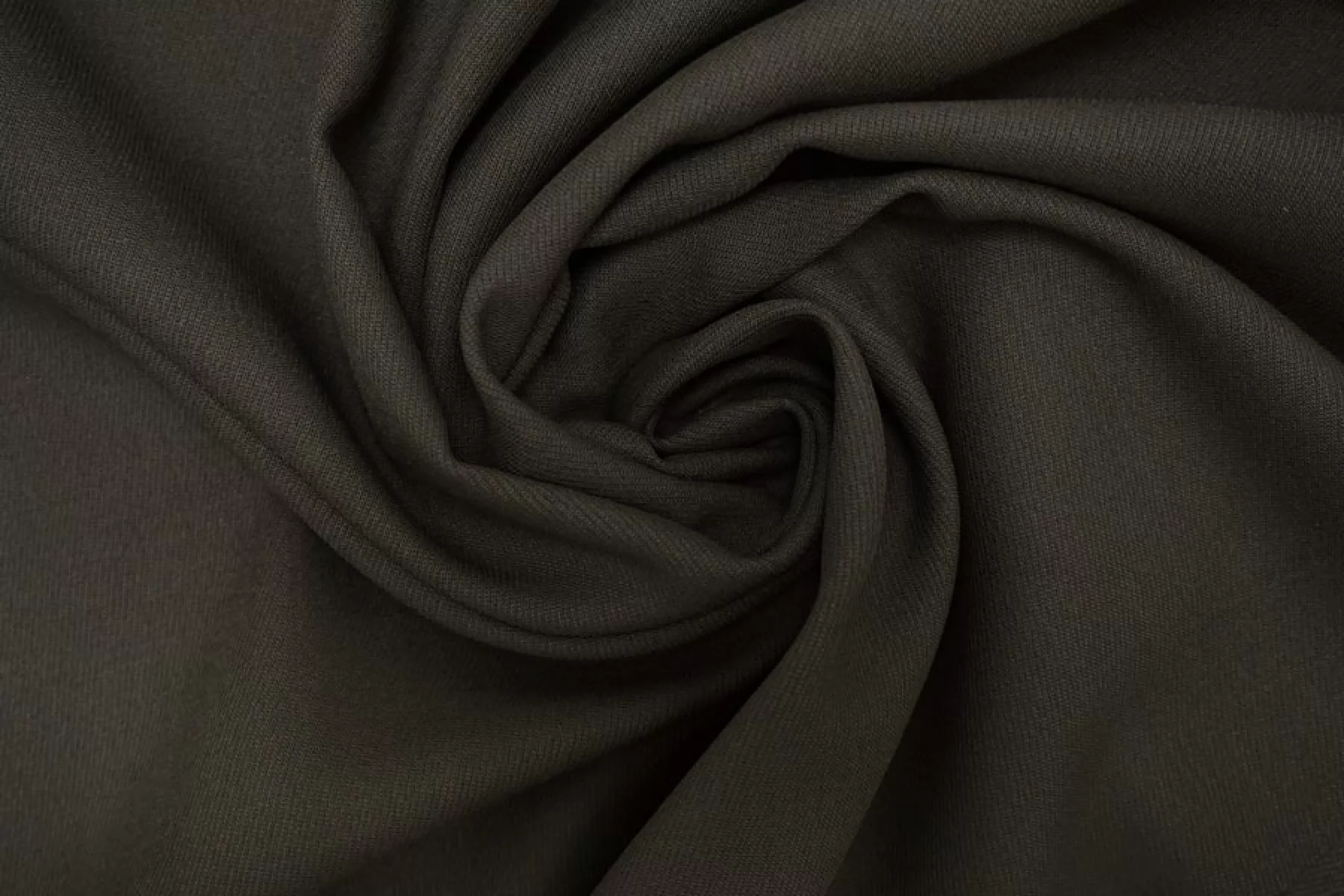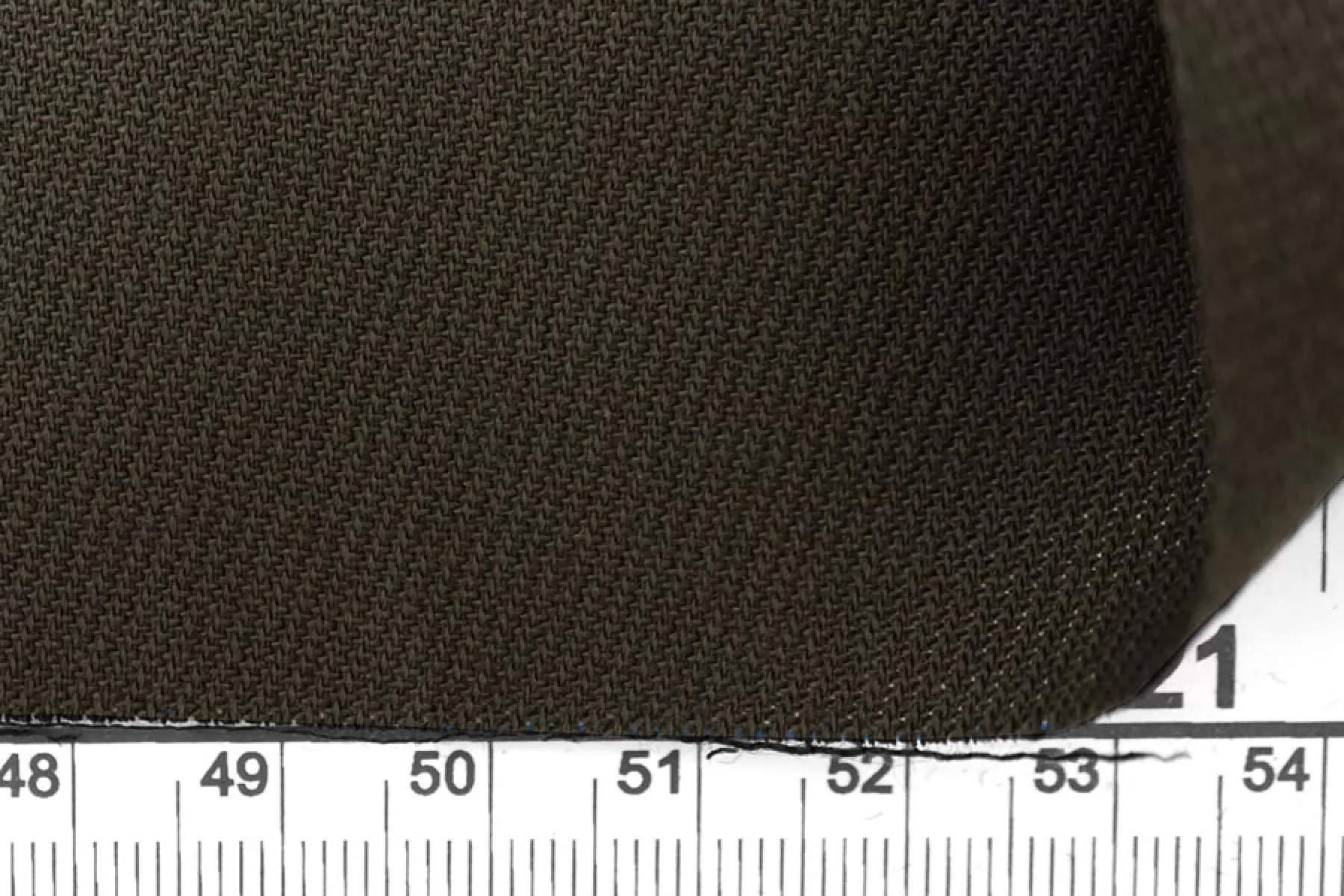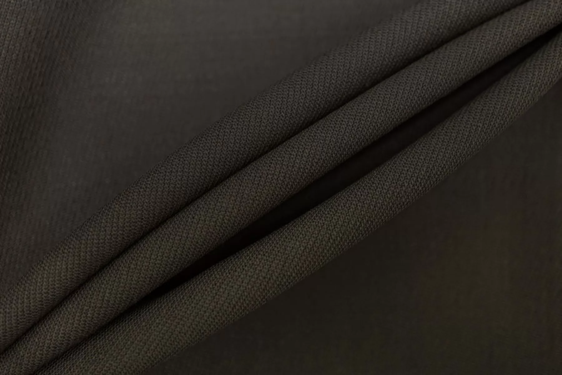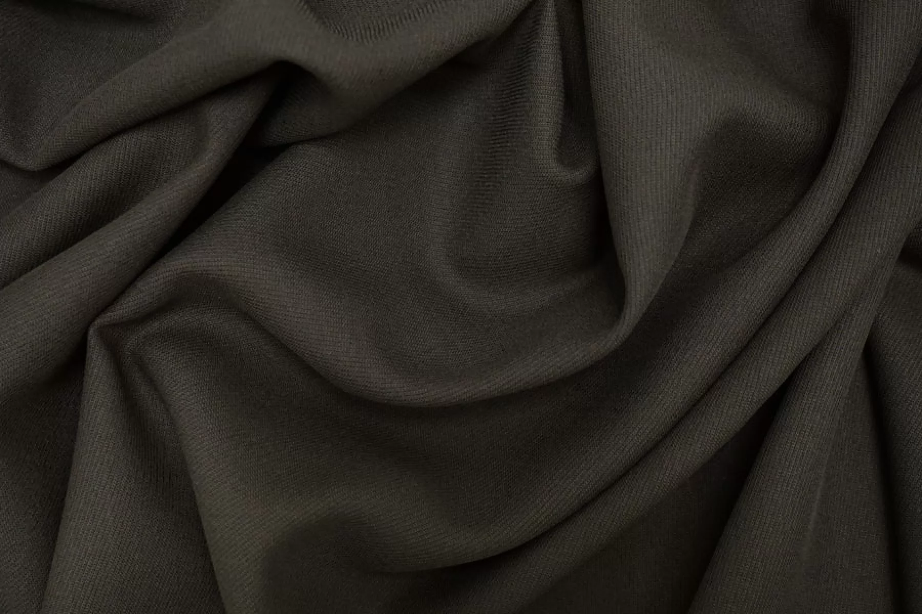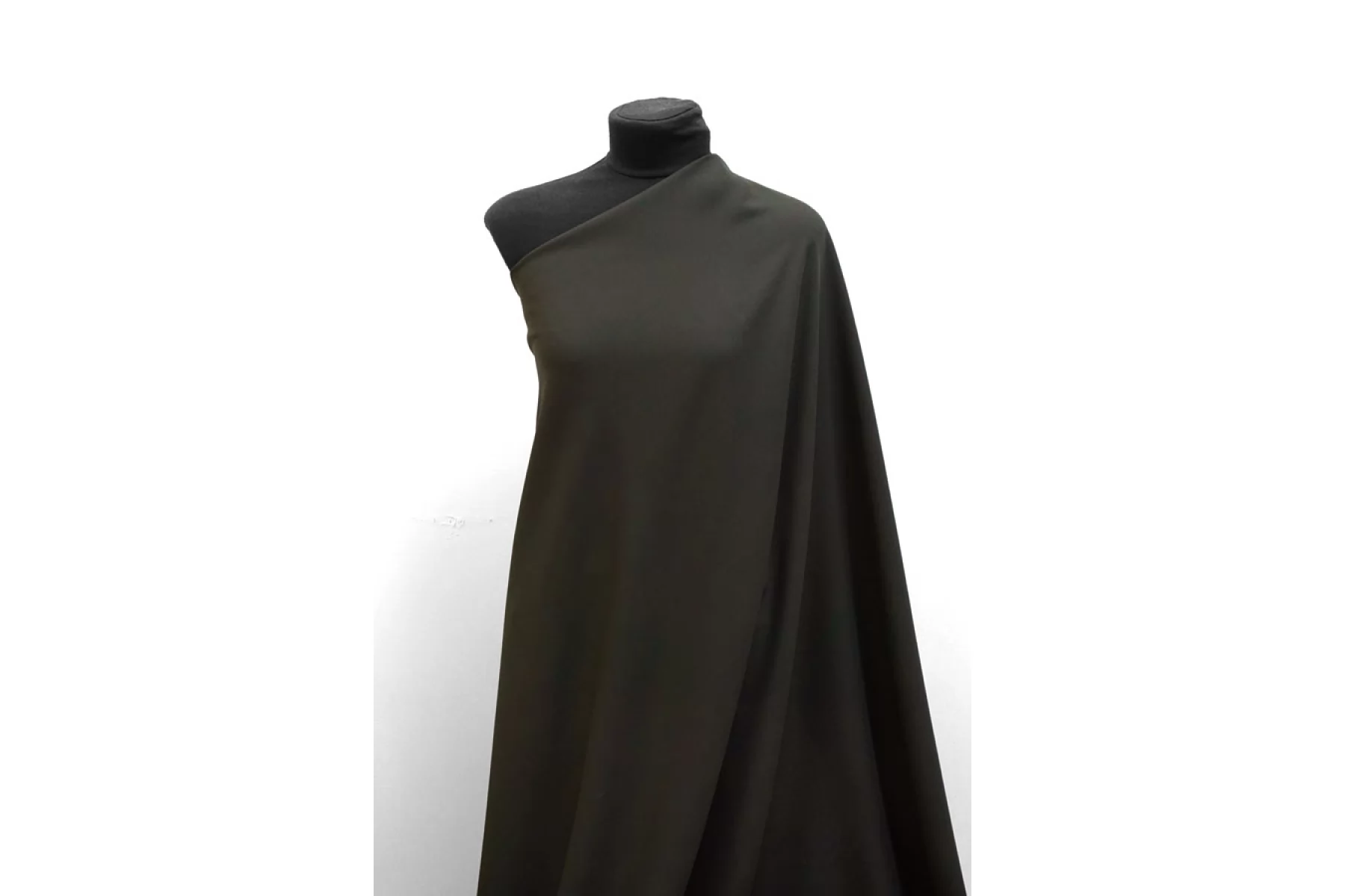 Костюмно-плательная шерсть качества выраженного диагонального плетения в темном оттенке хаки. Тактильно мягкая, креповая, пластичная, тонкая, плетение не плотное, немного просвечивает. Немного колется. Обладает очень легким приятным лоском. Не тянется. Хорошо драпируется и немного держит форму. Прекрасный вариант на костюмные варианты, платья, юбки. Уход деликатный.