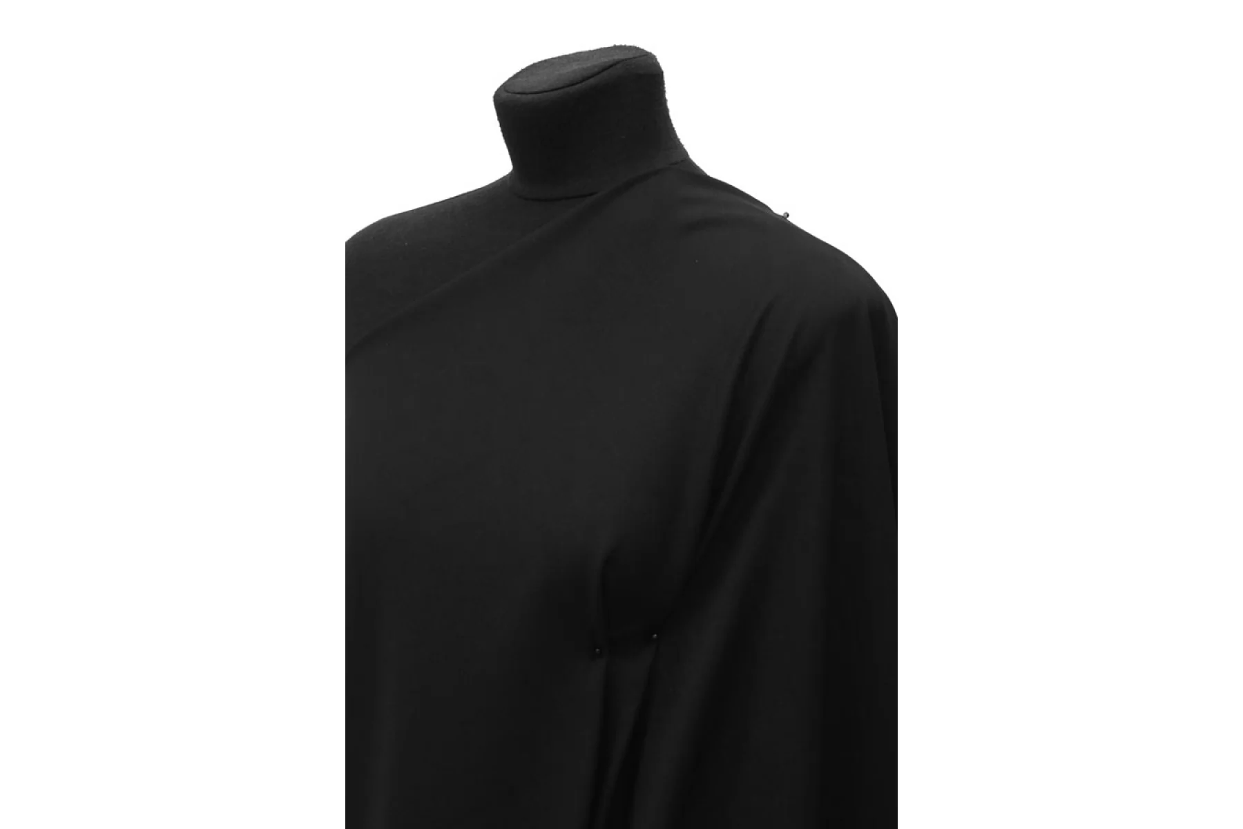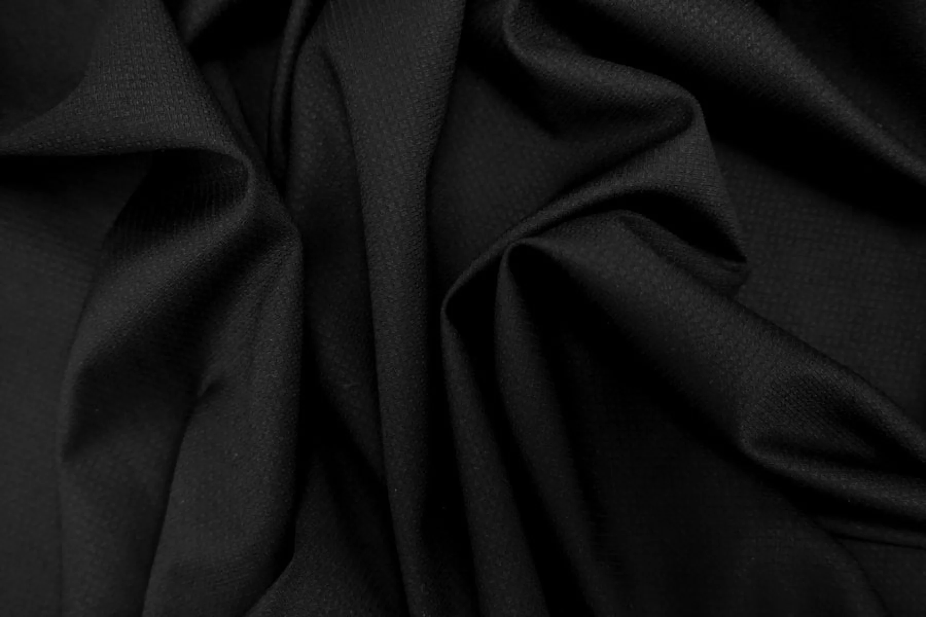 Костюмно-плательная вирджинская шерсть чёрного цвета с жаккардовой выработкой в виде ромбов. Пластичная, но при этом держит форму. Не мнется, не колется. Тянется. Подойдет для пошива жакета мягкой формы, зимней рубашки, брюк, юбки, и платья. При необходимости используйте подкладочный материал. Уход за шерстью деликатный.