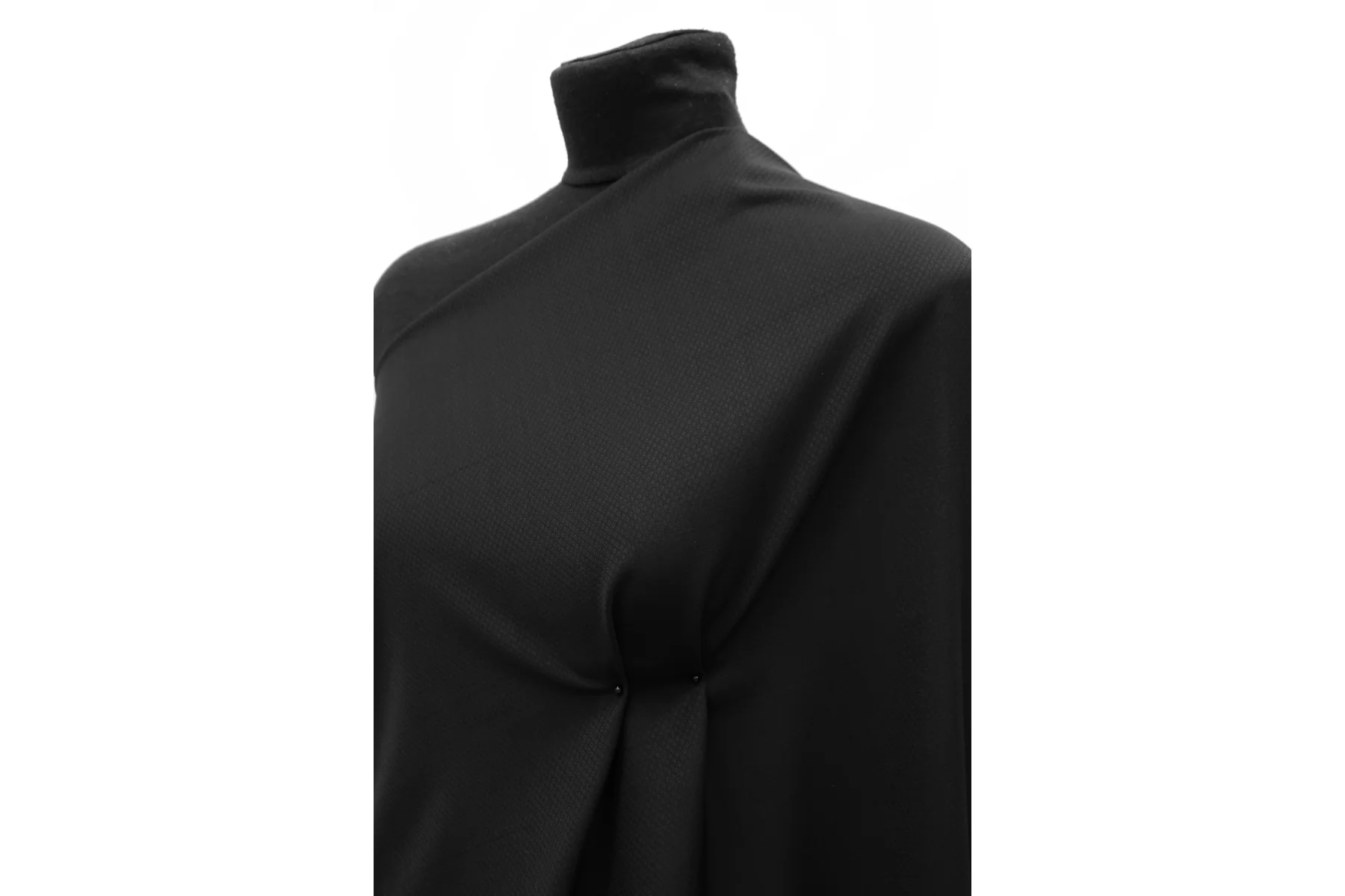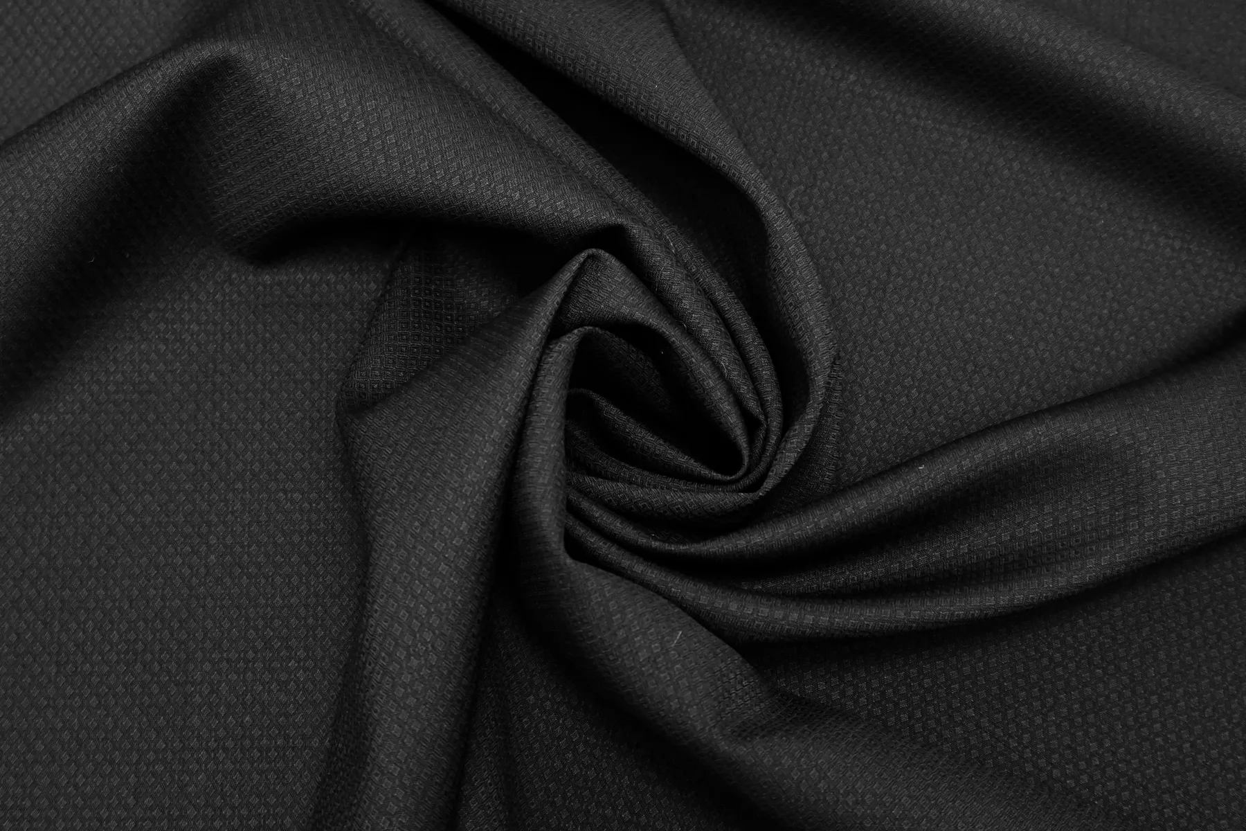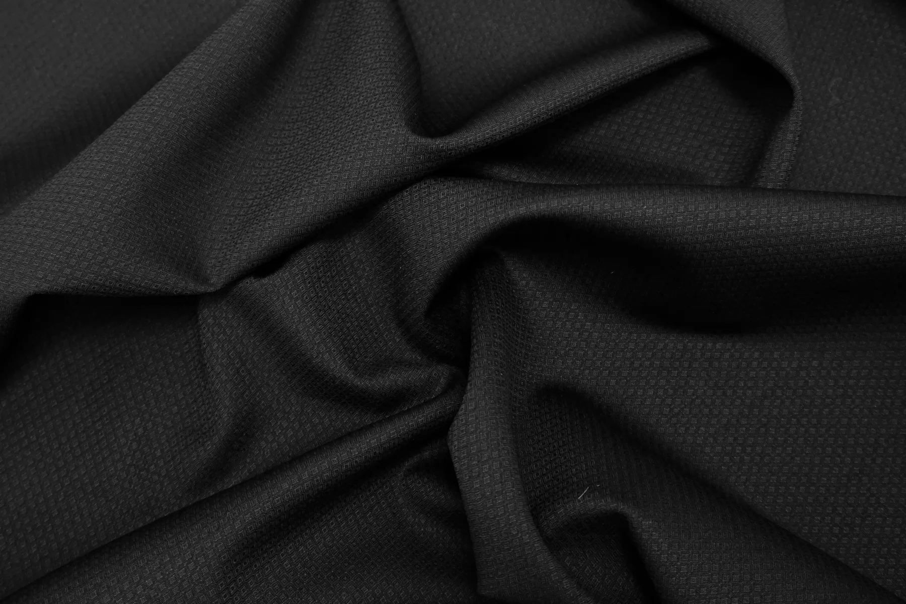 Тонкая плательно-костюмная шерсть чёрного цвета с жаккардовой выработкой в виде ромбов. Слегка просвечивает силуэт на просвет. Пластичная, немного держит форму. Не мнется, не колется, слегка шуршит. Слегка тянется-пружинит благодаря плетению. Подойдет для пошива жакета мягкой формы, зимней рубашки, брюк, юбки, и платья. При необходимости используйте подкладочный материал. Уход за шерстью деликатный.