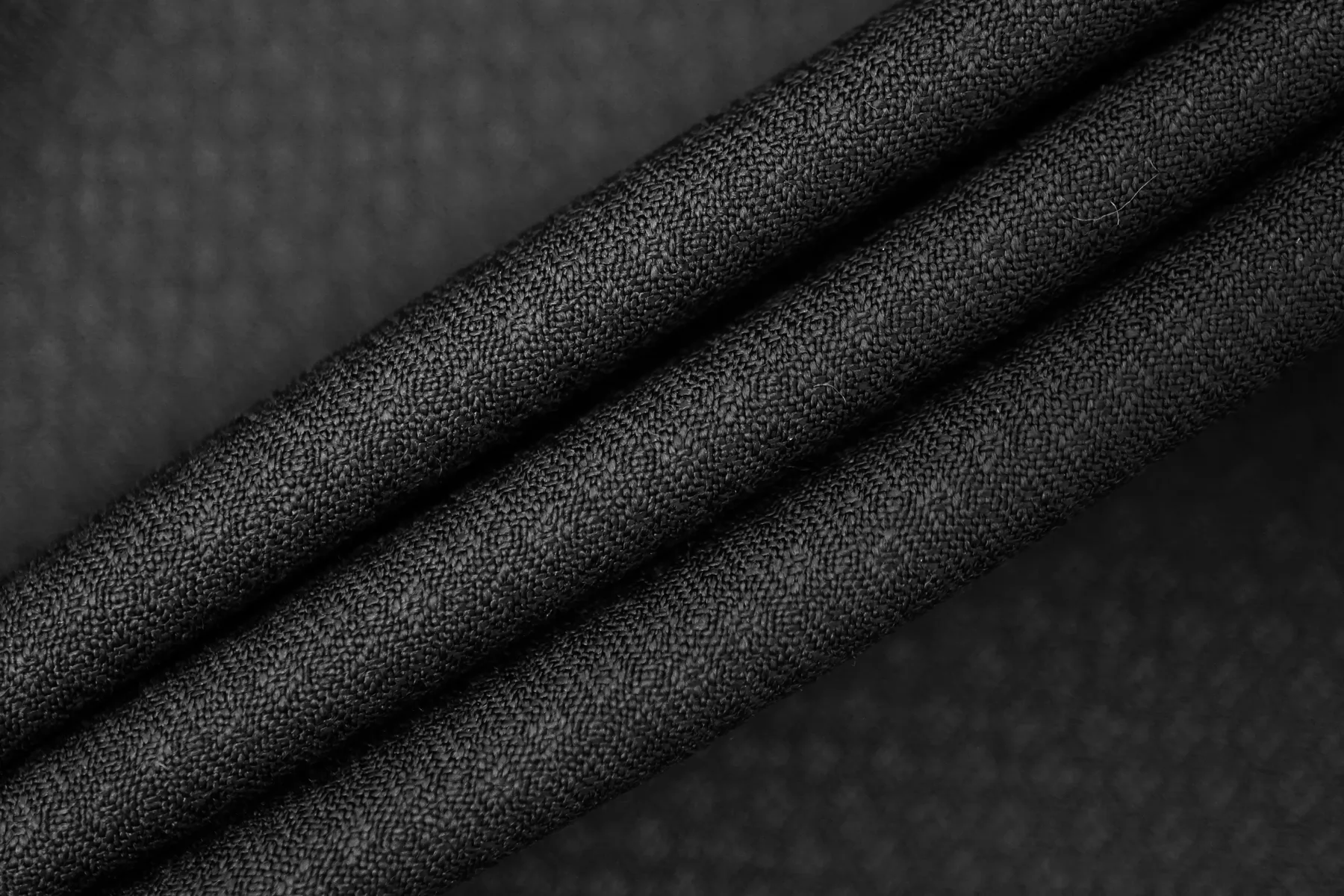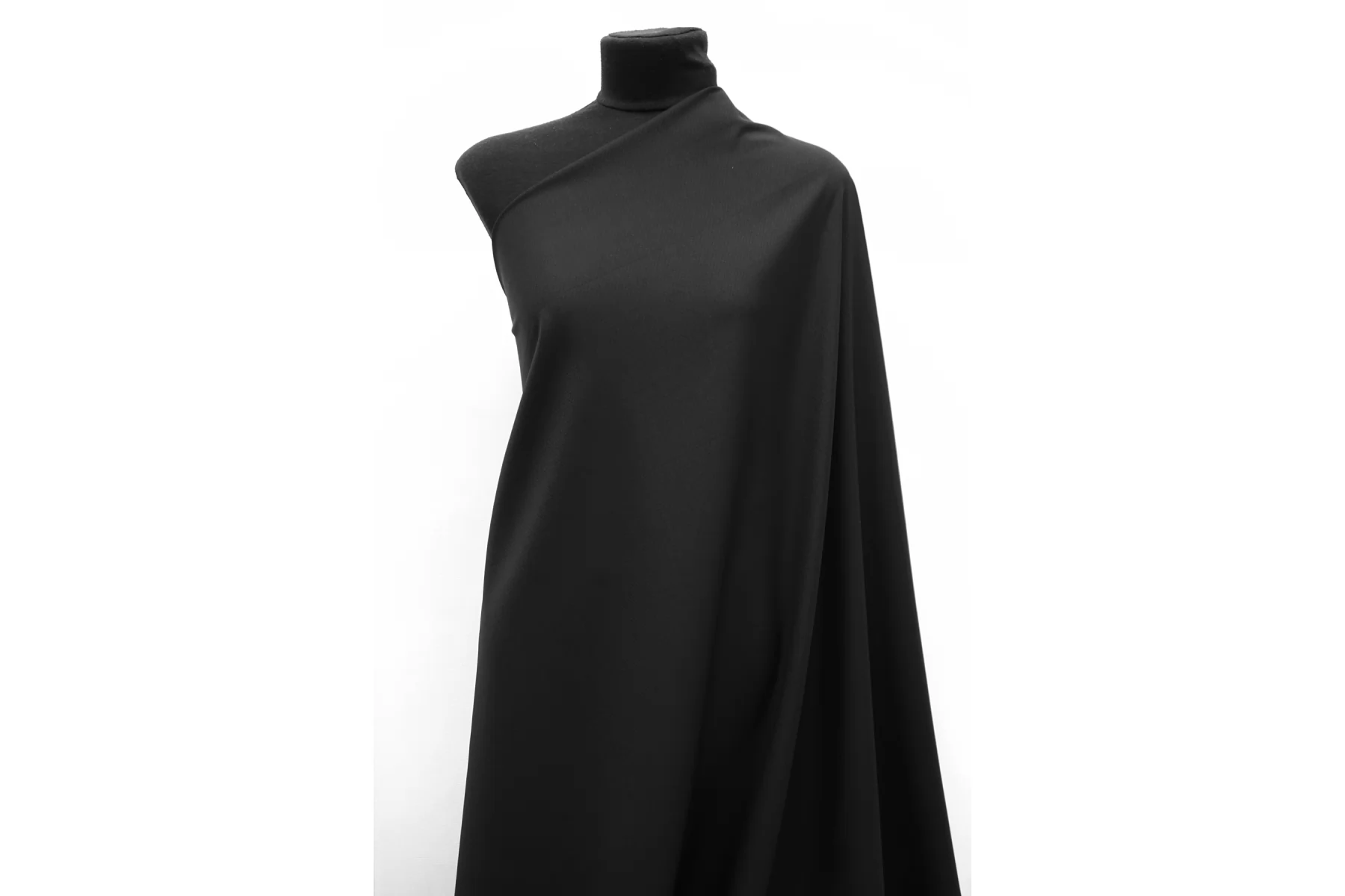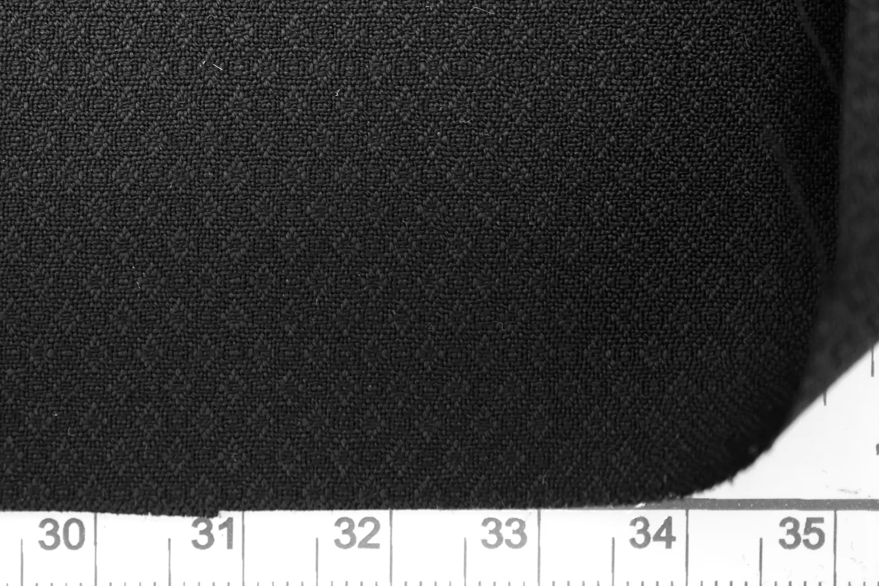Тонкая плательно-костюмная шерсть чёрного цвета с жаккардовой выработкой в виде ромбов. Слегка просвечивает силуэт на просвет. Пластичная, немного держит форму. Не мнется, не колется, слегка шуршит. Слегка тянется-пружинит благодаря плетению. Подойдет для пошива жакета мягкой формы, зимней рубашки, брюк, юбки, и платья. При необходимости используйте подкладочный материал. Уход за шерстью деликатный.