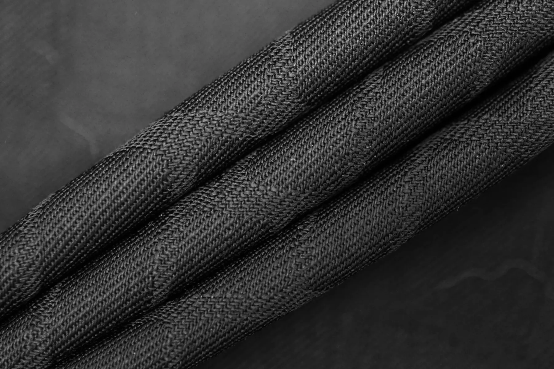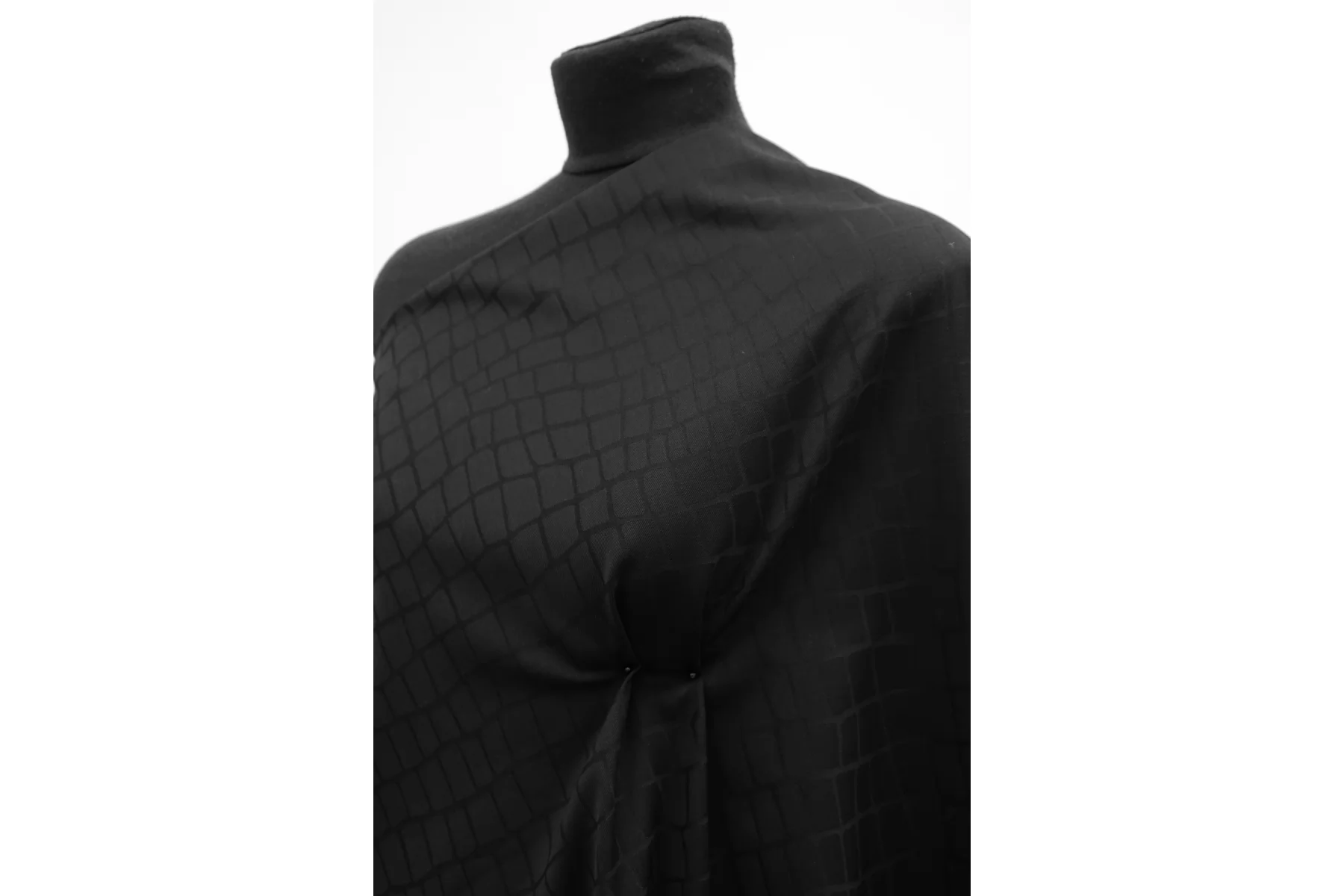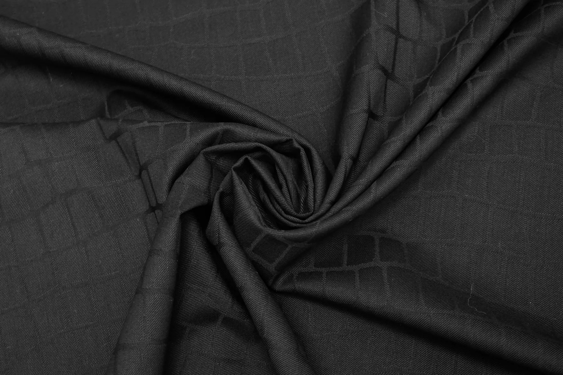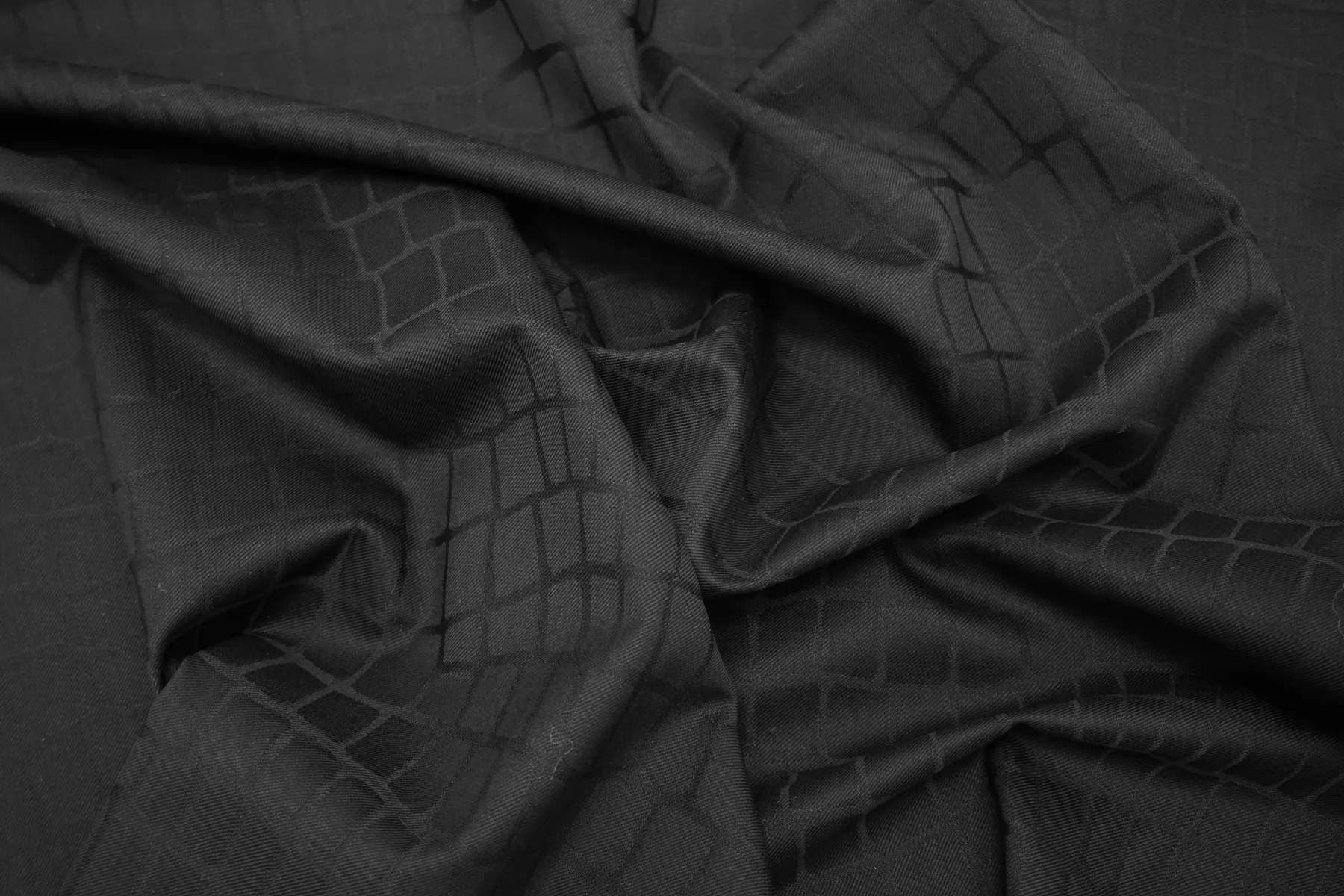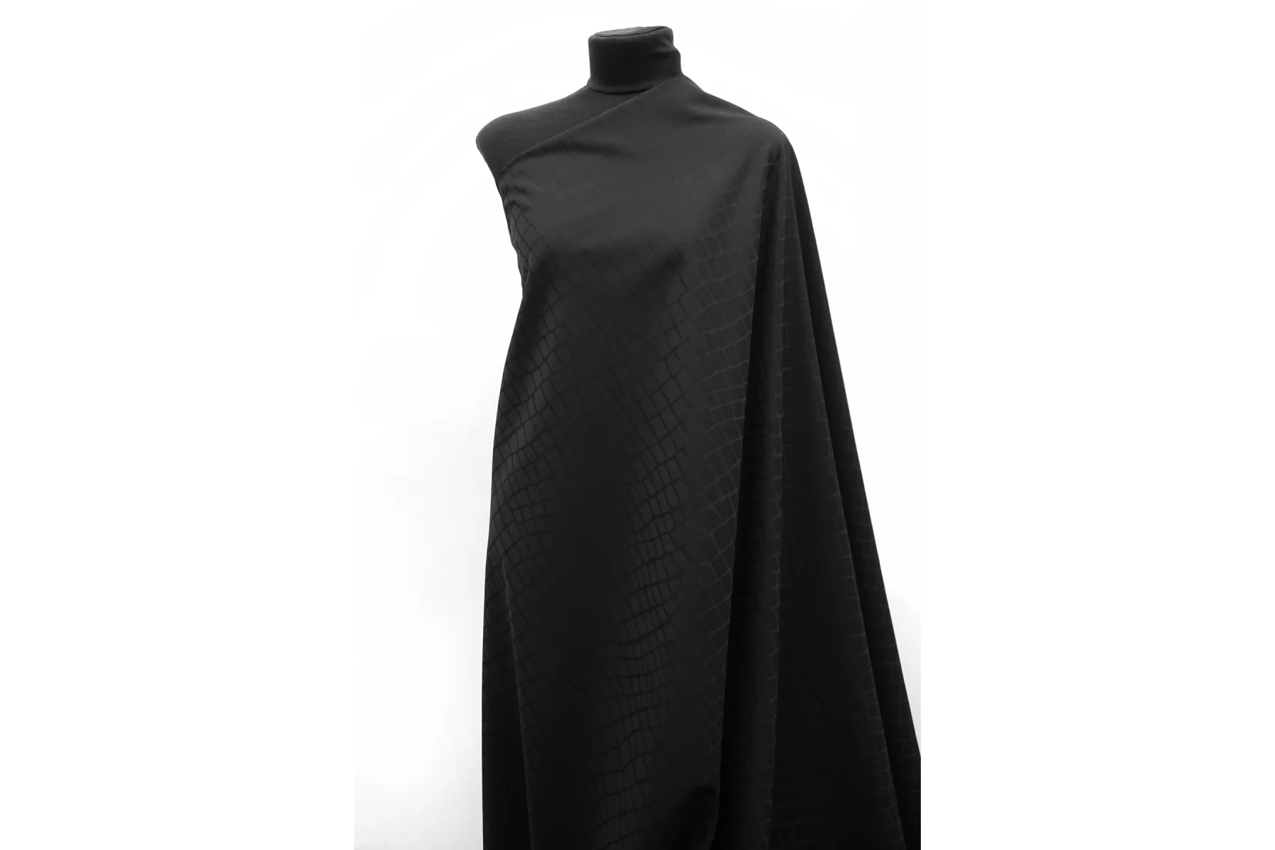 Тонкая плательно-костюмная шерсть чёрного цвета с жаккардовой выработкой, напоминающей кожу крокодила (неровные квадраты). Слегка просвечивает силуэт на просвет. Пластичная, немного держит форму. Не мнется, слегка колется, слегка шуршит. Не тянется. Подойдет для пошива жакета мягкой формы, зимней рубашки, брюк, юбки, и платья. При необходимости используйте подкладочный материал. Уход за шерстью деликатный.