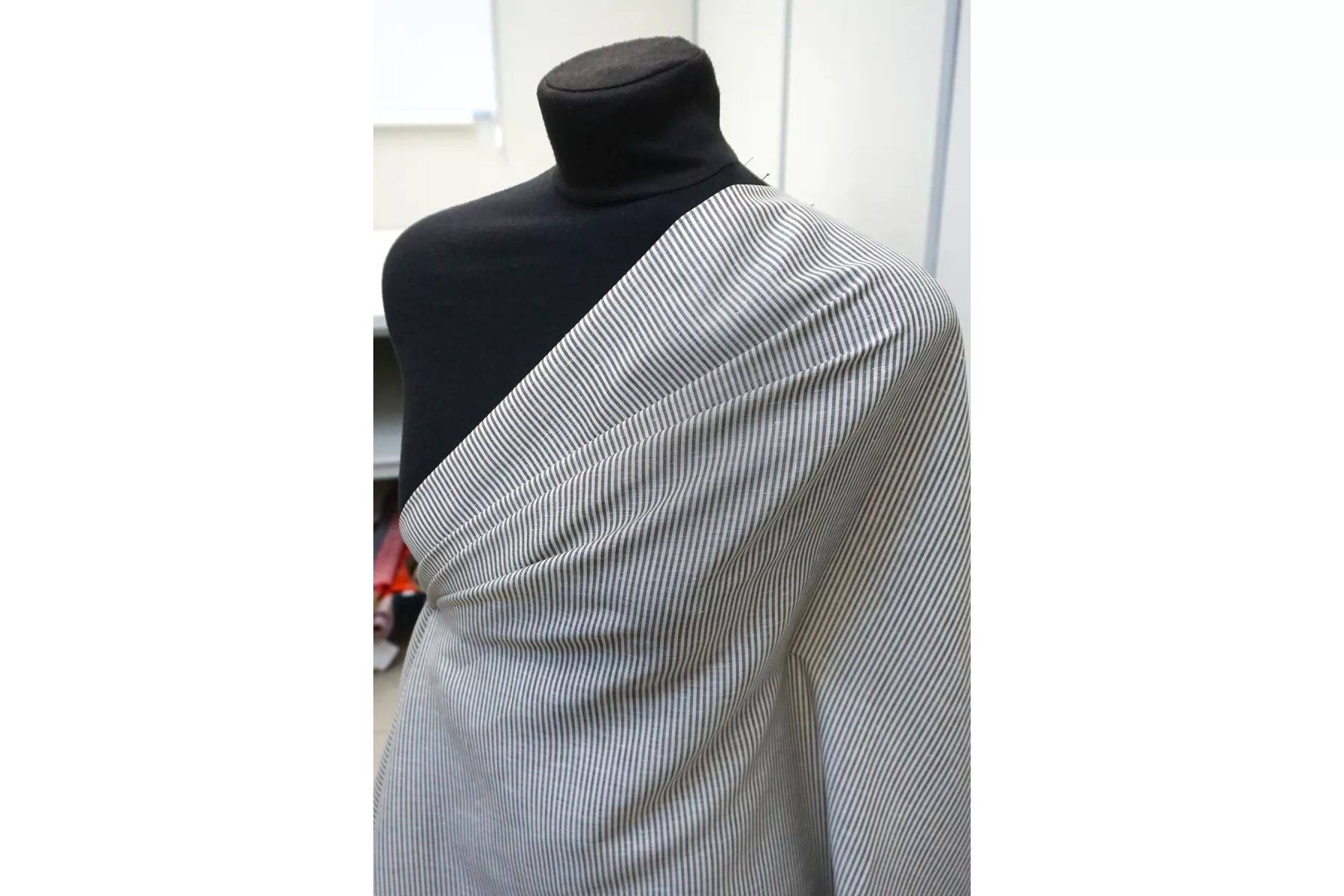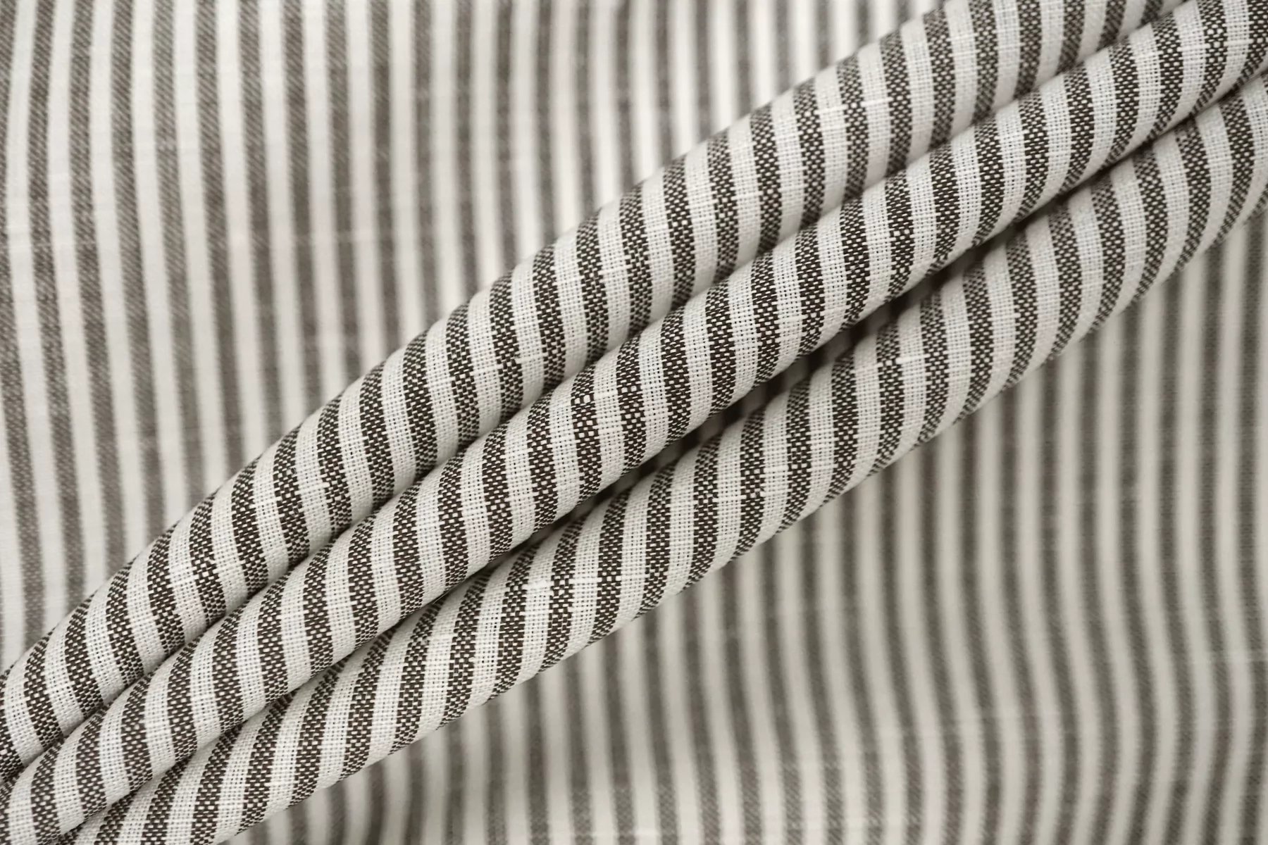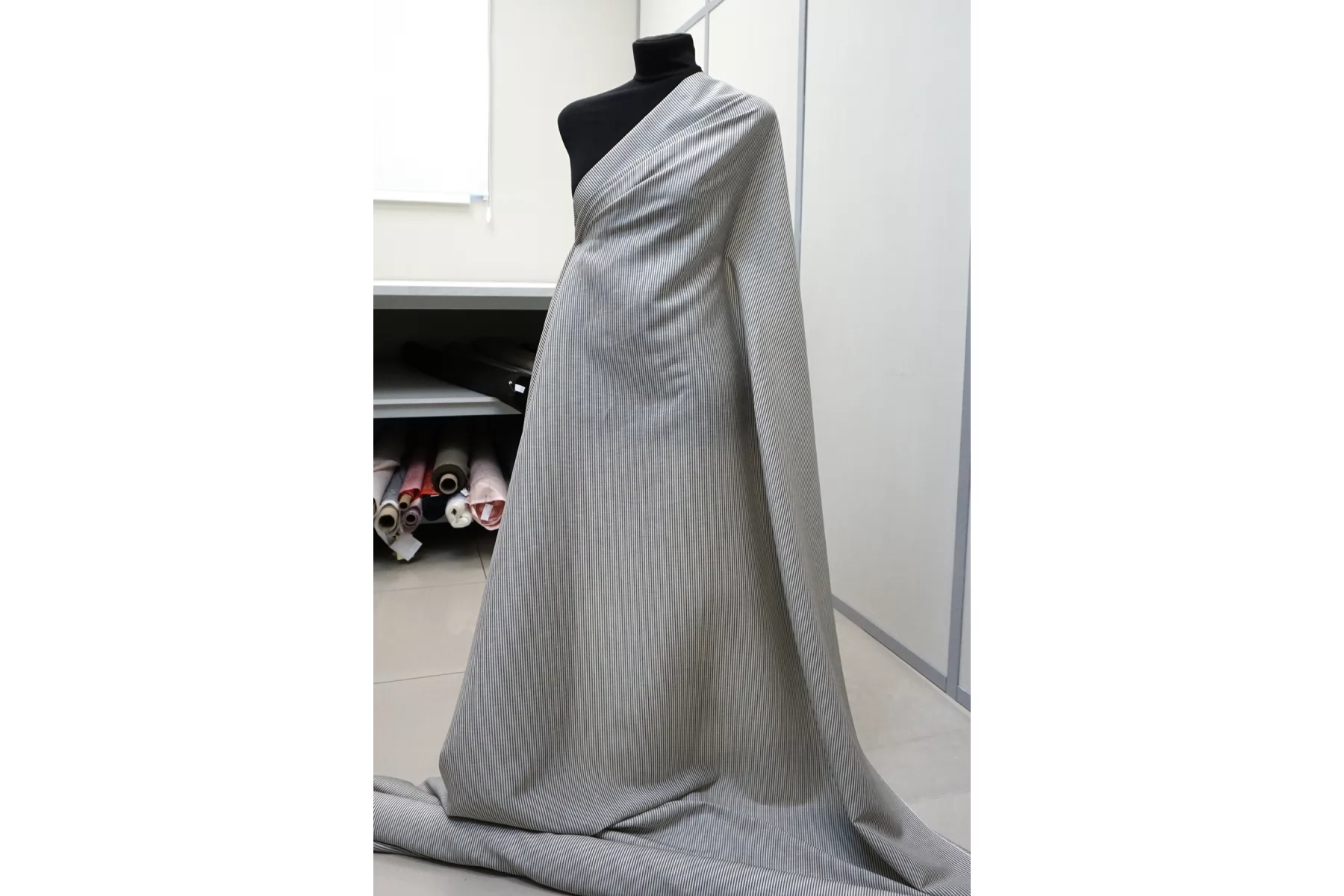 Прекрасная плательно-рубашечная вирджинская шерсть с добавлением льна с узором-полоской, нити молочно-белого и коричневого цвета. Тактильно гладкая, достаточно тонкая. Чувствуется, что шерсть, чувствительной коже может слегка колоться. Не тянется, немного просвечивает. Хорошо драпируется и умеренно держит форму. Не мнется. Отличный вариант на платья, юбки, греющие рубашки. Уход за материалом деликатный.