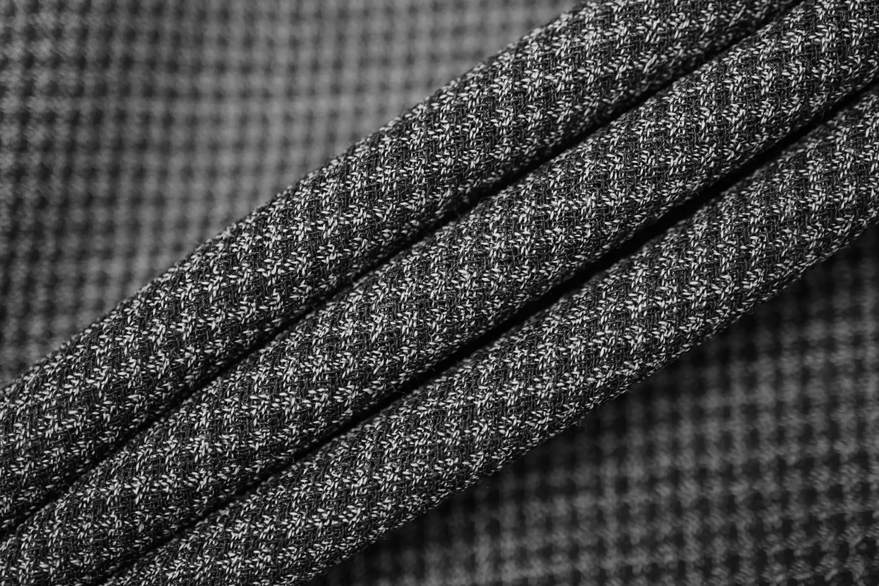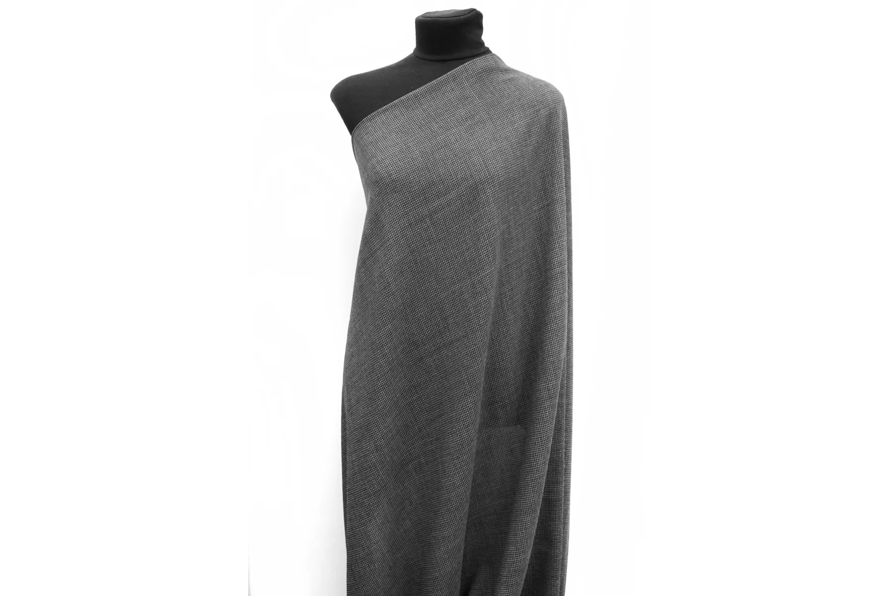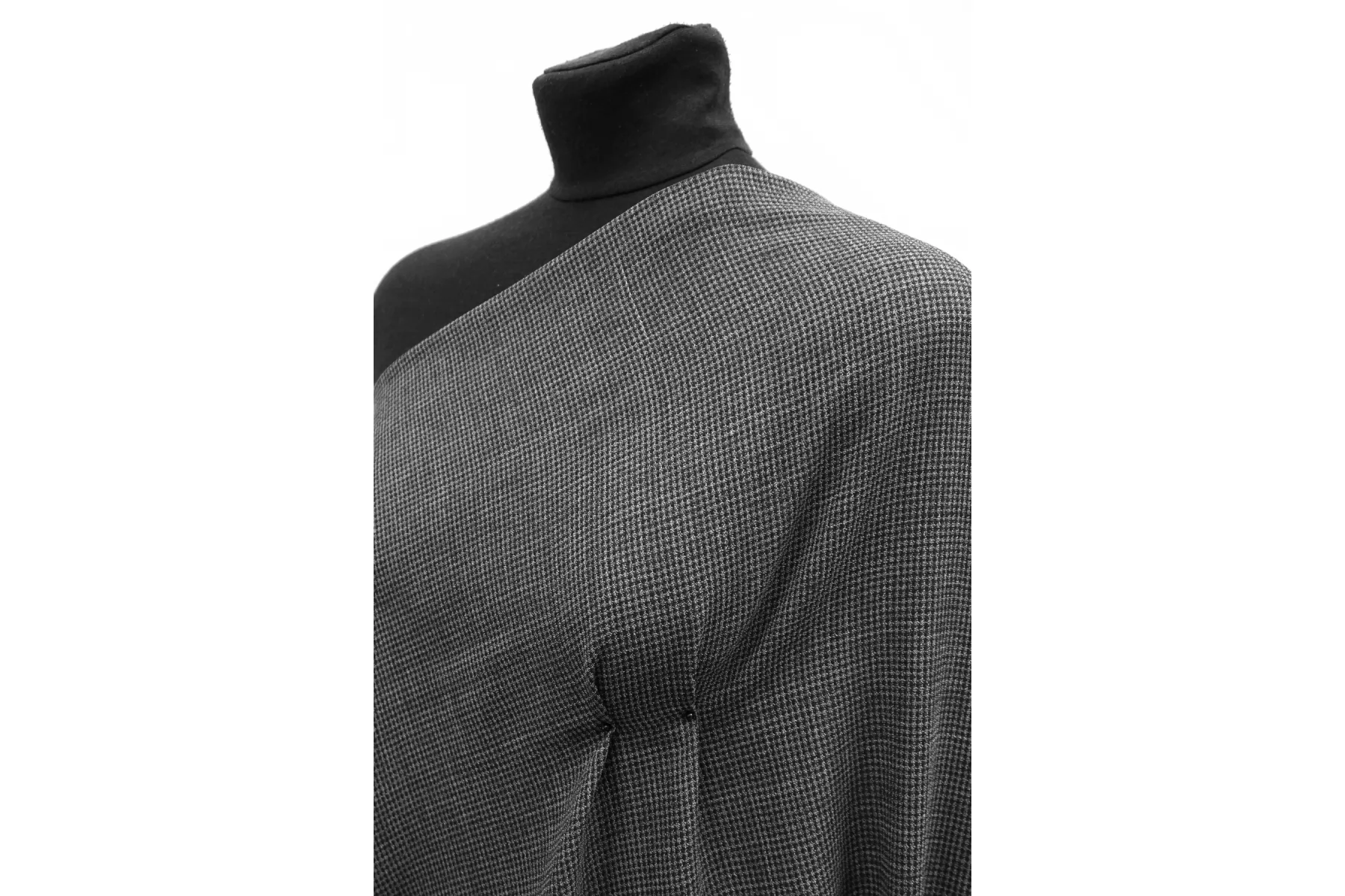 Итальянская тонкая плательно-рубашечная шерсть пестротканая из нитей серого и черного цвета. Шероховатая, креповая наощупь. Немного покалывает. Тонкая. Просвечивает. Плетение не плотное, но и не рыхлое. Форму неплохо держит, красиво драпируется. Пластичная. Подойдет для пошива платья, рубашки, юбки.