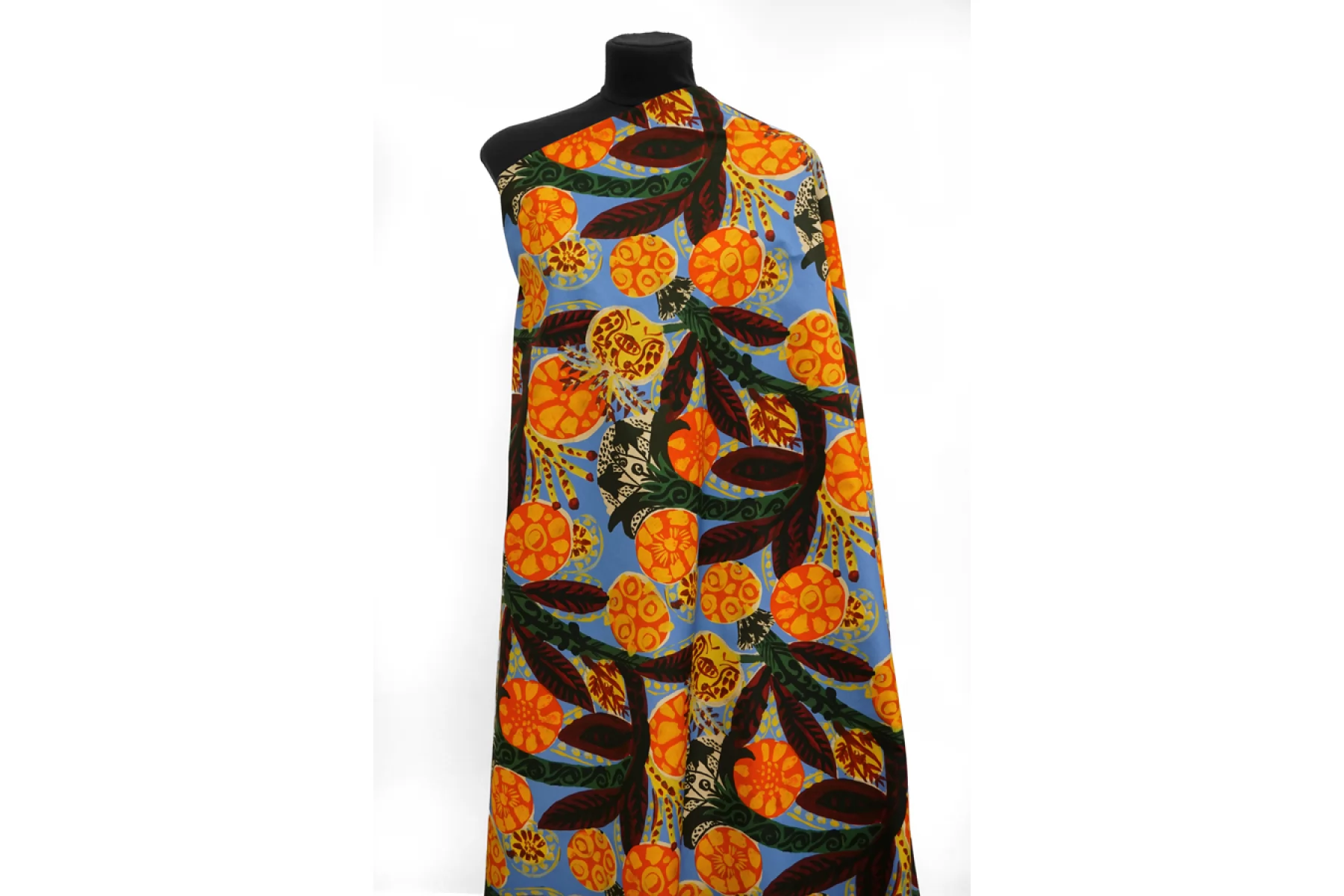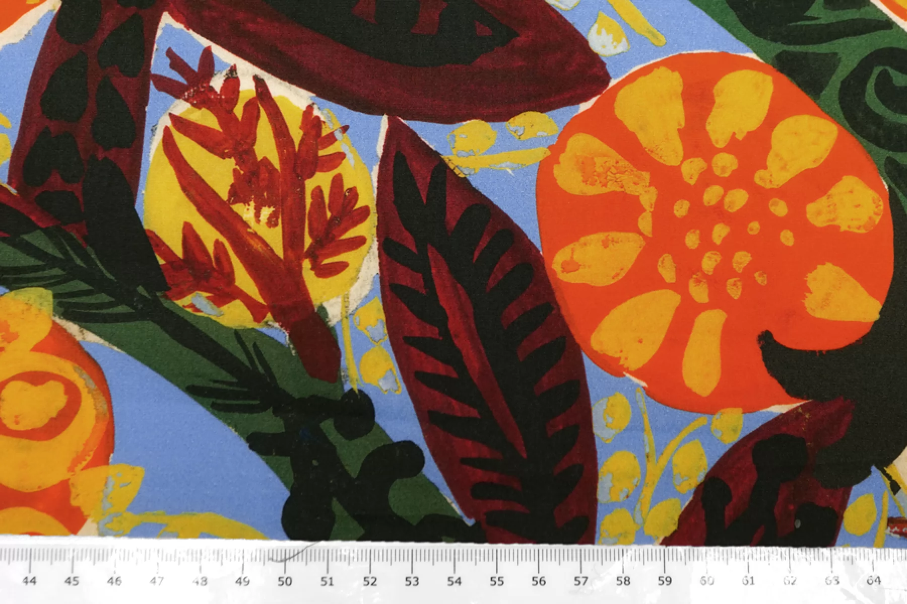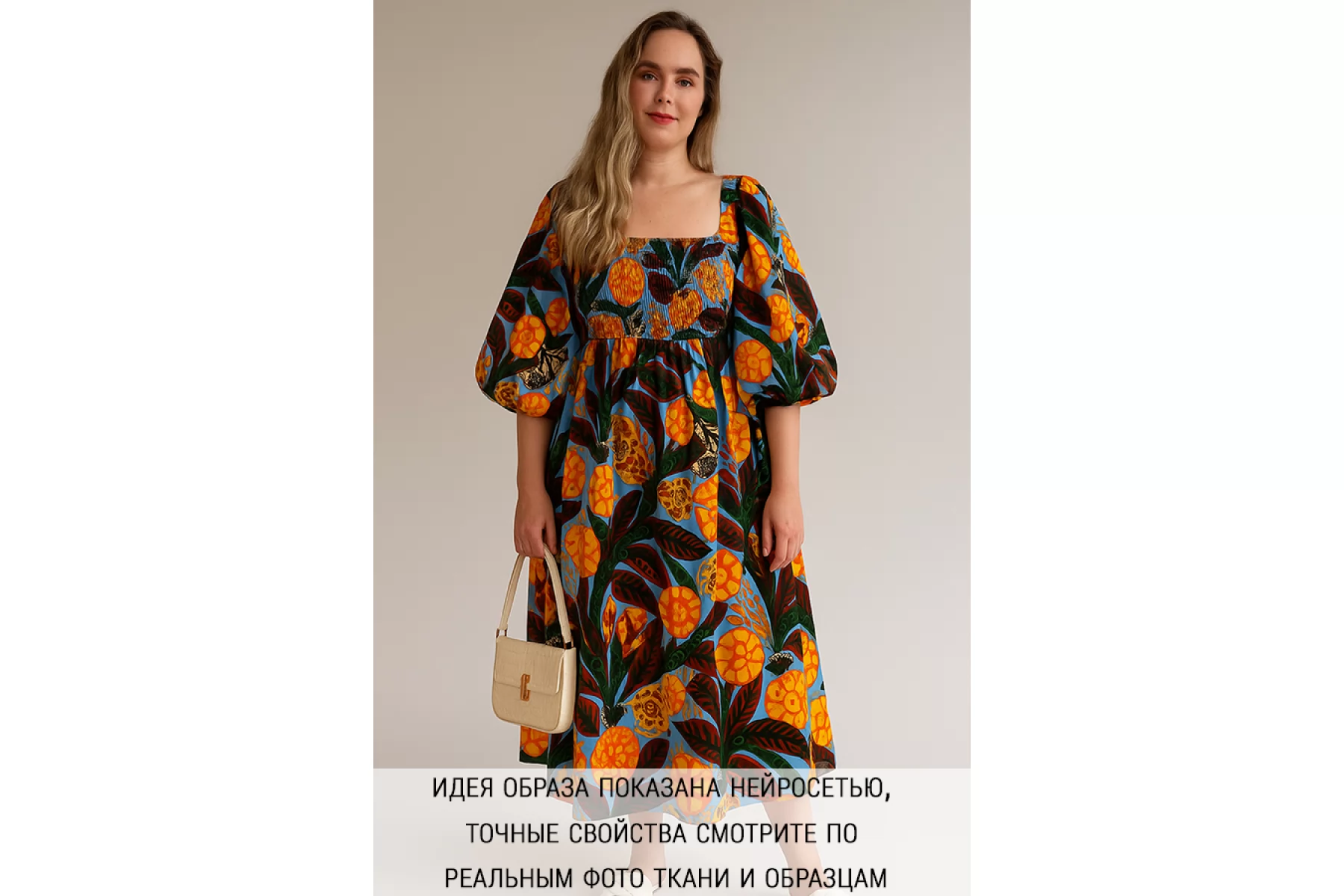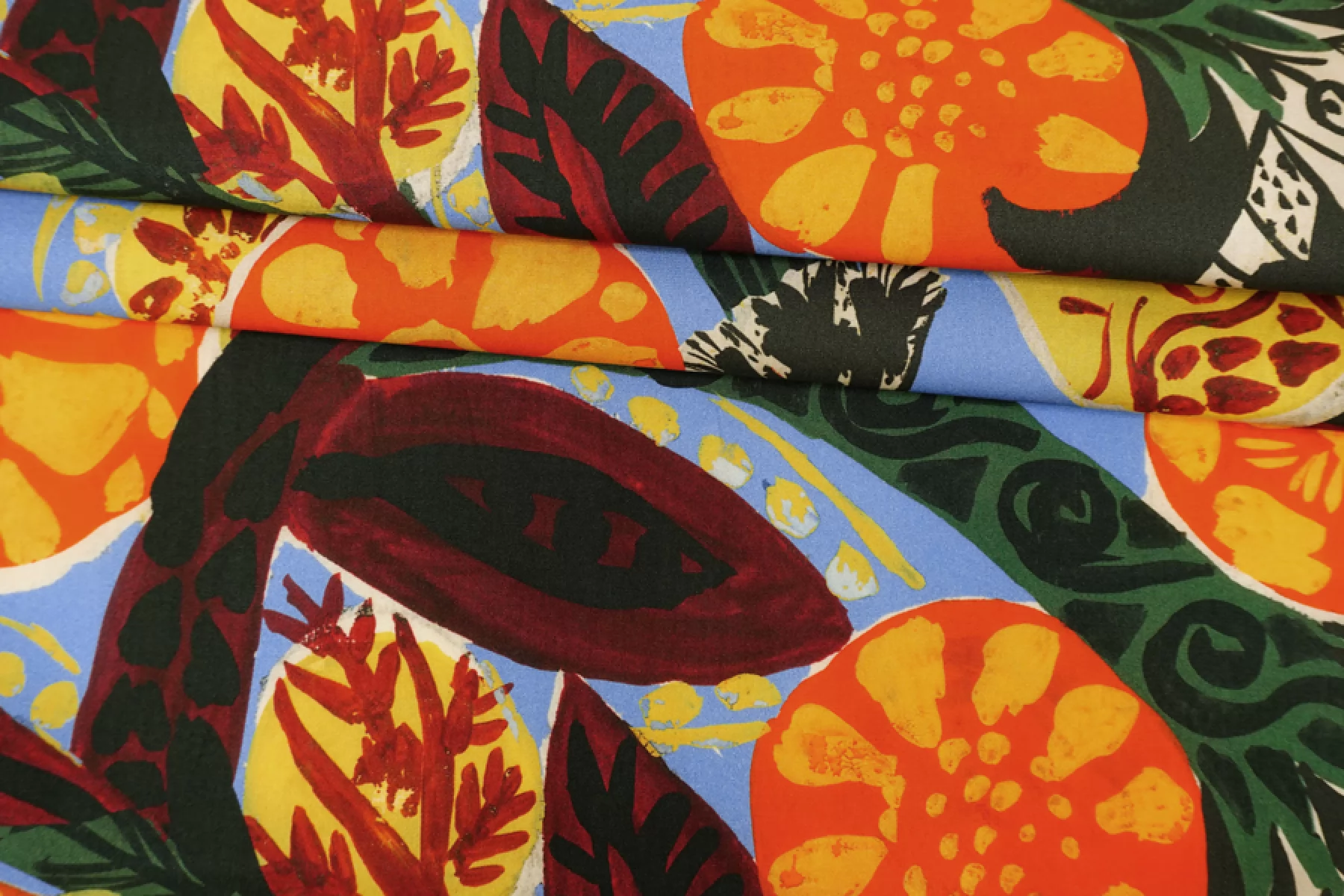 Яркий итальянский хлопок плательно-рубашечной плотности с необычным абстрактным принтом, словно нарисованный красками в голубом, желтом, оранжевом, зеленом и бордовых цветах. Рисунок отдаленно напоминает растения. Материал очень гладкий, мягкий, неплохо держит форму и драпируется. Сминается, но благодаря пестрому принту, это слабо заметно. Совсем слегка виднеется силуэт на просвете. Отличный вариант на рубашки, платья и другие варианты летней одежды. При необходимости используйте подкладочный материал.