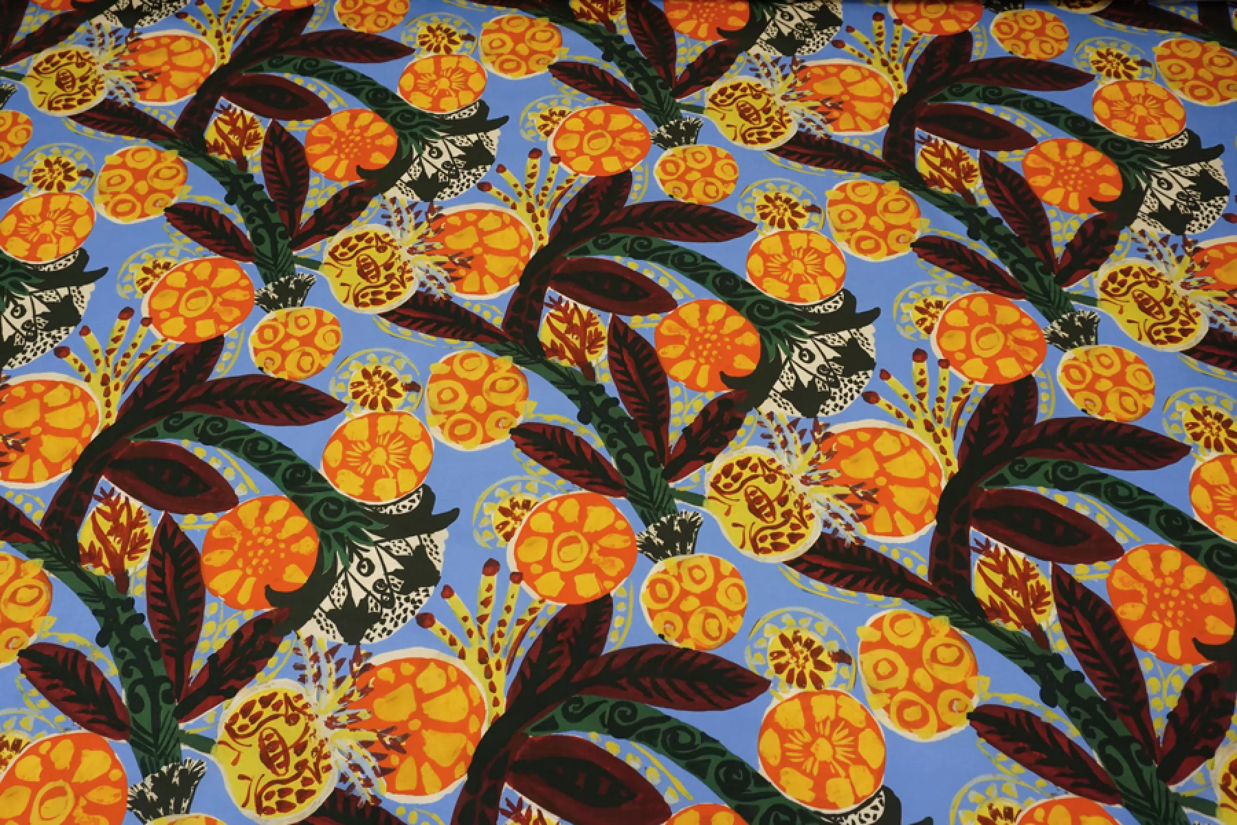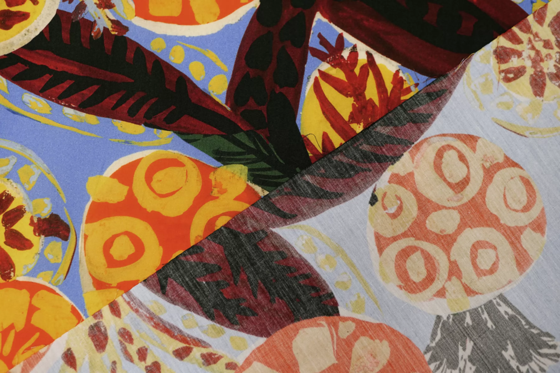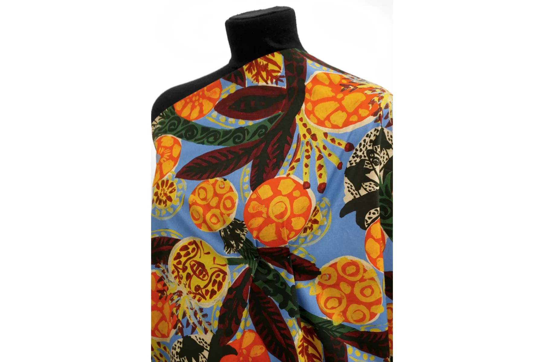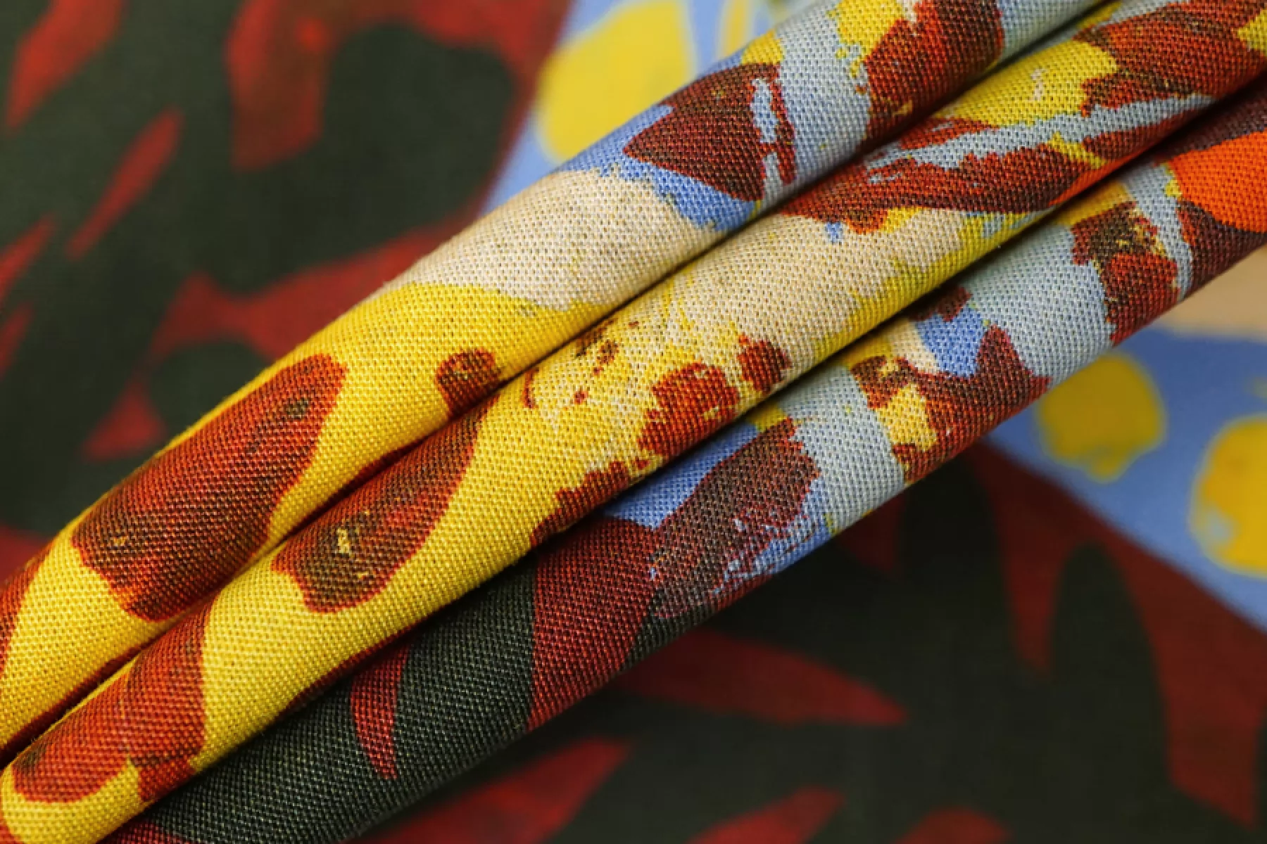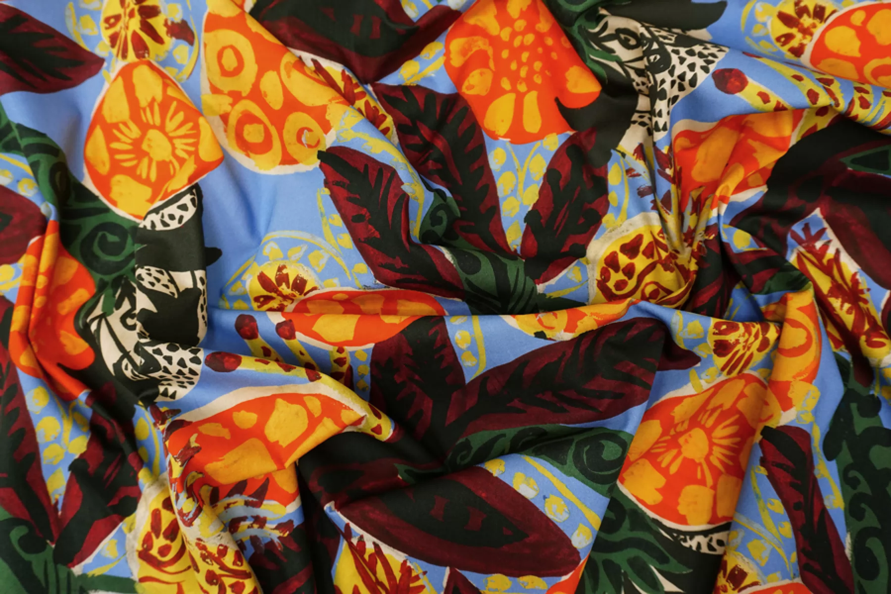 Яркий итальянский хлопок плательно-рубашечной плотности с необычным абстрактным принтом, словно нарисованный красками в голубом, желтом, оранжевом, зеленом и бордовых цветах. Рисунок отдаленно напоминает растения. Материал очень гладкий, мягкий, неплохо держит форму и драпируется. Сминается, но благодаря пестрому принту, это слабо заметно. Совсем слегка виднеется силуэт на просвете. Отличный вариант на рубашки, платья и другие варианты летней одежды. При необходимости используйте подкладочный материал.