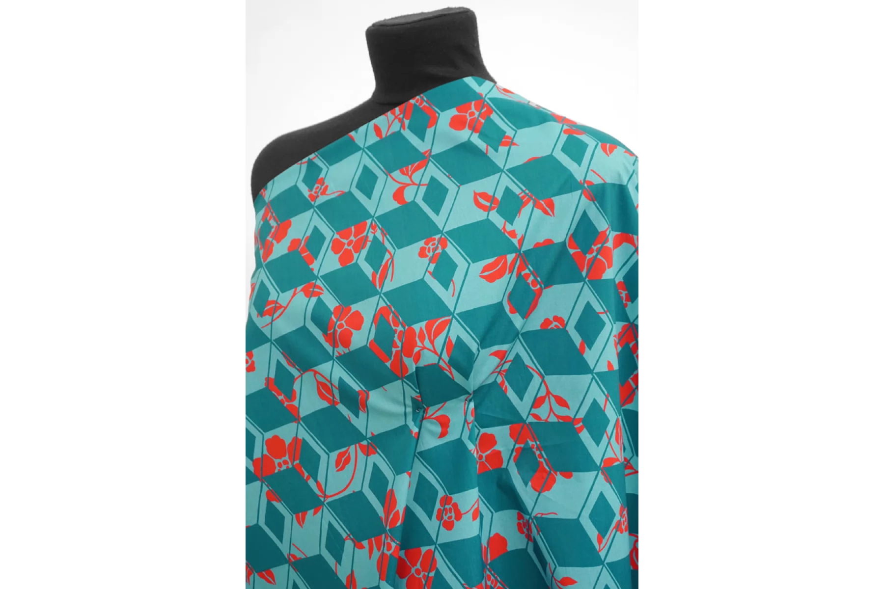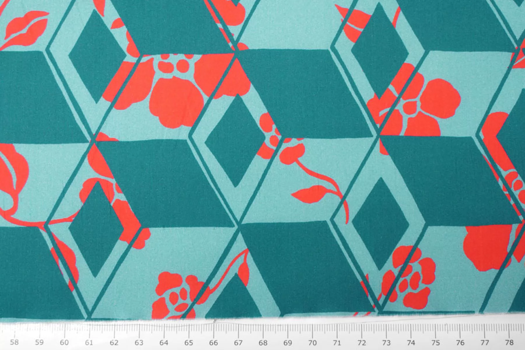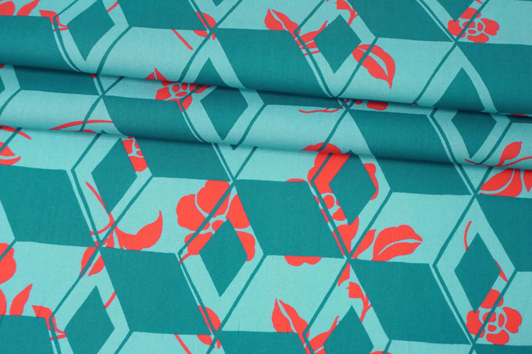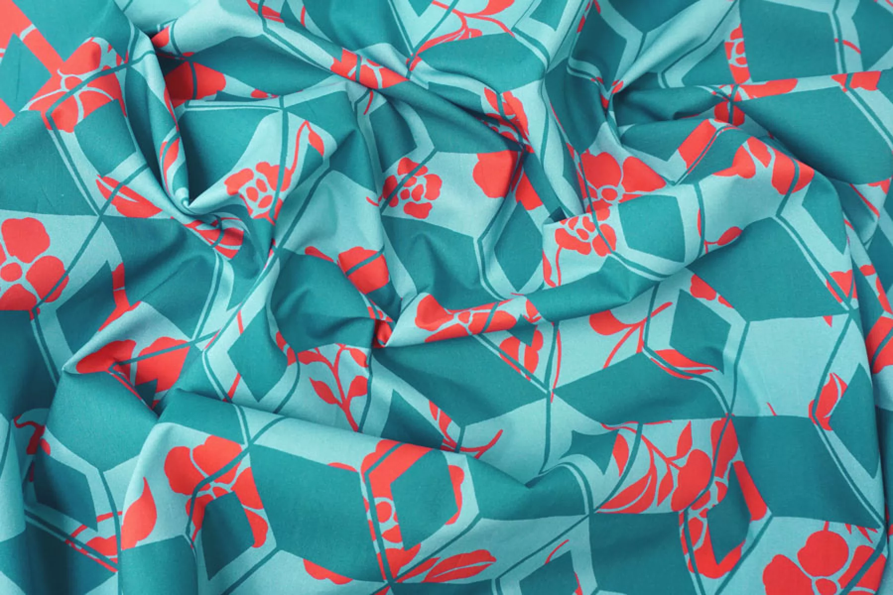 Отличный плательно-рубашечный хлопок от MAX MARA в морском голубом оттенке с рисунком в виде бирюзовой геометрии и красных цветов. Тактильно гладкий, приятный, мягкий. Обладает нежным лоском. Не тянется. Тонкий и плотный. Хорошо драпируется и неплохо держит форму. Не просвечивает. Сминается. Отличный вариант на платья, рубашки, юбки.