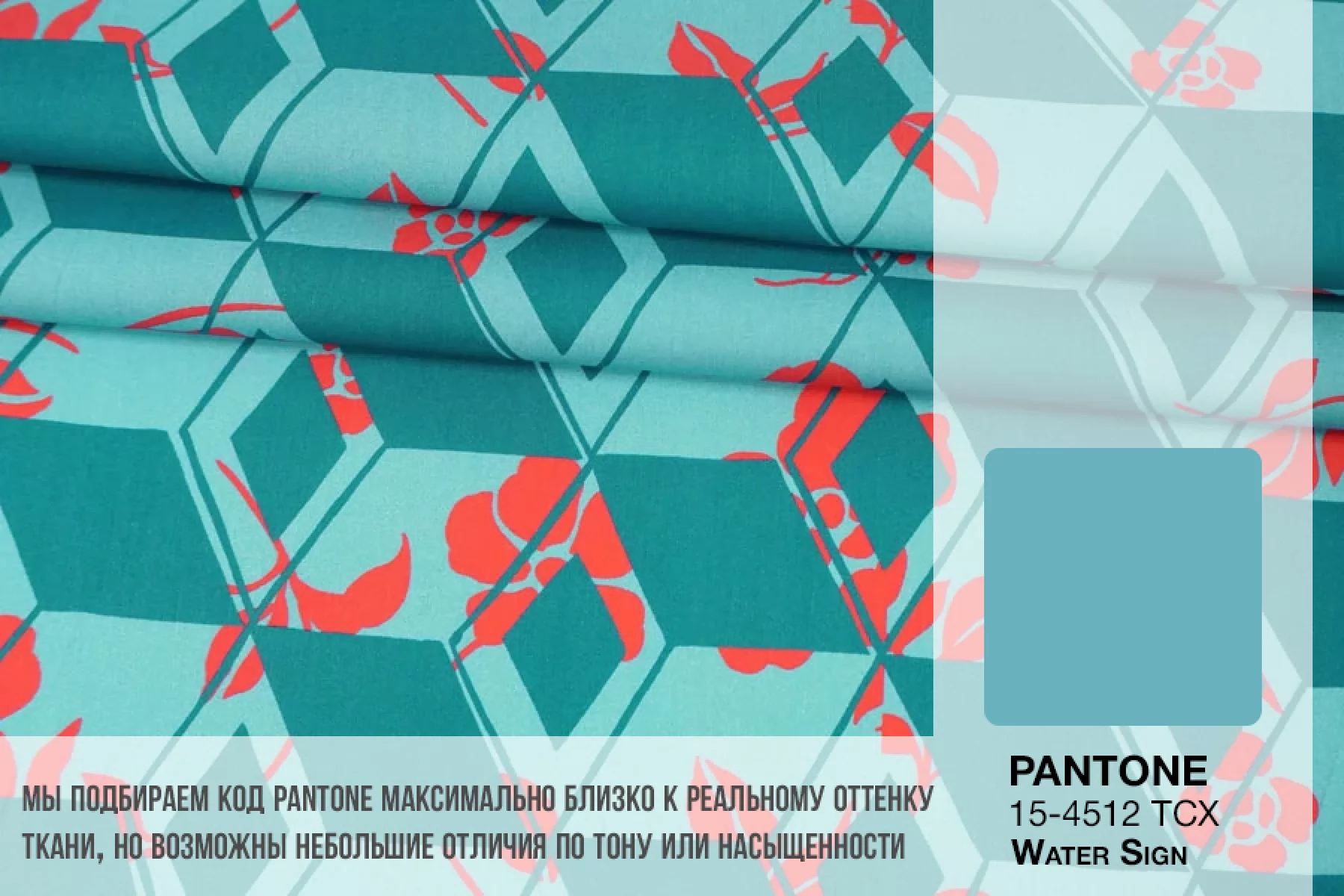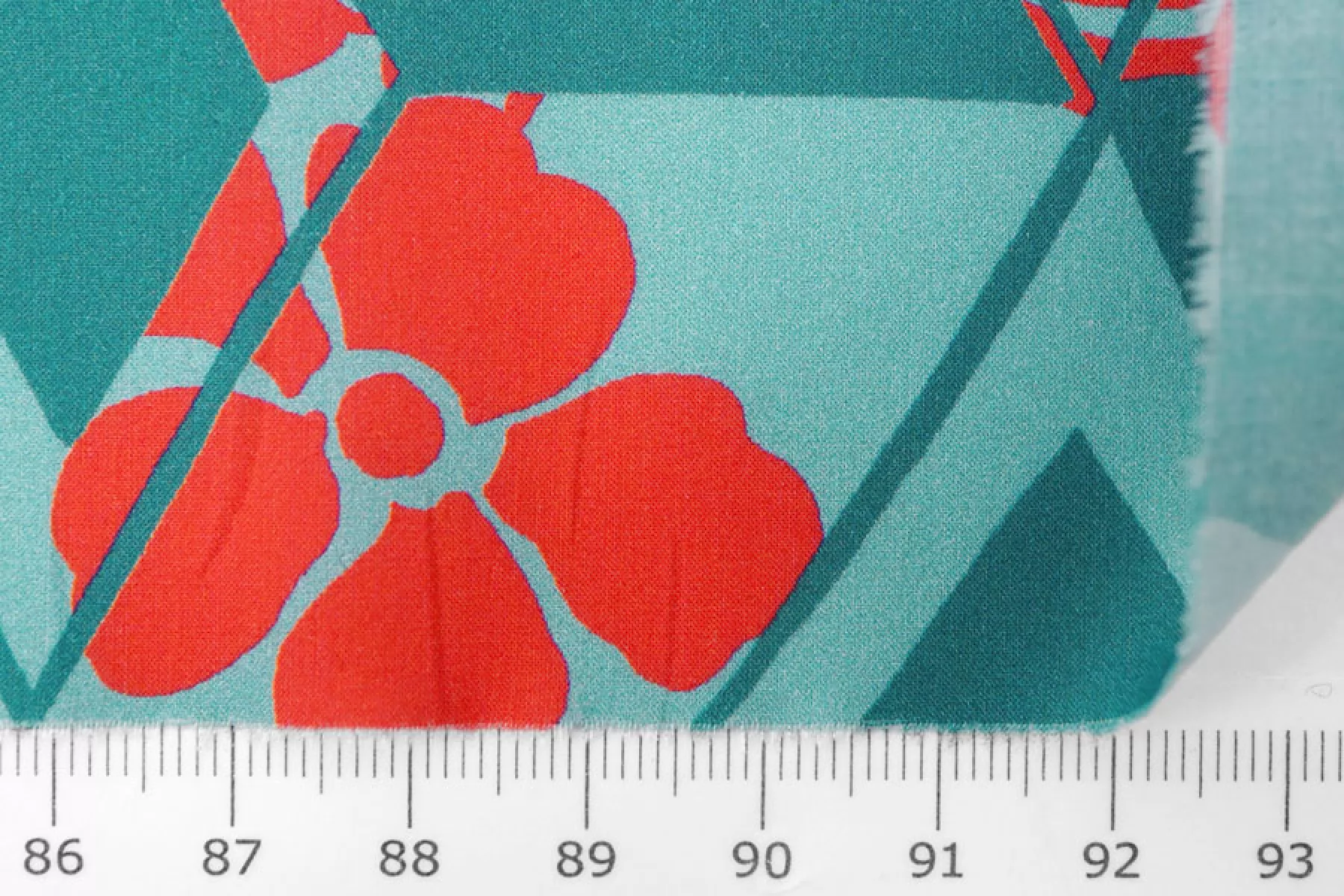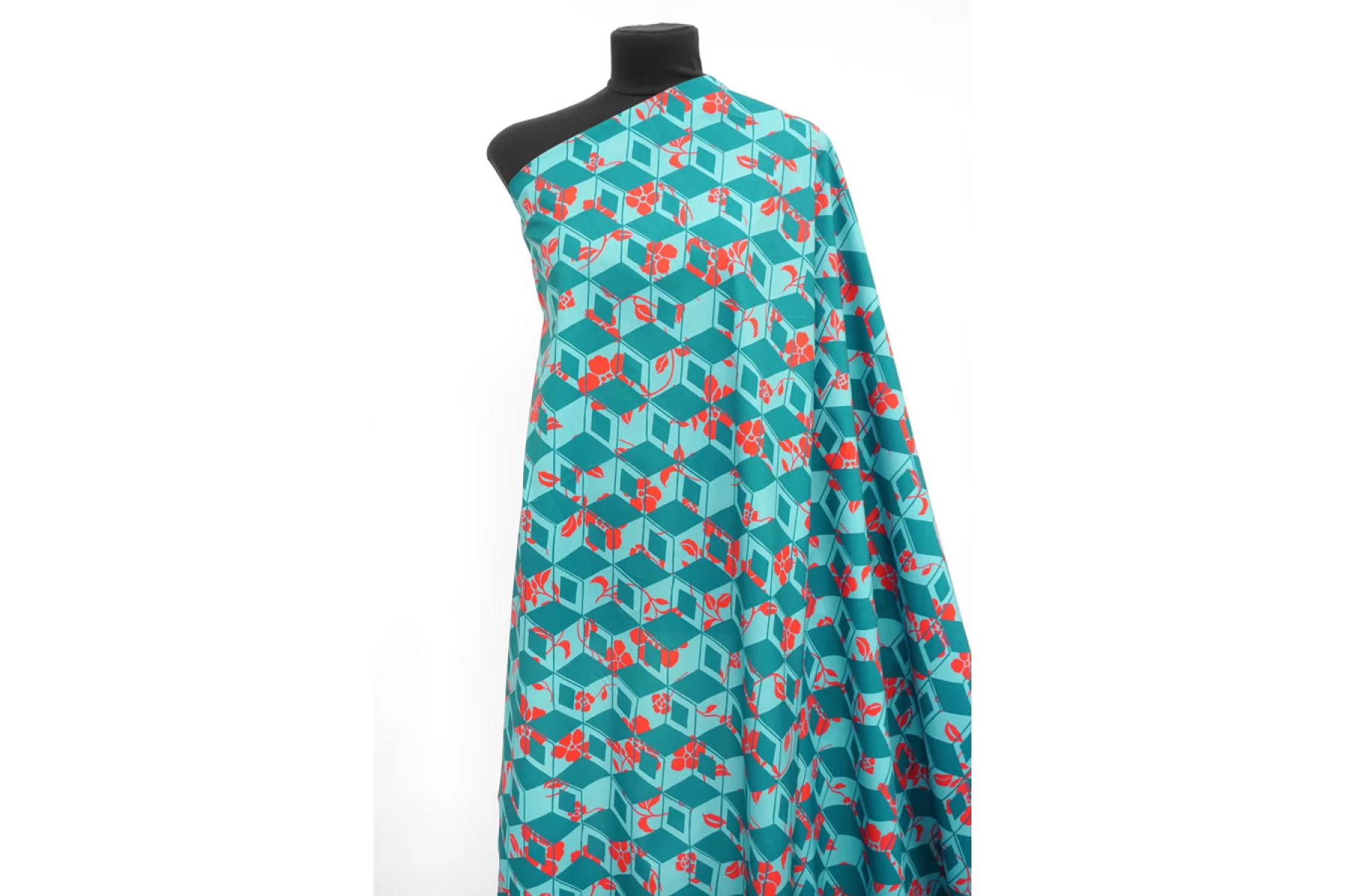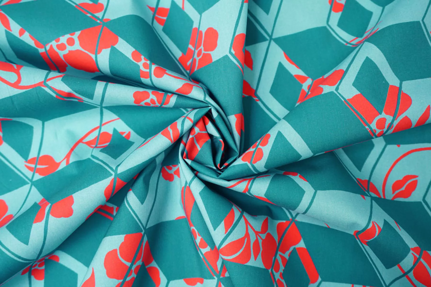 Отличный плательно-рубашечный хлопок от MAX MARA в морском голубом оттенке с рисунком в виде бирюзовой геометрии и красных цветов. Тактильно гладкий, приятный, мягкий. Обладает нежным лоском. Не тянется. Тонкий и плотный. Хорошо драпируется и неплохо держит форму. Не просвечивает. Сминается. Отличный вариант на платья, рубашки, юбки.