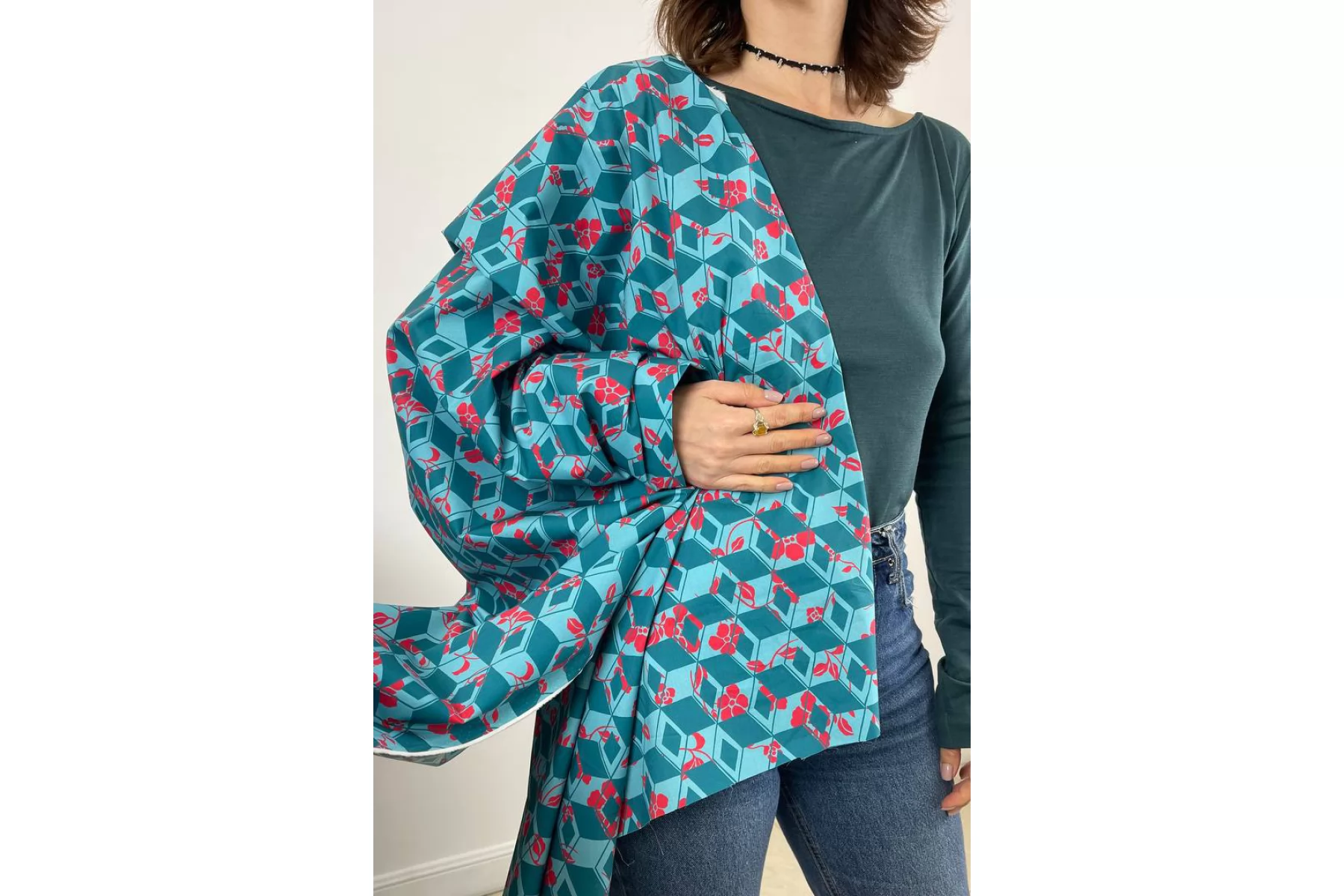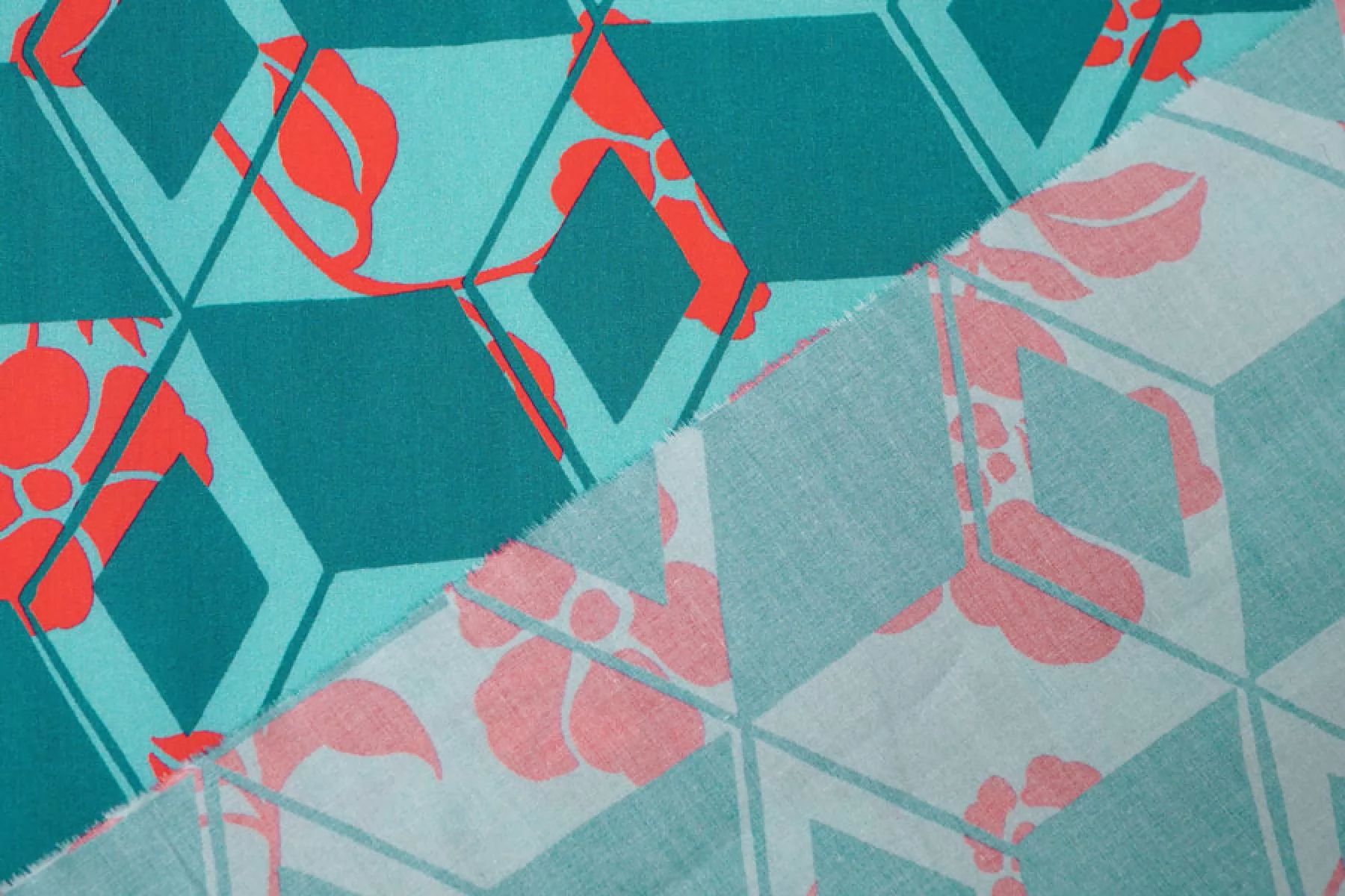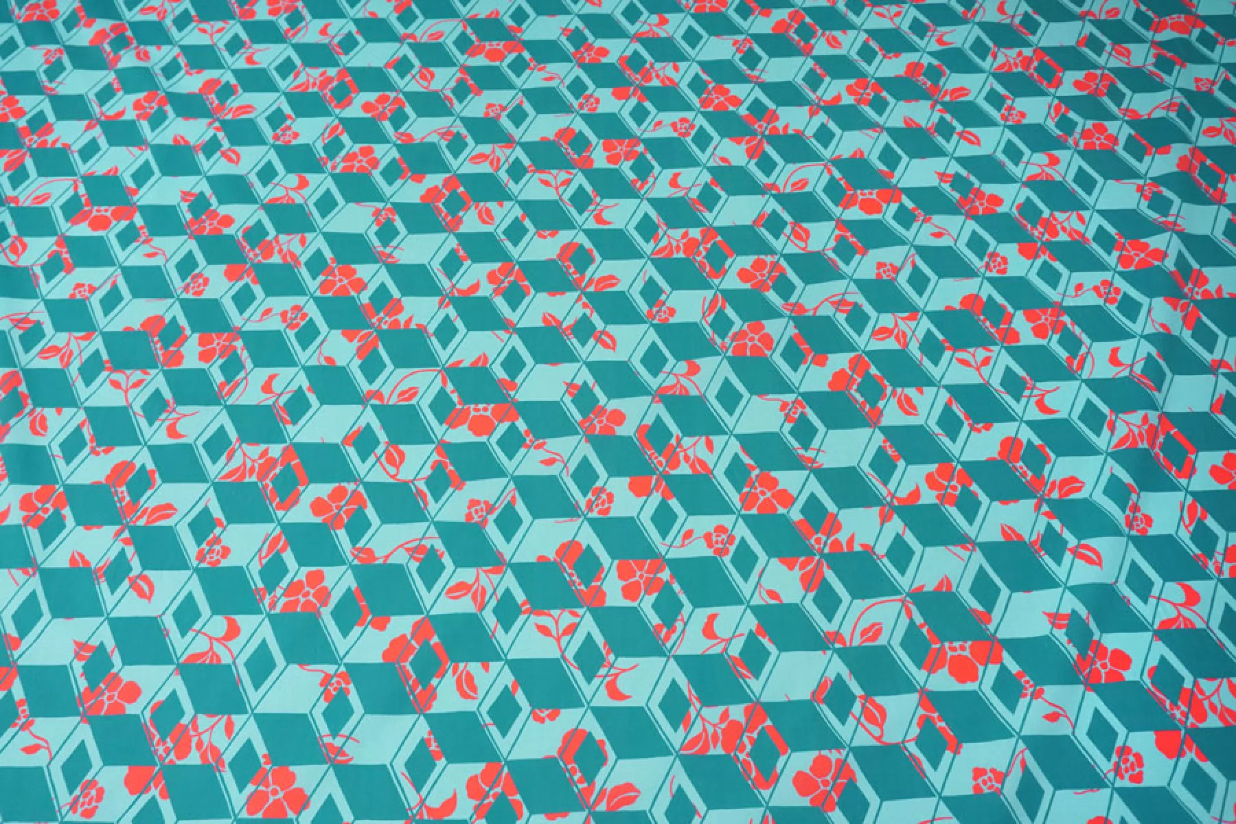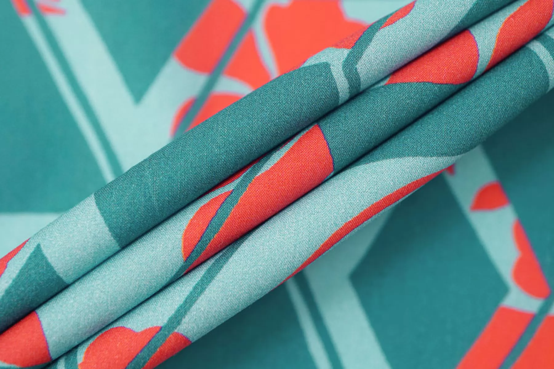 Отличный плательно-рубашечный хлопок от MAX MARA в морском голубом оттенке с рисунком в виде бирюзовой геометрии и красных цветов. Тактильно гладкий, приятный, мягкий. Обладает нежным лоском. Не тянется. Тонкий и плотный. Хорошо драпируется и неплохо держит форму. Не просвечивает. Сминается. Отличный вариант на платья, рубашки, юбки.