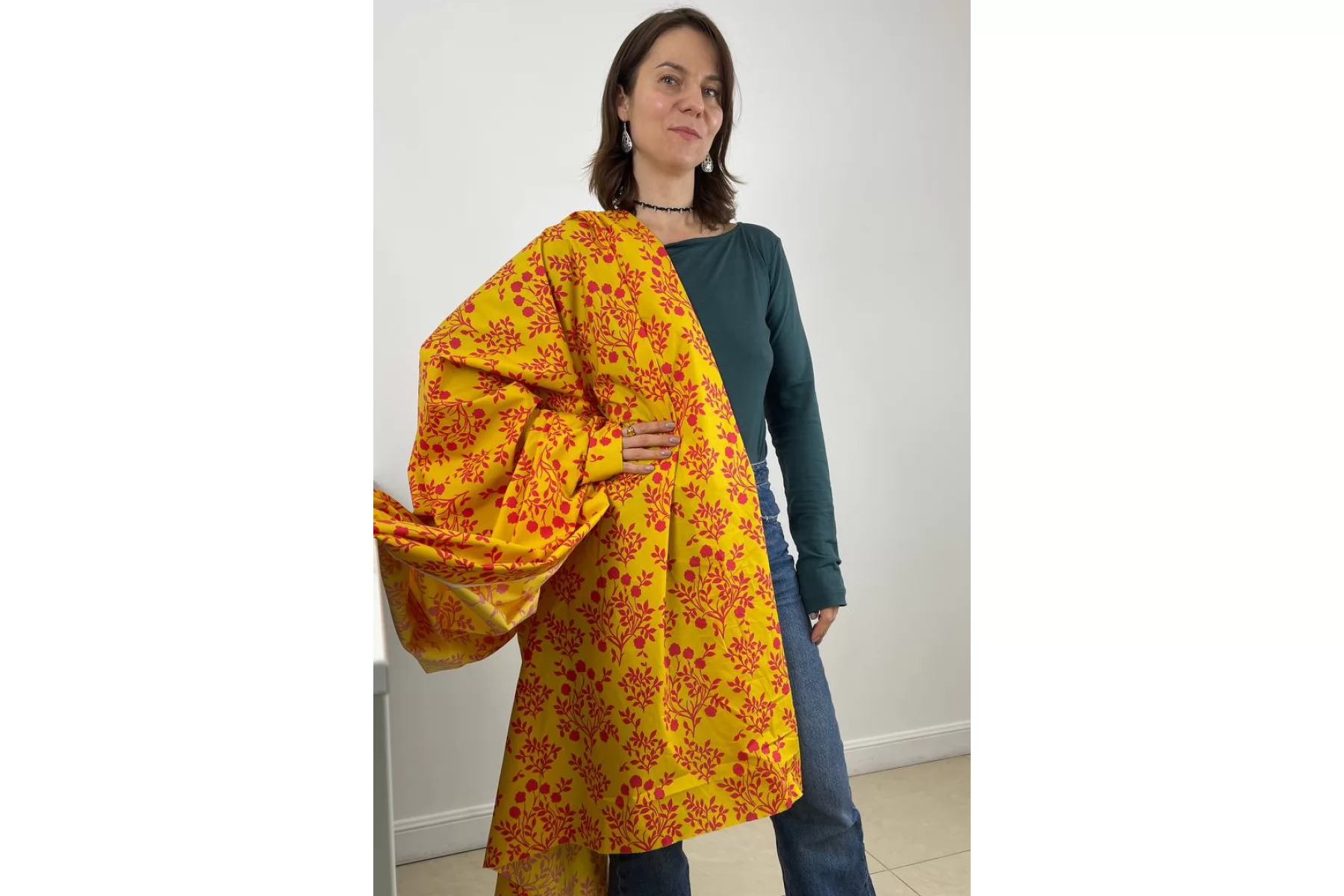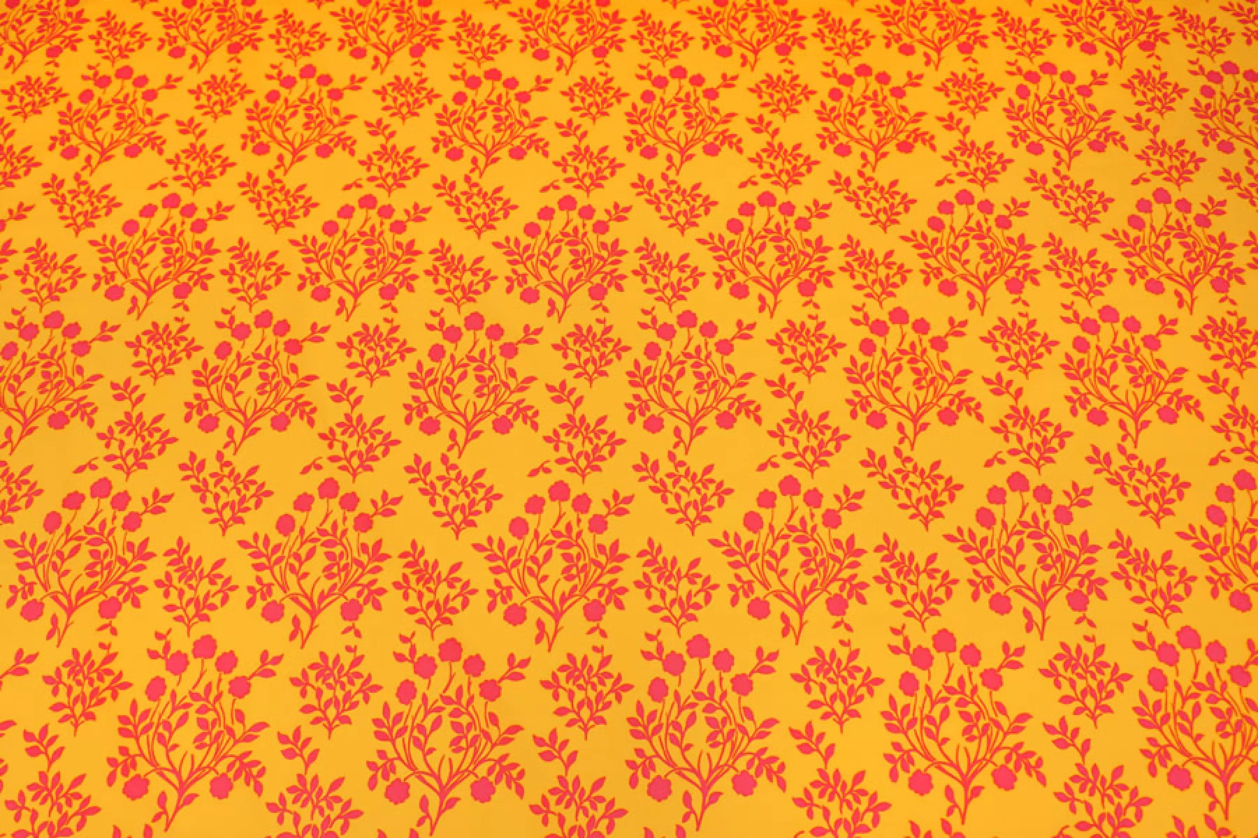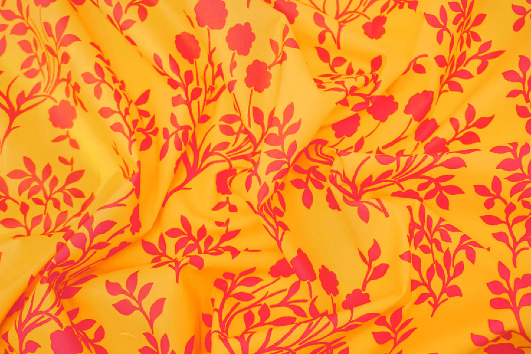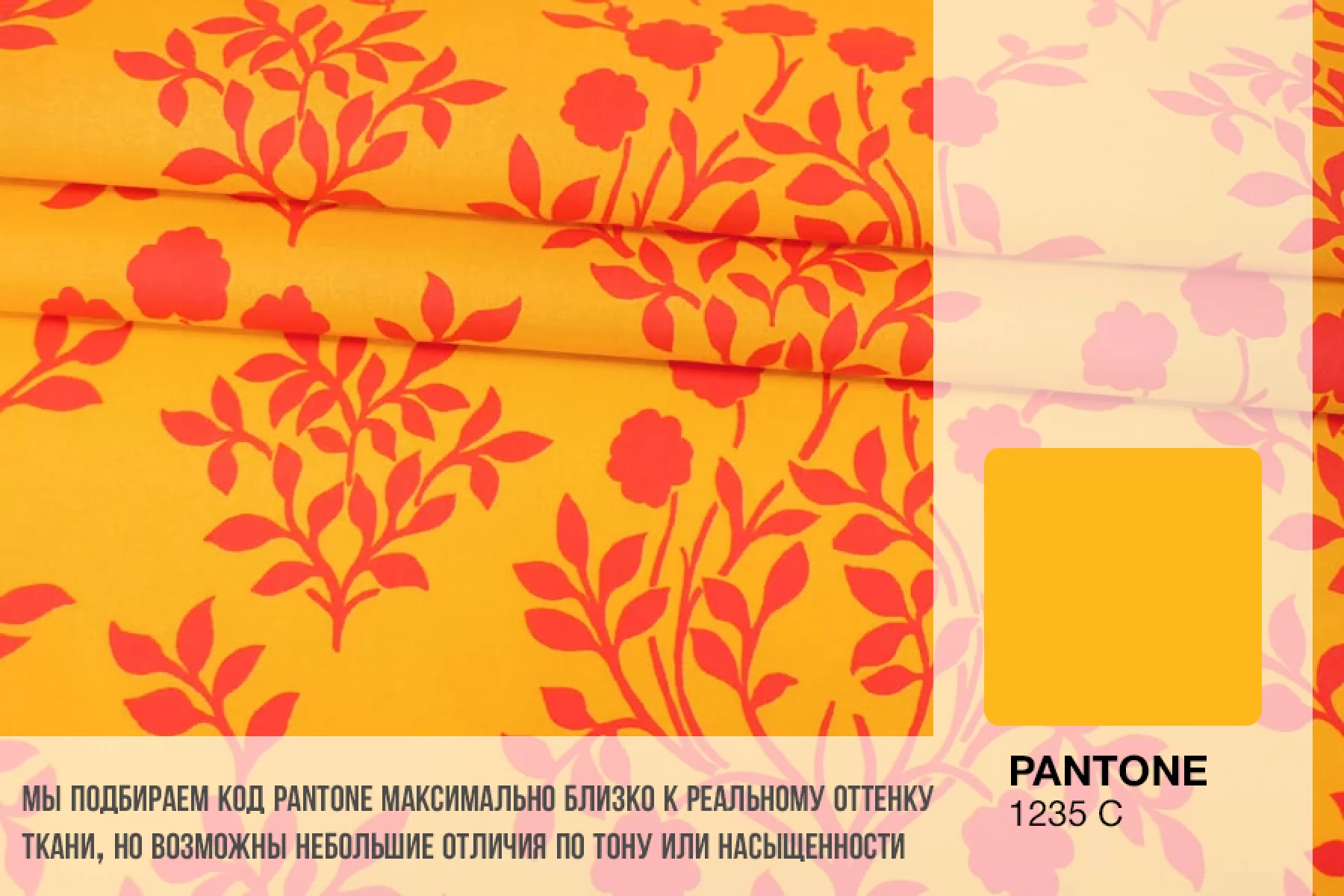 Красивый плательно-рубашечный хлопок от MARELLA в горчично-желтом оттенке в основе с легкой зернистостью принта. По полотну распределен цветочный узор розового оттенка. Тактильно приятный, гладкий, плотненький, но в то же время тонкий. Упруго и совсем немного тянется за счет плетения. Немного прослеживается контур силуэта. Отлично драпируется и держит форму. Мнется. Прекрасно подойдет на платья, рубашки, юбки. При необходимости используйте подкладочный материал.