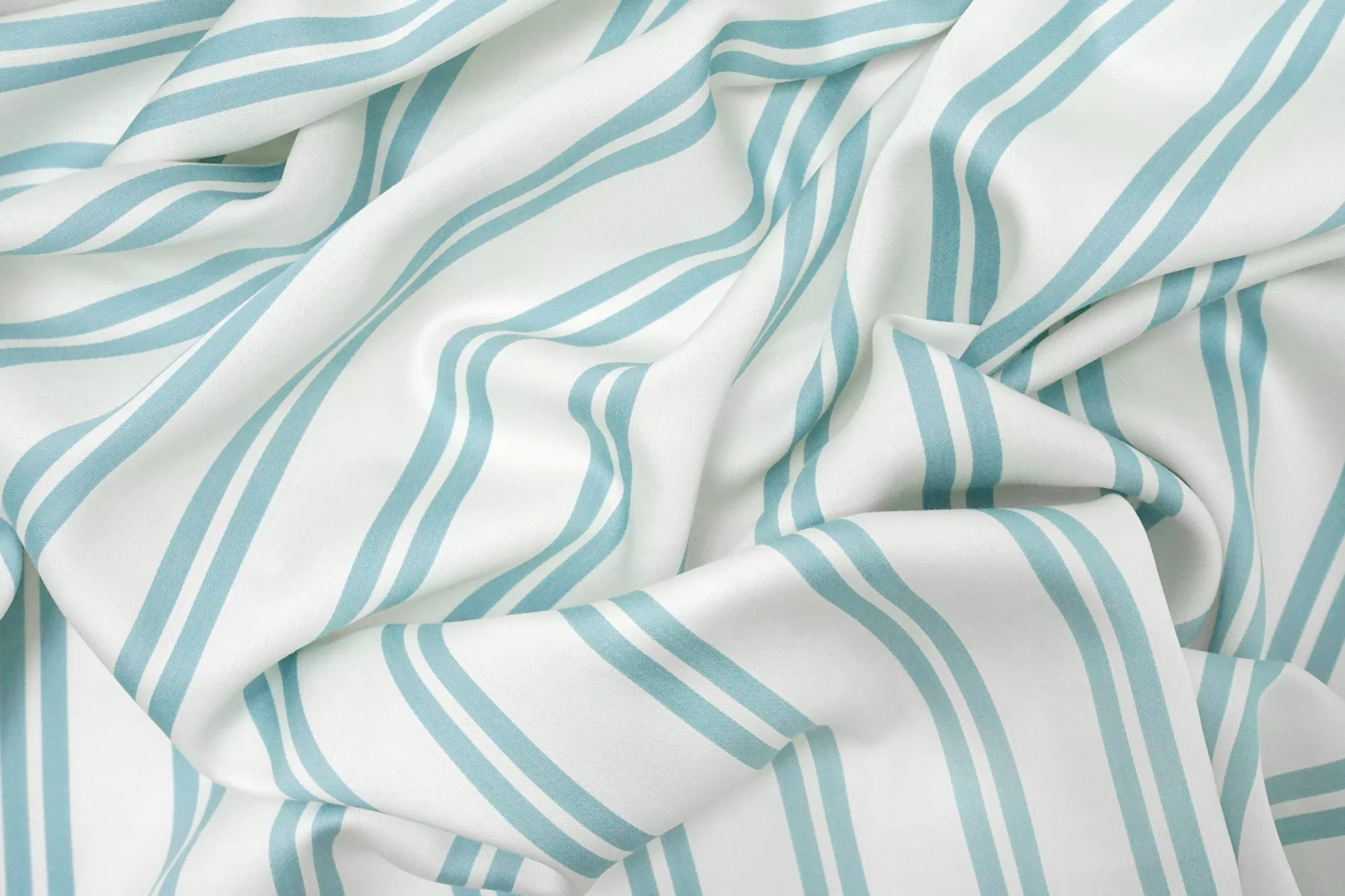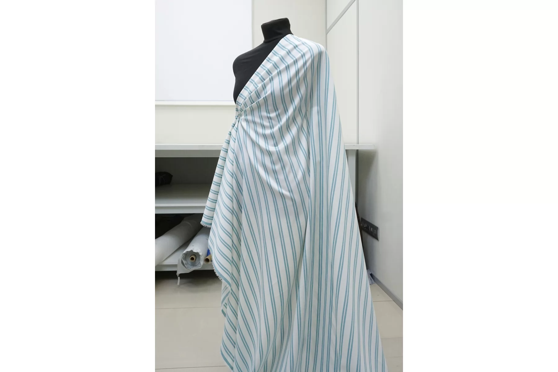 Итальянский хлопок с тенселем в полоску, сочетание белого и неяркого, мятно-голубого оттенка. Полоска расположена поперек кромки. Плетение сатиновое, но с очень лёгким лоском. Тонкая, пластичная, не тянется, немного просвечивает. Очень приятная тактильно, нежная. Подойдет для пошива платья, юбки, туники, блузки, рубашки. При работе с этой тканью советуем использовать тонкие иглы и нитки.