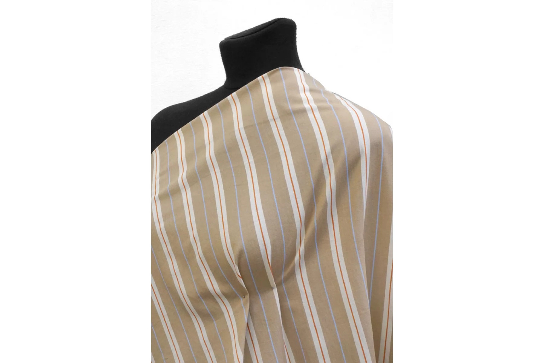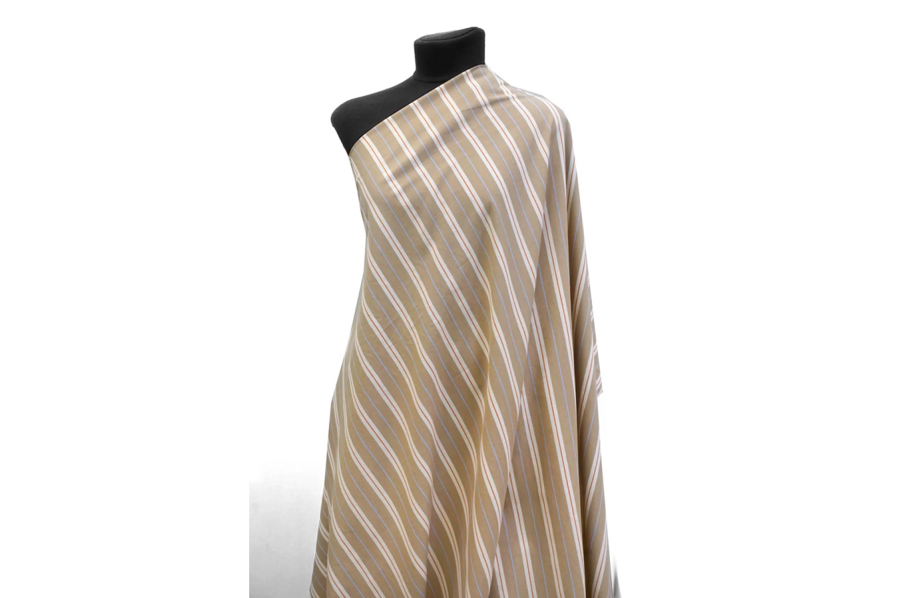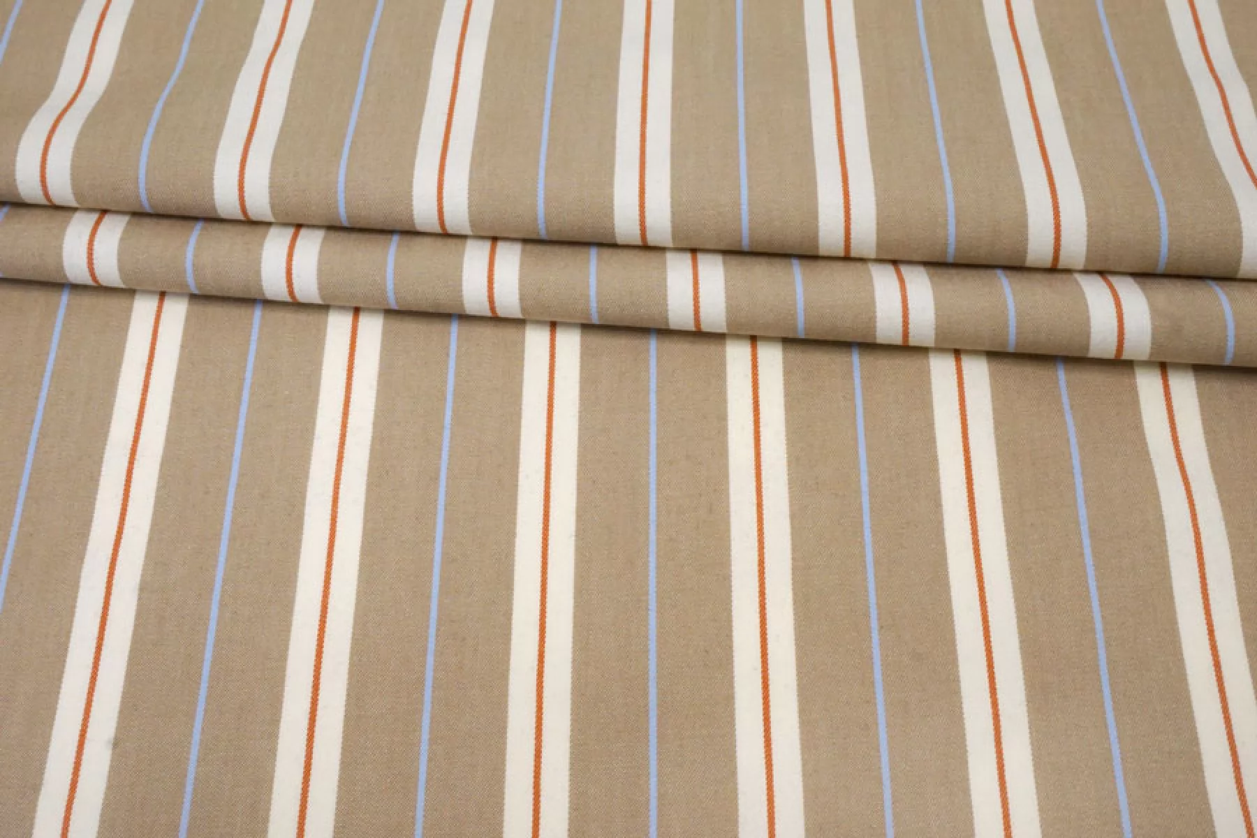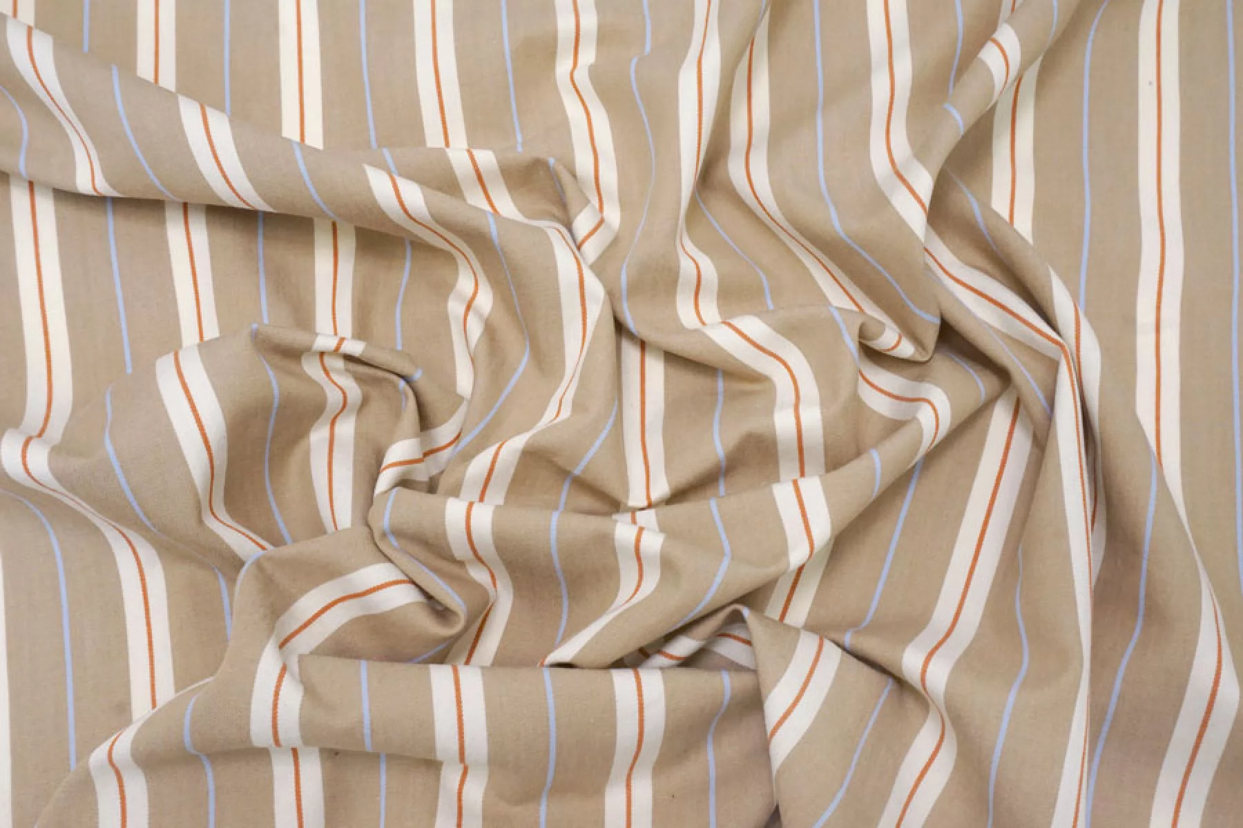 Прекрасный плательно-рубашечный хлопок в полоску, которая расположена вдоль кромки. Основные цвета бело-молочный и бежевый (с лёгким кофейным подтоном), плюс тонкие полосы голубого и терракотово-коричневого цвета. Материал очень приятный, мягкий. Не очень толстый но при этом достаточно плотный. Не просвечивает, не тянется. Мнется. Пластичный, умеренно держит форму. Отличный вариант на рубашки, платья, юбки, лёгкие брюки или шорты.