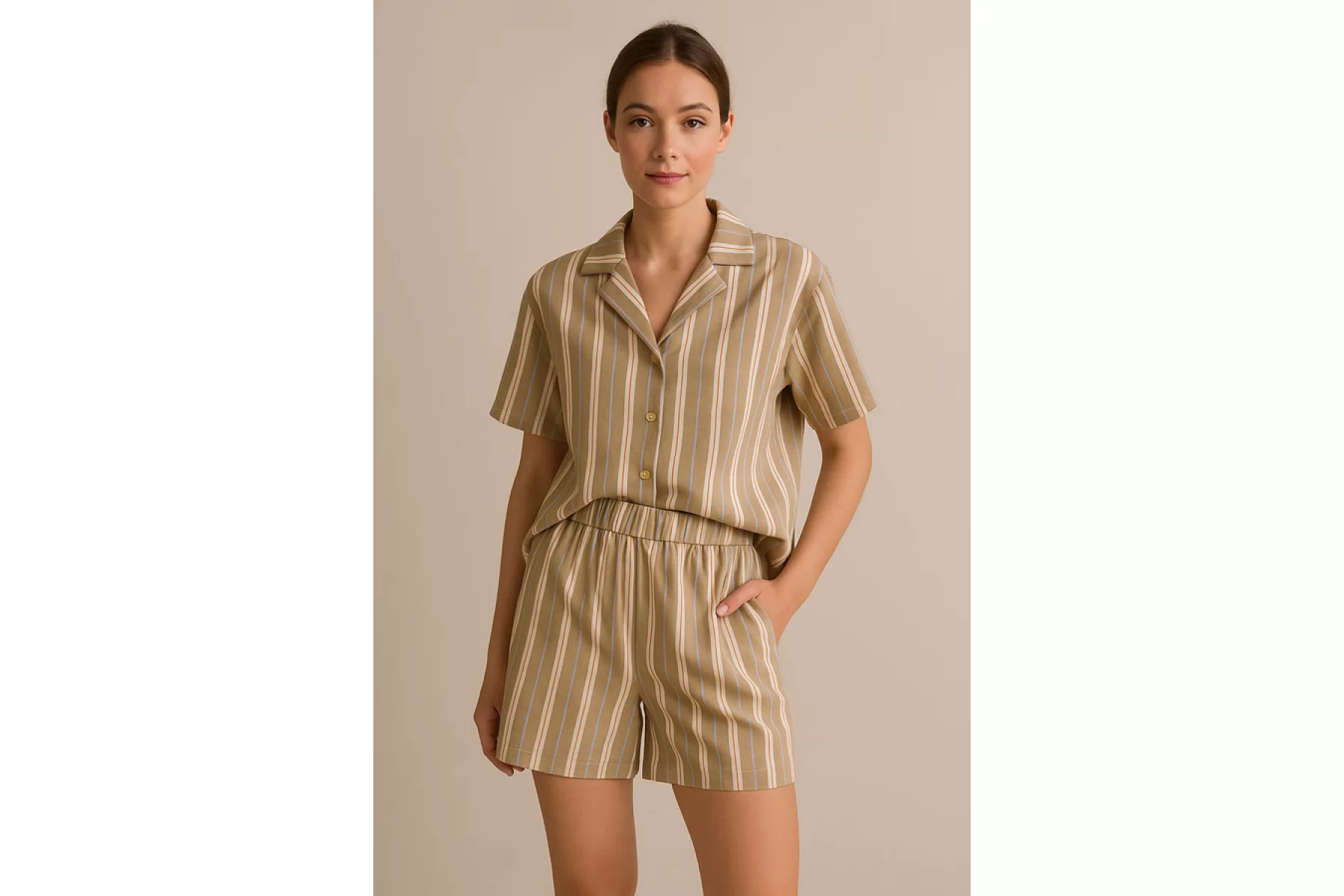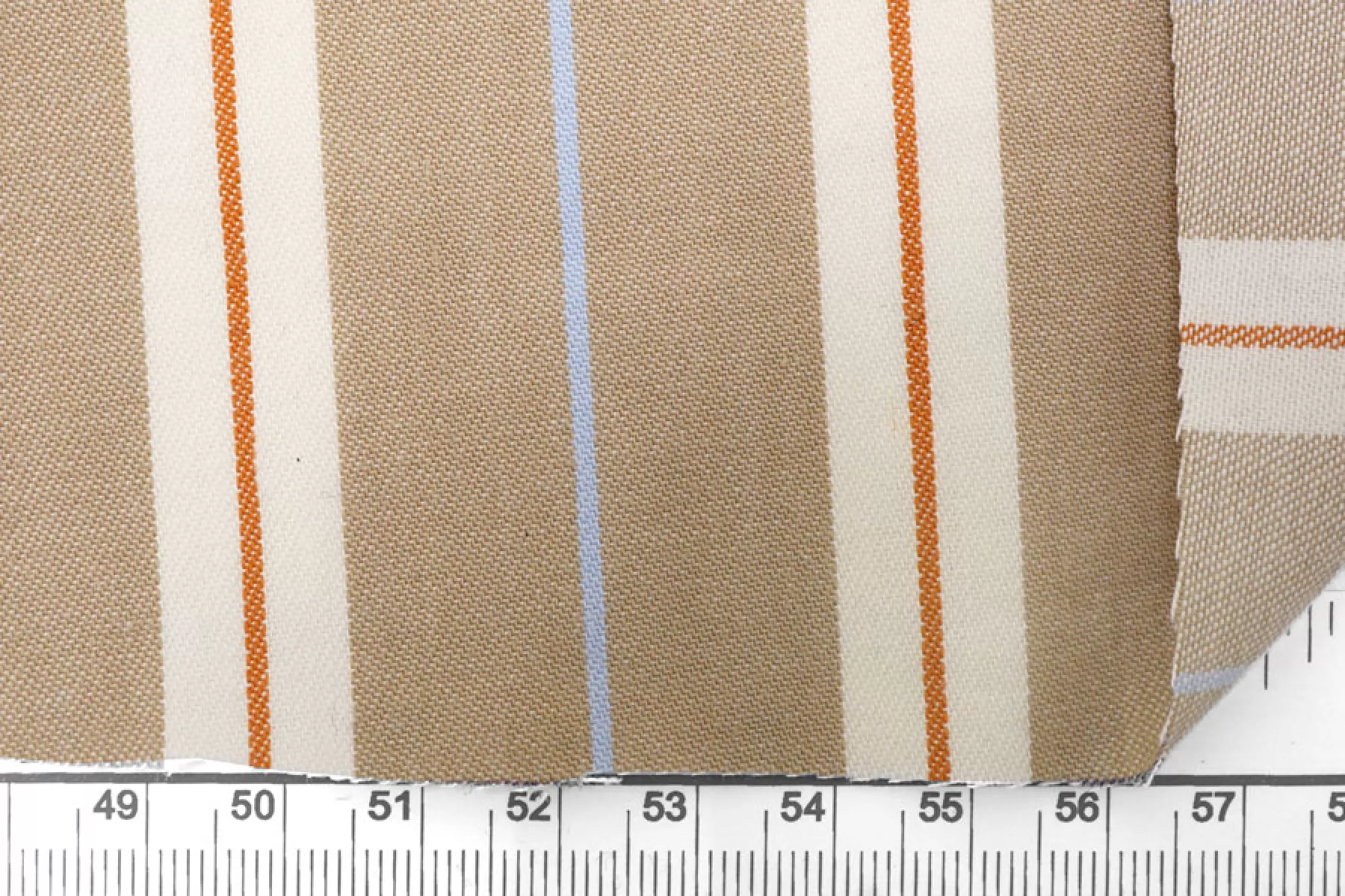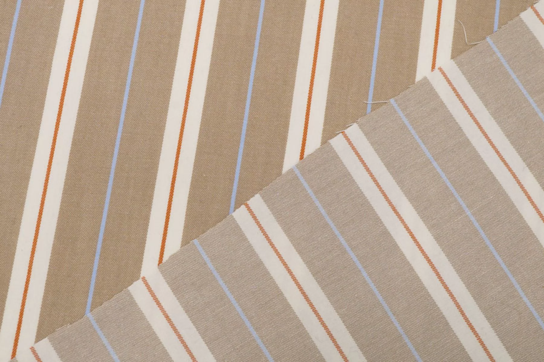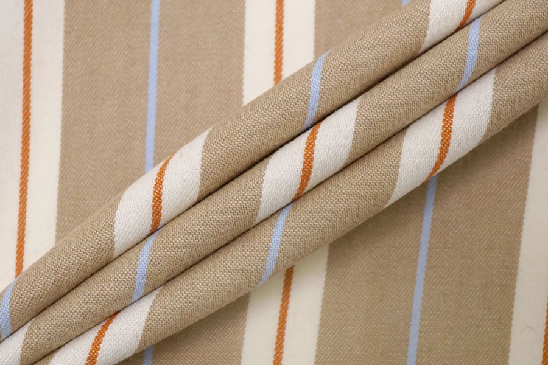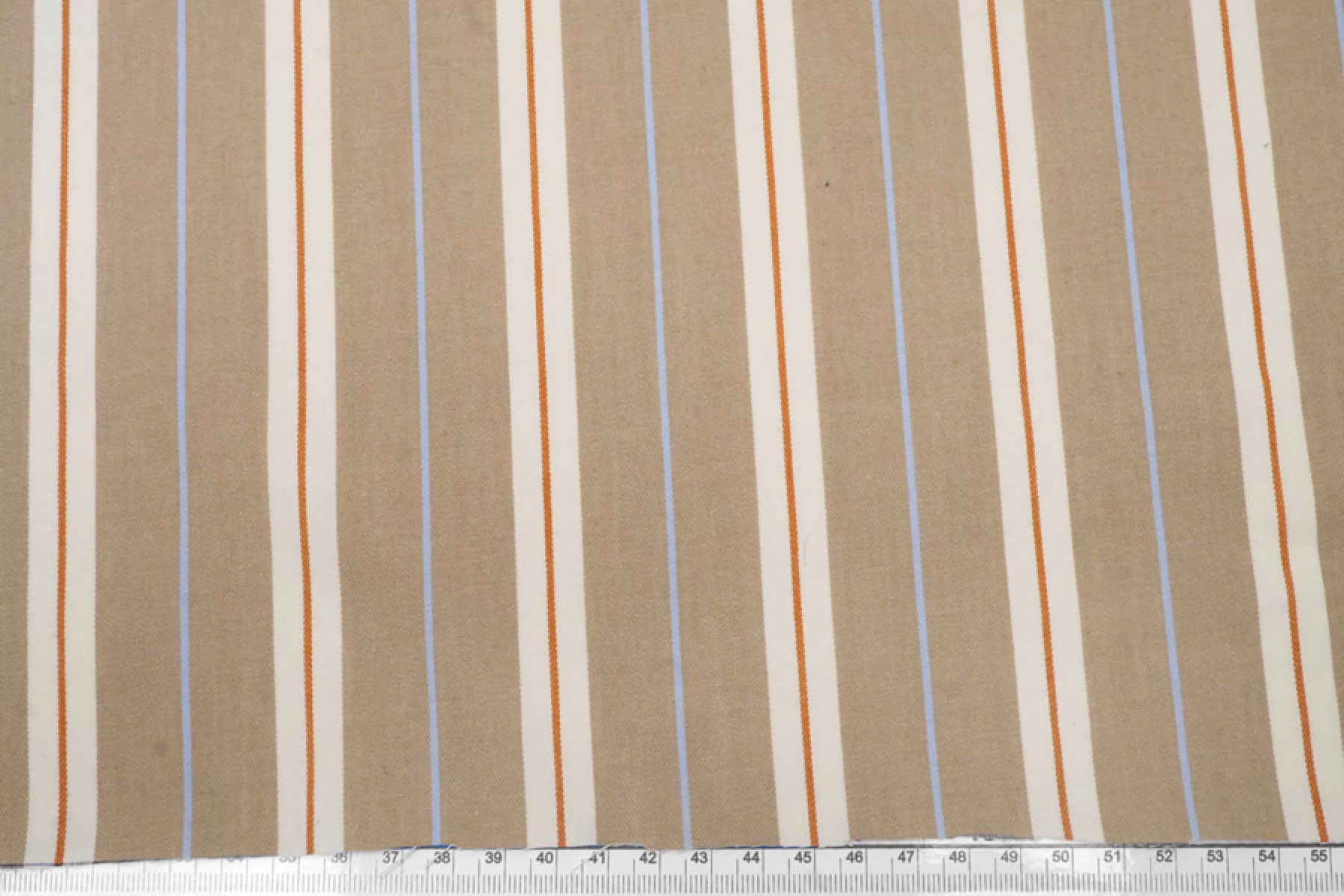 Прекрасный плательно-рубашечный хлопок в полоску, которая расположена вдоль кромки. Основные цвета бело-молочный и бежевый (с лёгким кофейным подтоном), плюс тонкие полосы голубого и терракотово-коричневого цвета. Материал очень приятный, мягкий. Не очень толстый но при этом достаточно плотный. Не просвечивает, не тянется. Мнется. Пластичный, умеренно держит форму. Отличный вариант на рубашки, платья, юбки, лёгкие брюки или шорты.