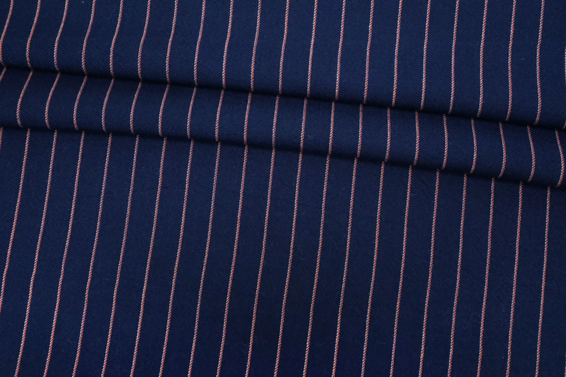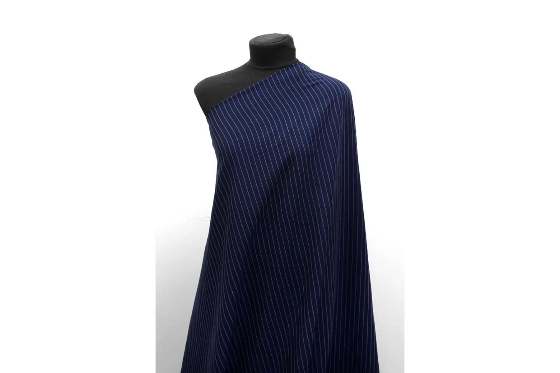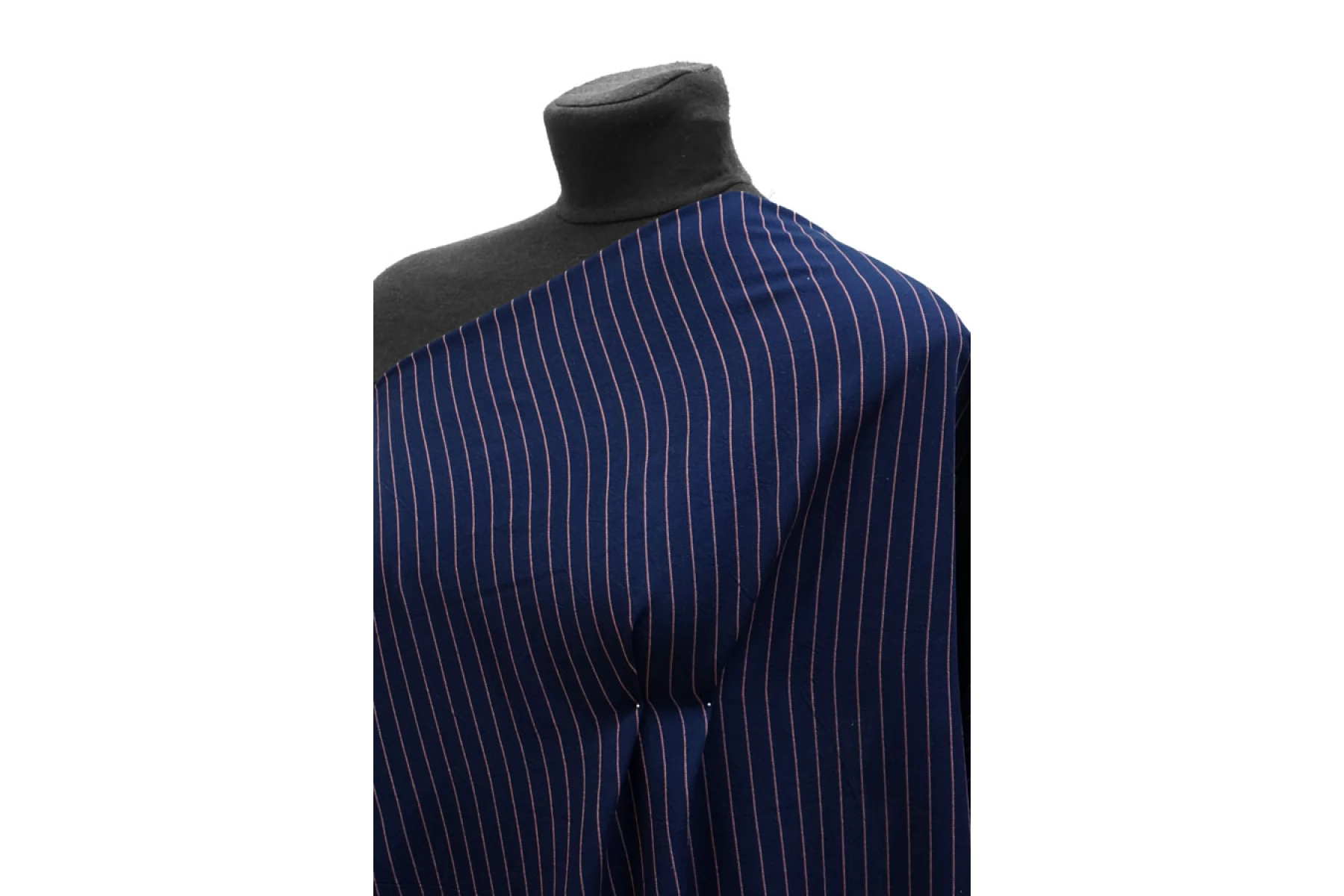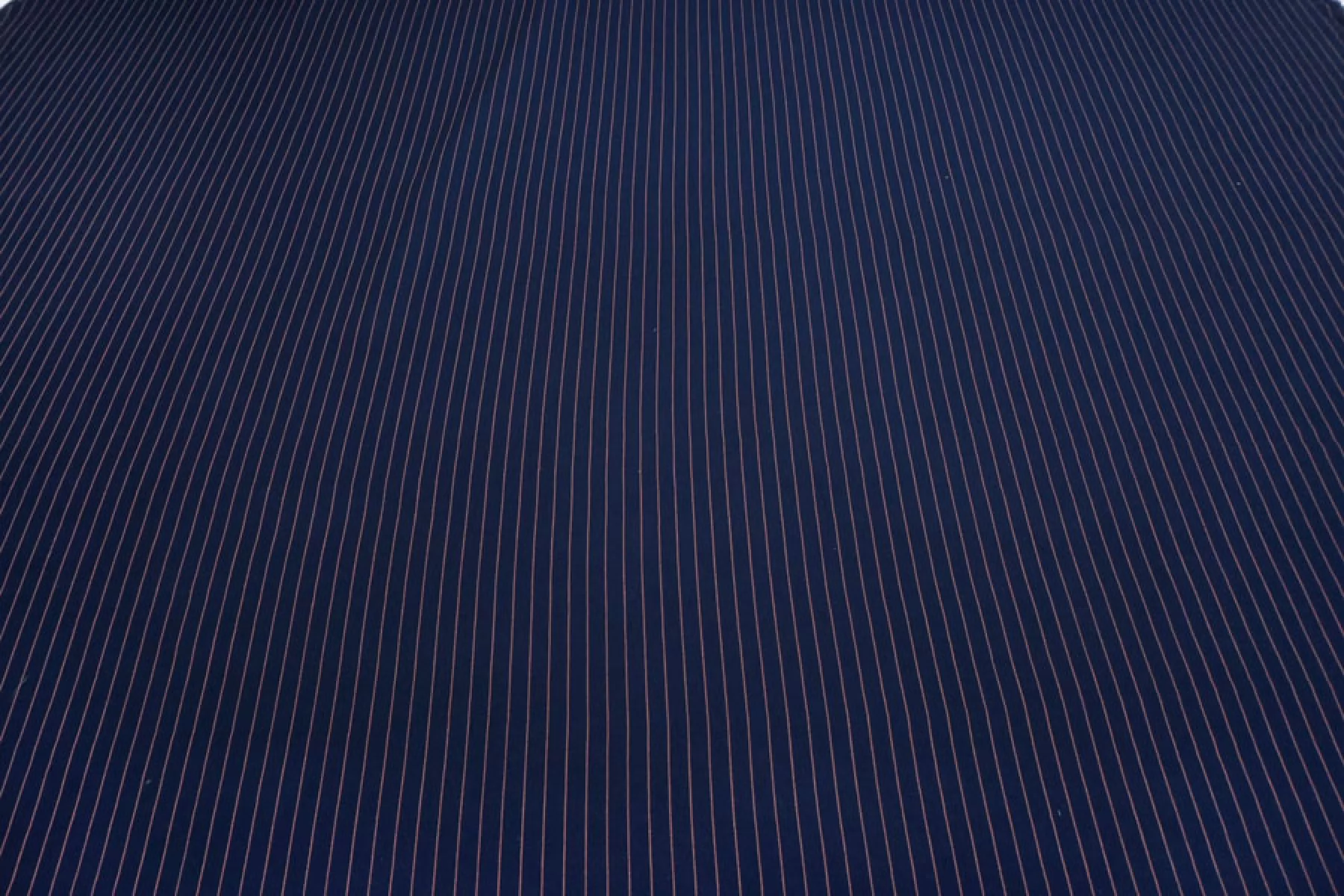 Прекрасный плательно-рубашечный хлопок в полоску, которая расположена вдоль кромки. Основной цвет тёмно-синий, плюс тонкие полосы белого и розового цвета. Материал очень приятный, мягкий. Изнаночная сторона чуть ворсистая. Не очень толстый но при этом достаточно плотный. Не просвечивает, не тянется. Мнется. Пластичный, форму практически не держит. Отличный вариант на рубашки, платья, юбки, лёгкие брюки или шорты, летние костюмы.