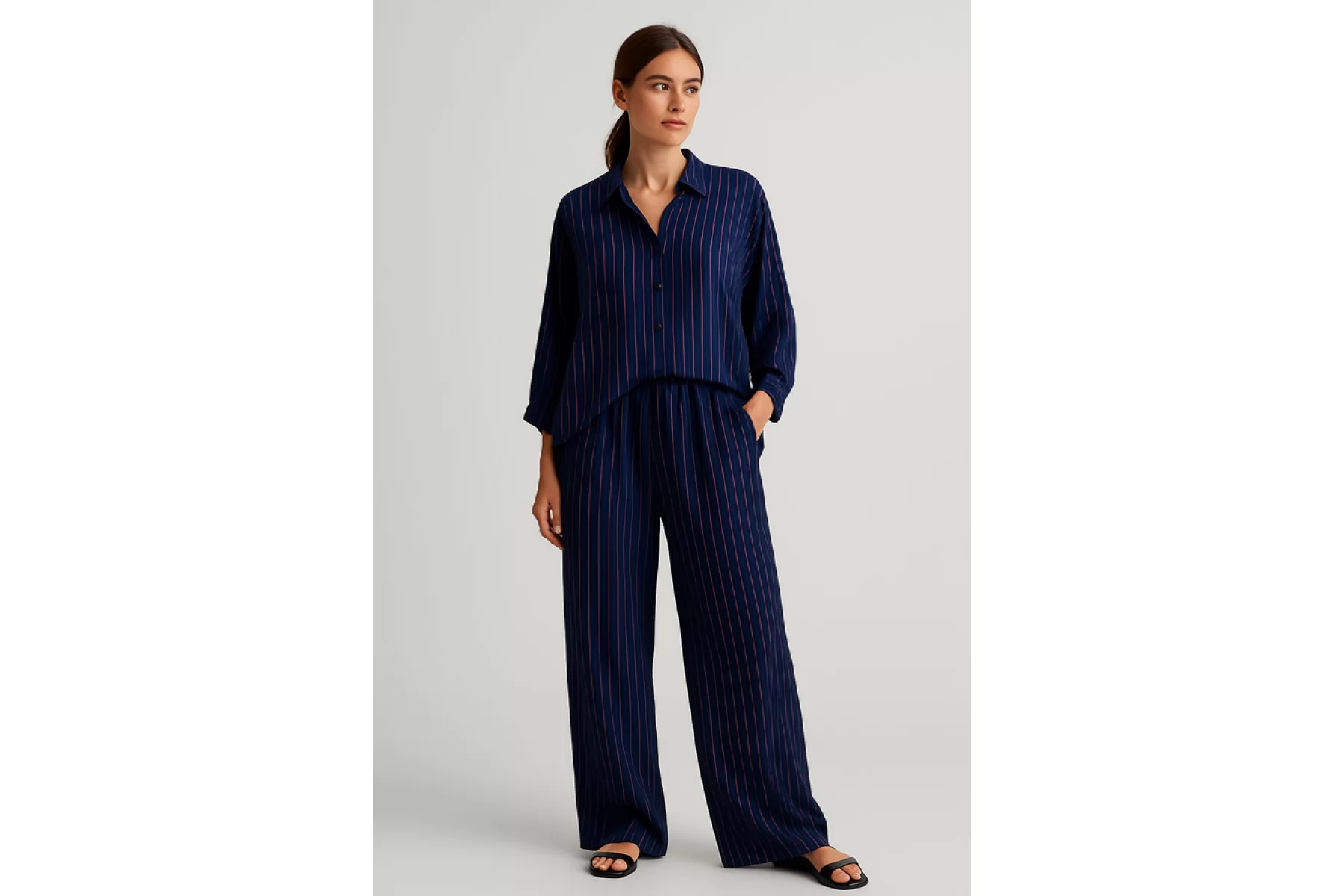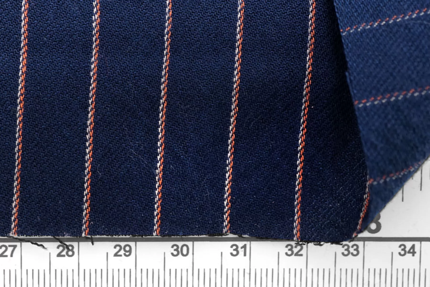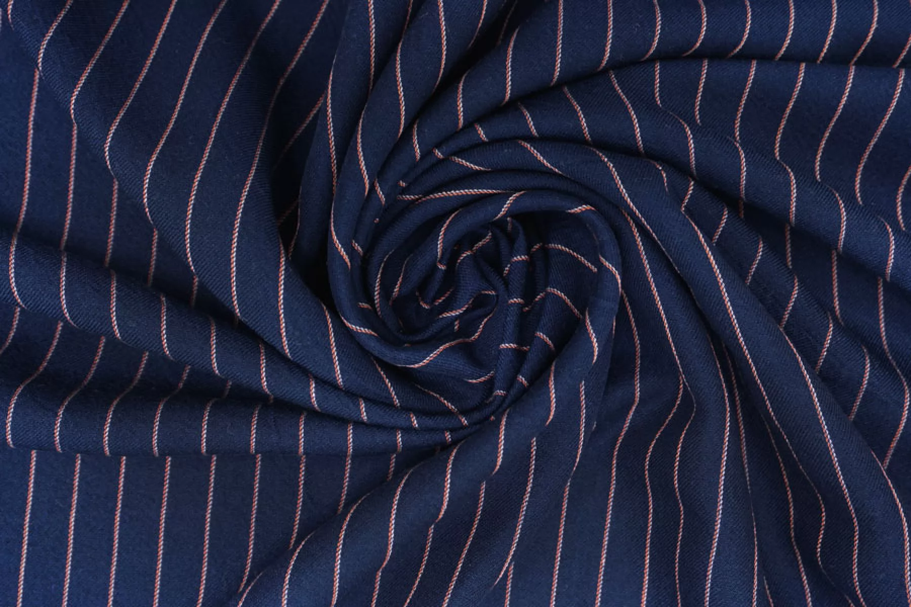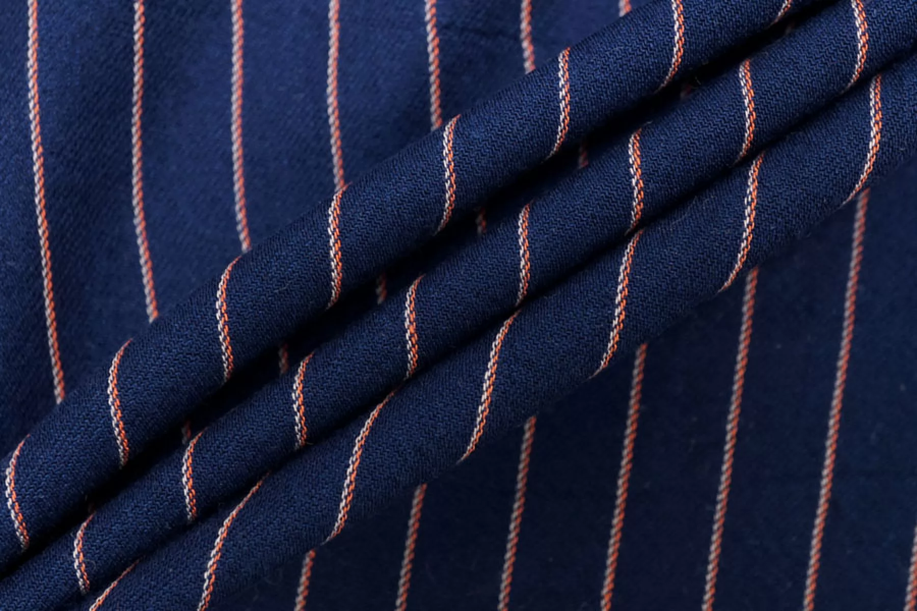 Прекрасный плательно-рубашечный хлопок в полоску, которая расположена вдоль кромки. Основной цвет тёмно-синий, плюс тонкие полосы белого и розового цвета. Материал очень приятный, мягкий. Изнаночная сторона чуть ворсистая. Не очень толстый но при этом достаточно плотный. Не просвечивает, не тянется. Мнется. Пластичный, форму практически не держит. Отличный вариант на рубашки, платья, юбки, лёгкие брюки или шорты, летние костюмы.