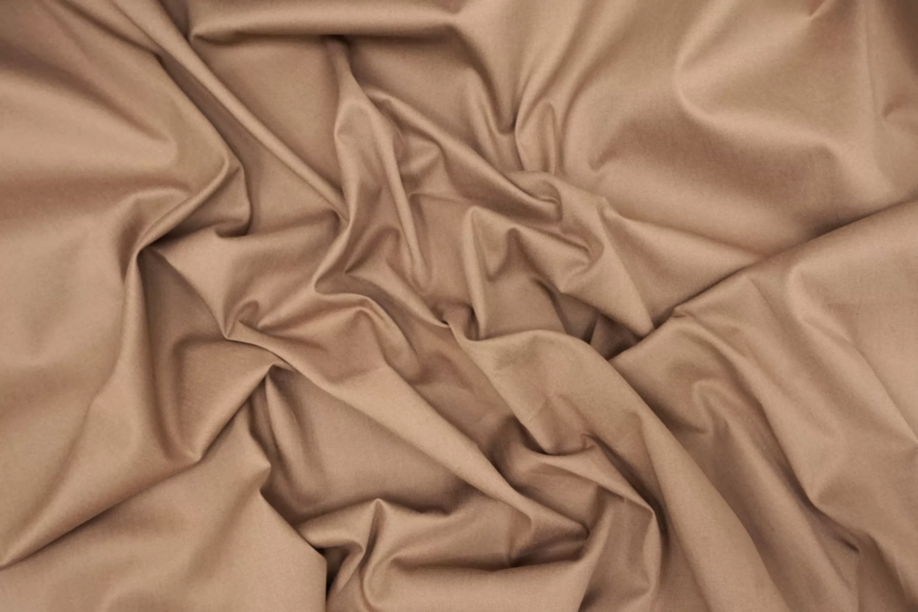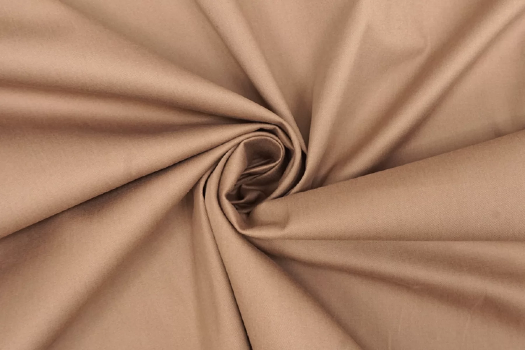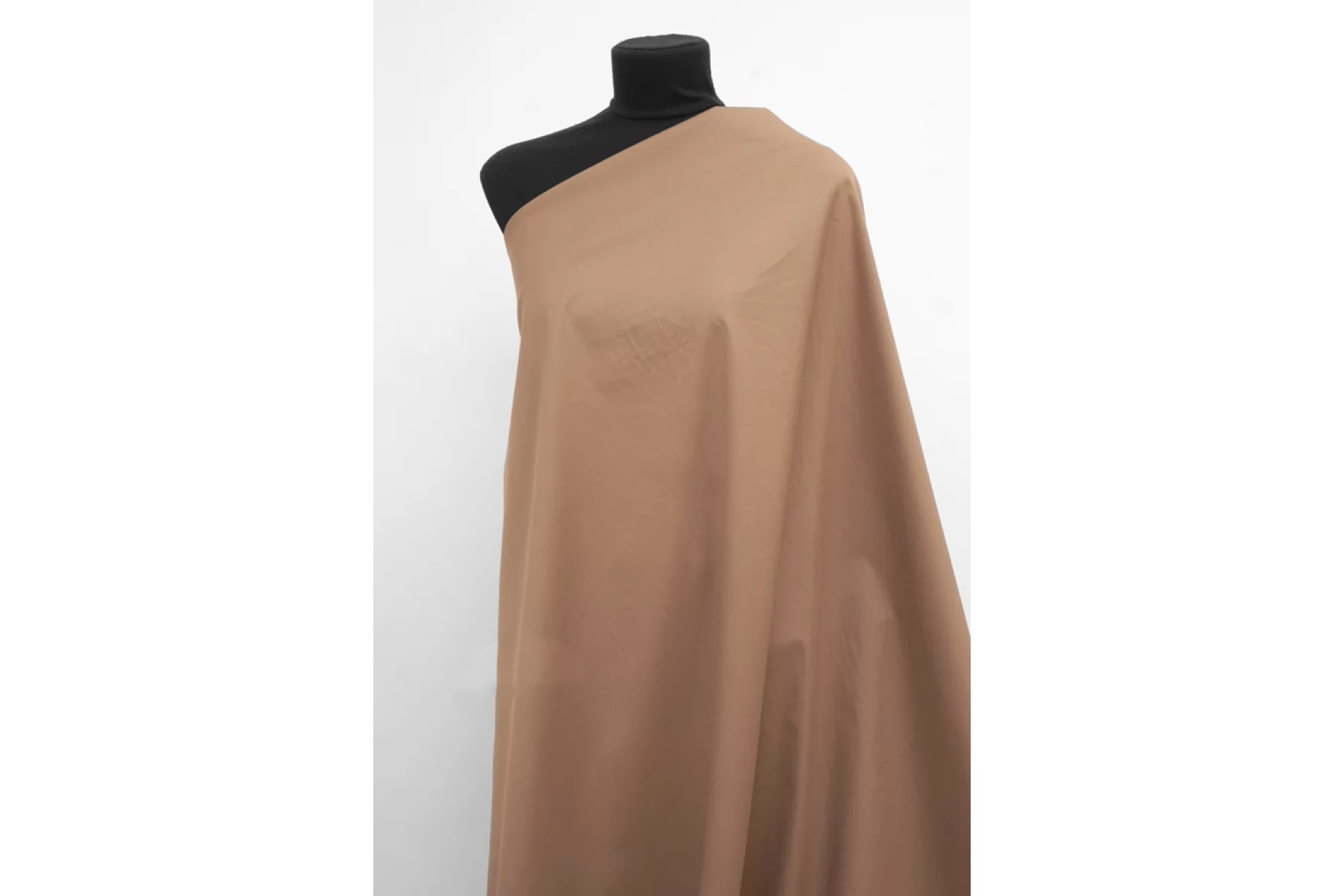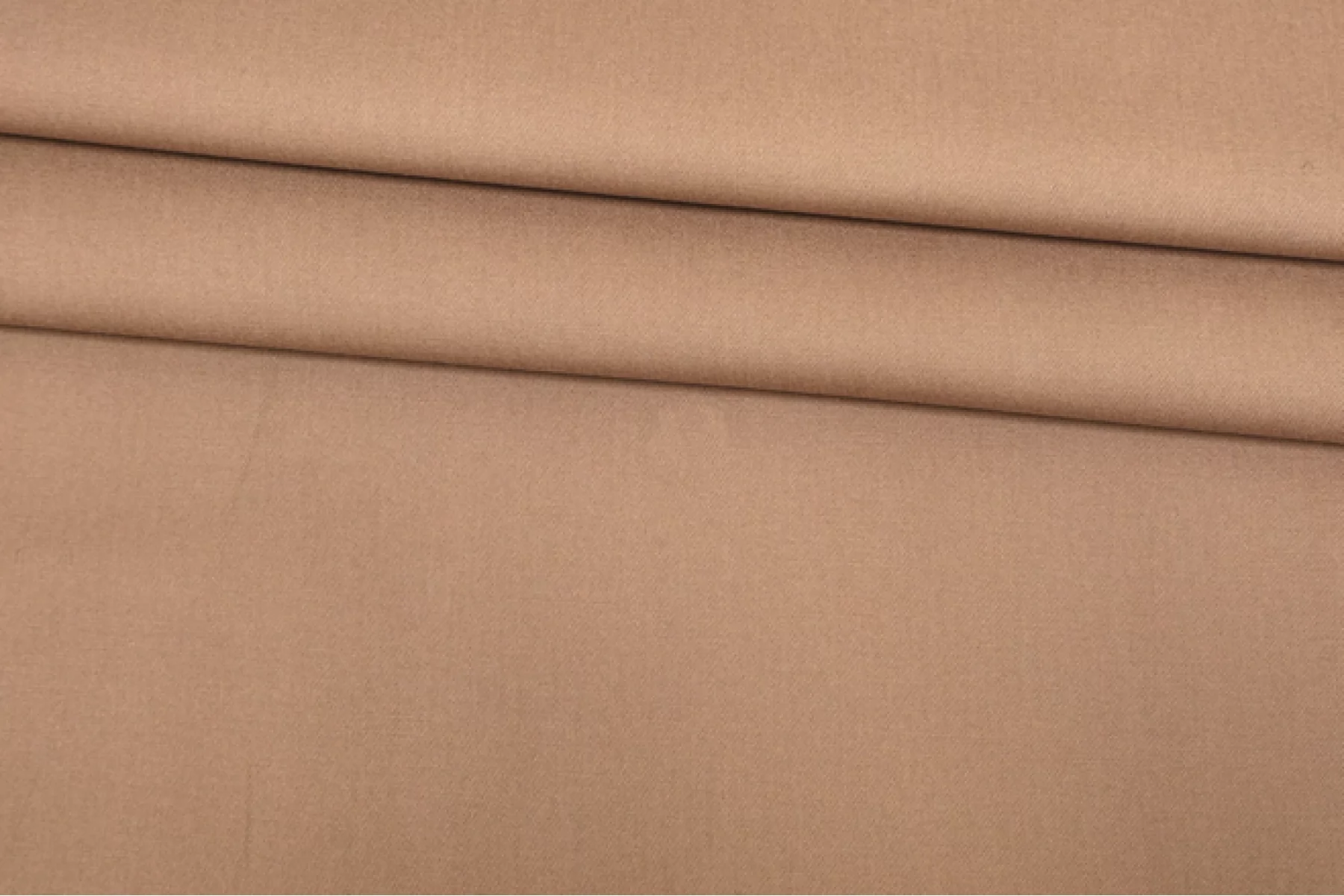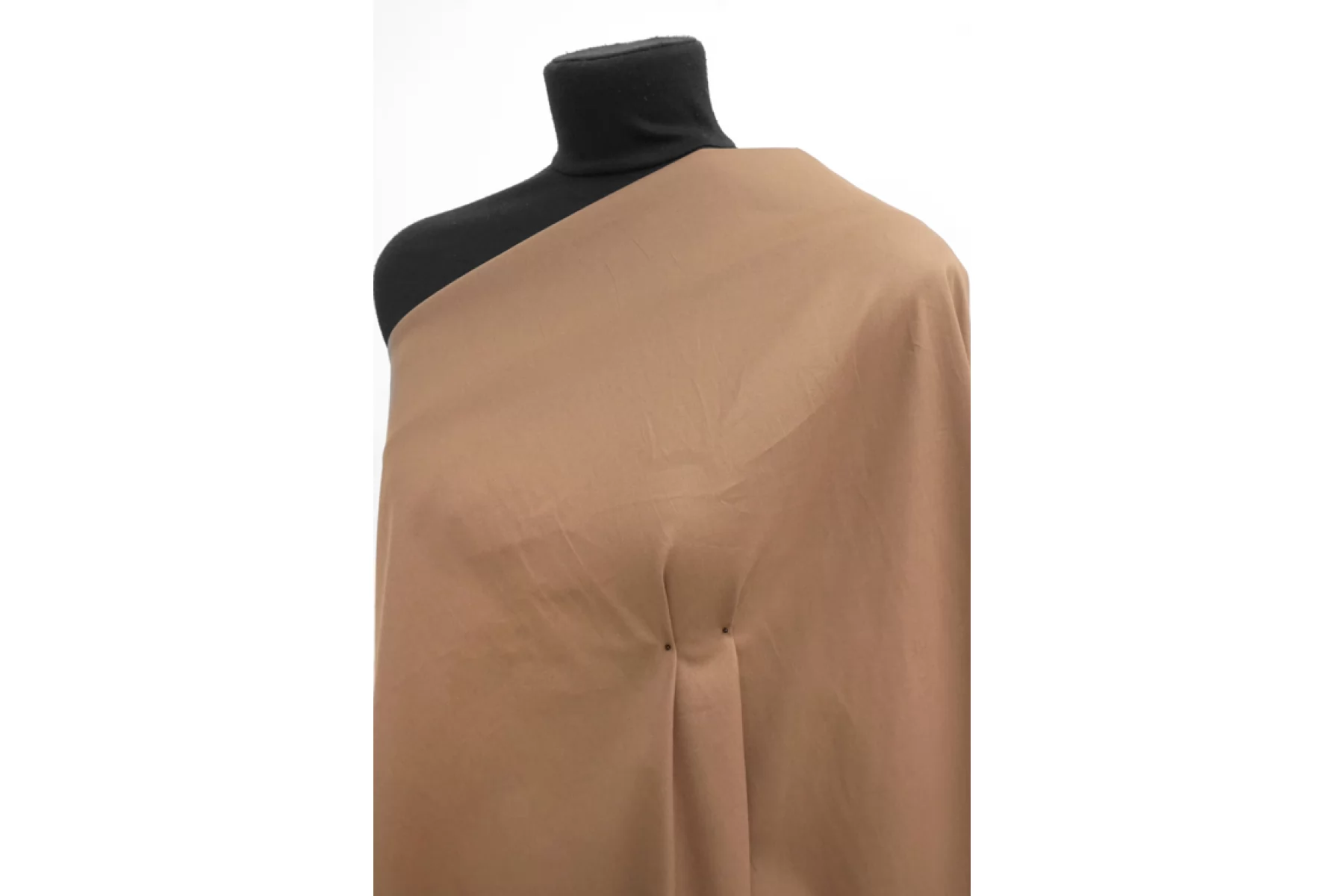 Плательный хлопок диагонального плетения необычного бежево-коричневого оттенка. Тактильно приятный, мягкий, пластичный. Обладает легким лоском. Достаточно плотненький, при этом тонкий. Не просвечивает. Сминается. Хорошо тянется за счет содержания эластана. Хорошо драпируется. Отлично держит форму. Вариант на платья, юбки, брюки, жакеты и не только.