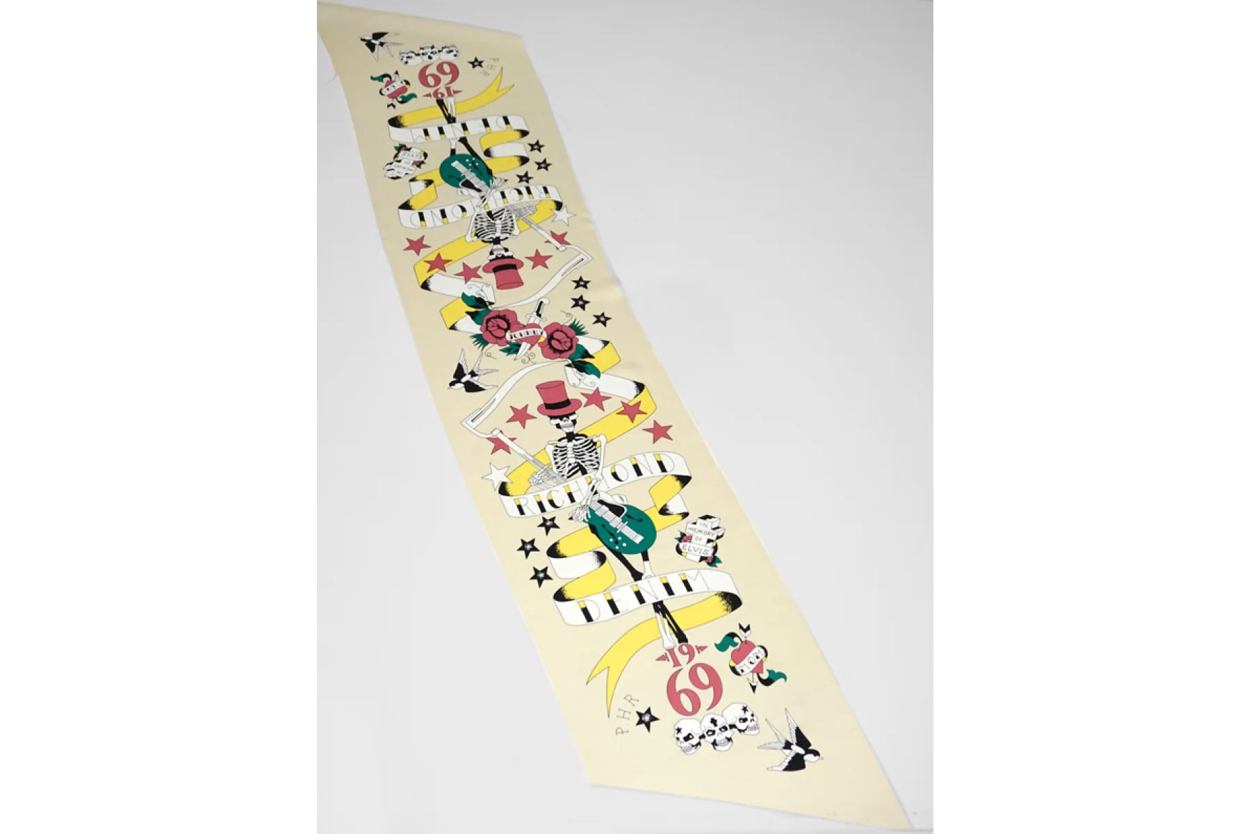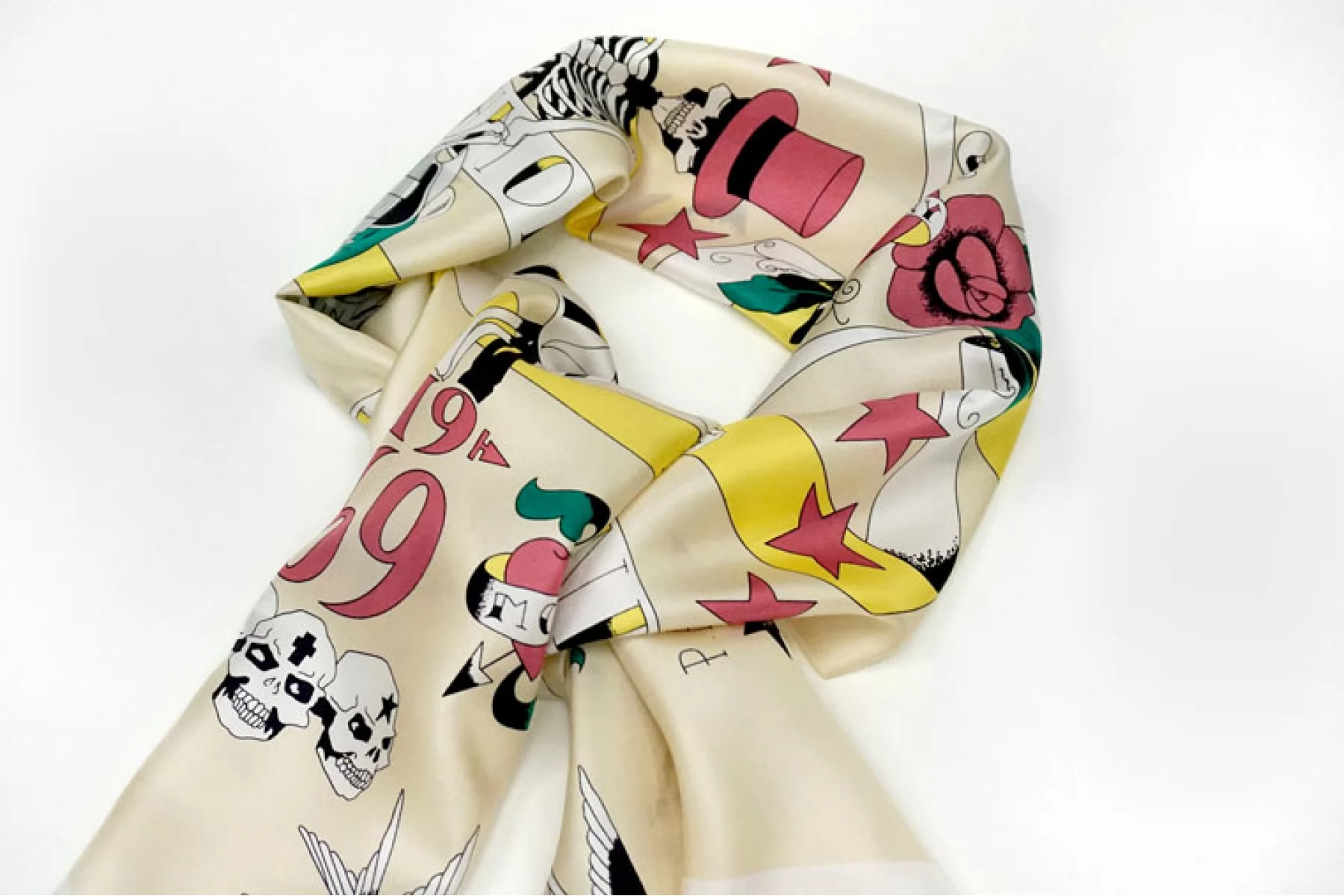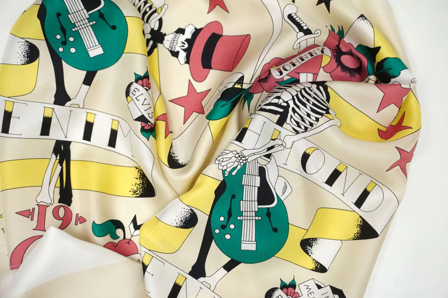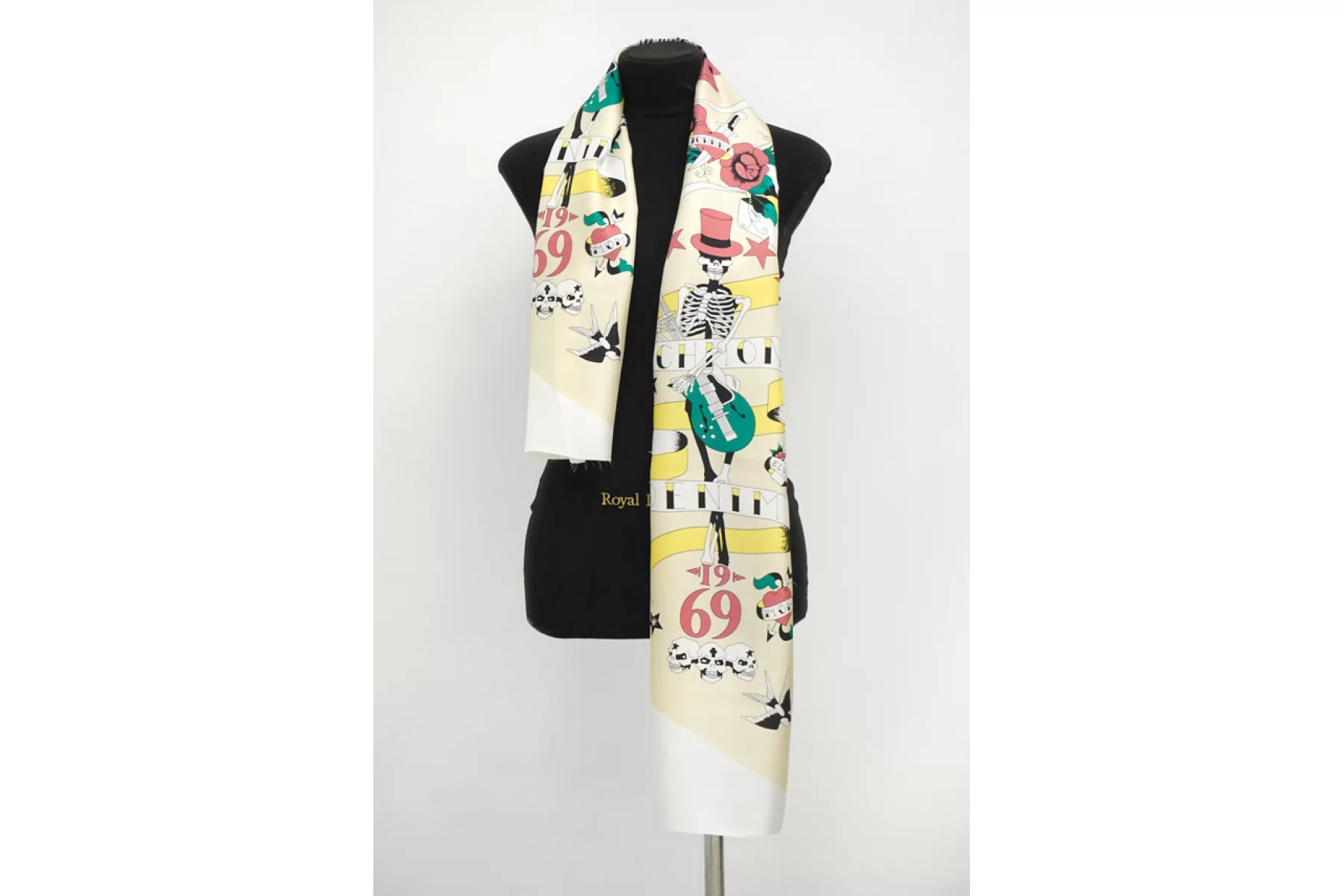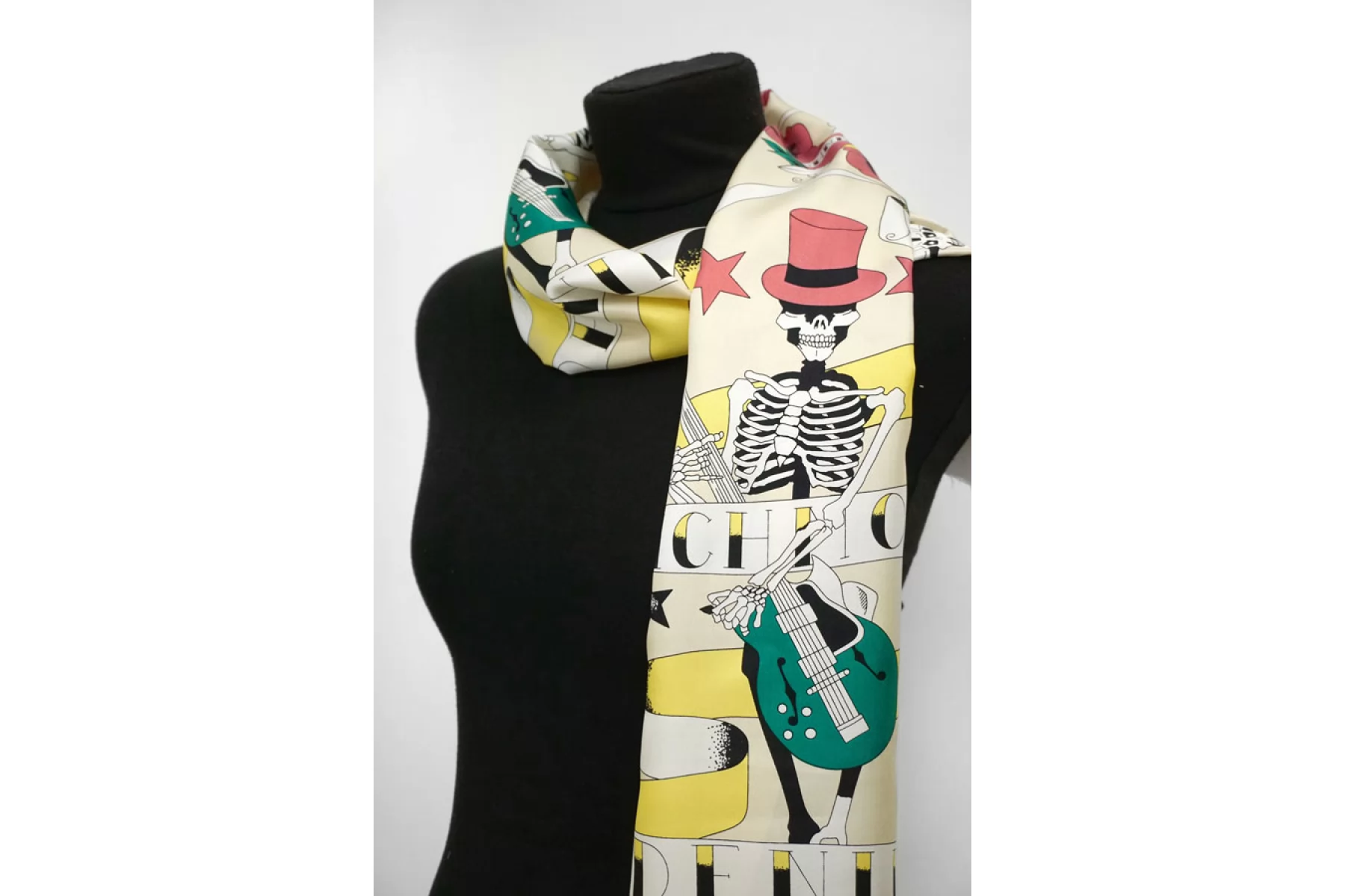 ВНИМАНИЕ! Цена указана за один платок 32*154 см! Красивый, шелковый твиловый платок из лимитированной коллекции от бренда John Richmond в светло-бежевом оттенке. Принт в виде скелета с зеленой гитарой в стиле Элвиса. Материал приятный, мягкий, скользящий. С легким лоском. Немного просвечивает. Форму не держит, красиво драпируется. Практически не мнется. Края имеют небольшой скос. Уход, как и за любым шелком, деликатный.