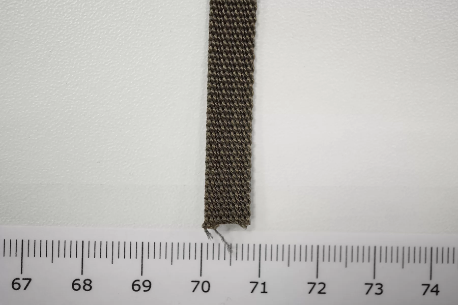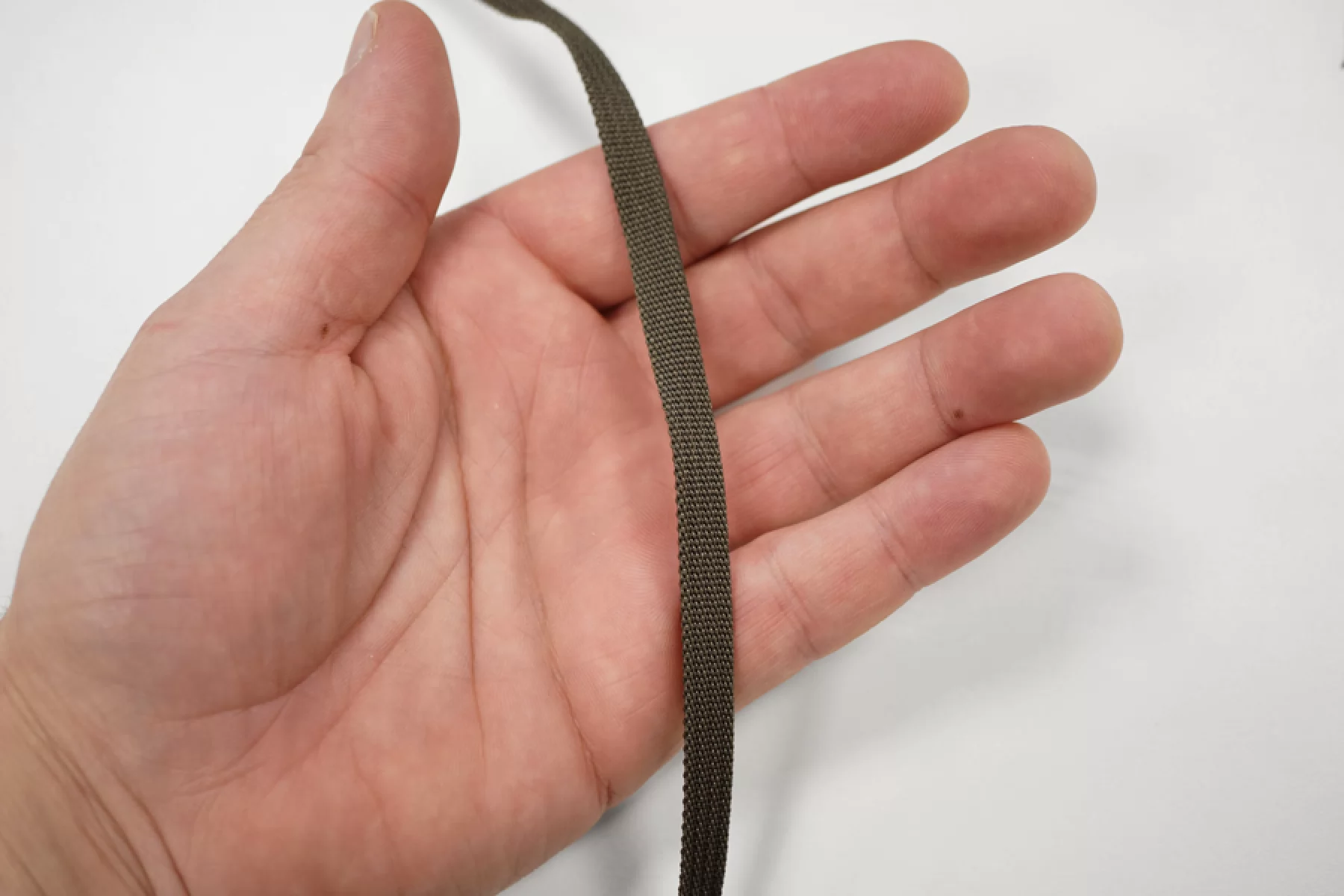 Плоский синтетический шнур в темном цвете хаки. Толщина около 1мм, ширина 7 мм, плотный, не очень пластичный.
