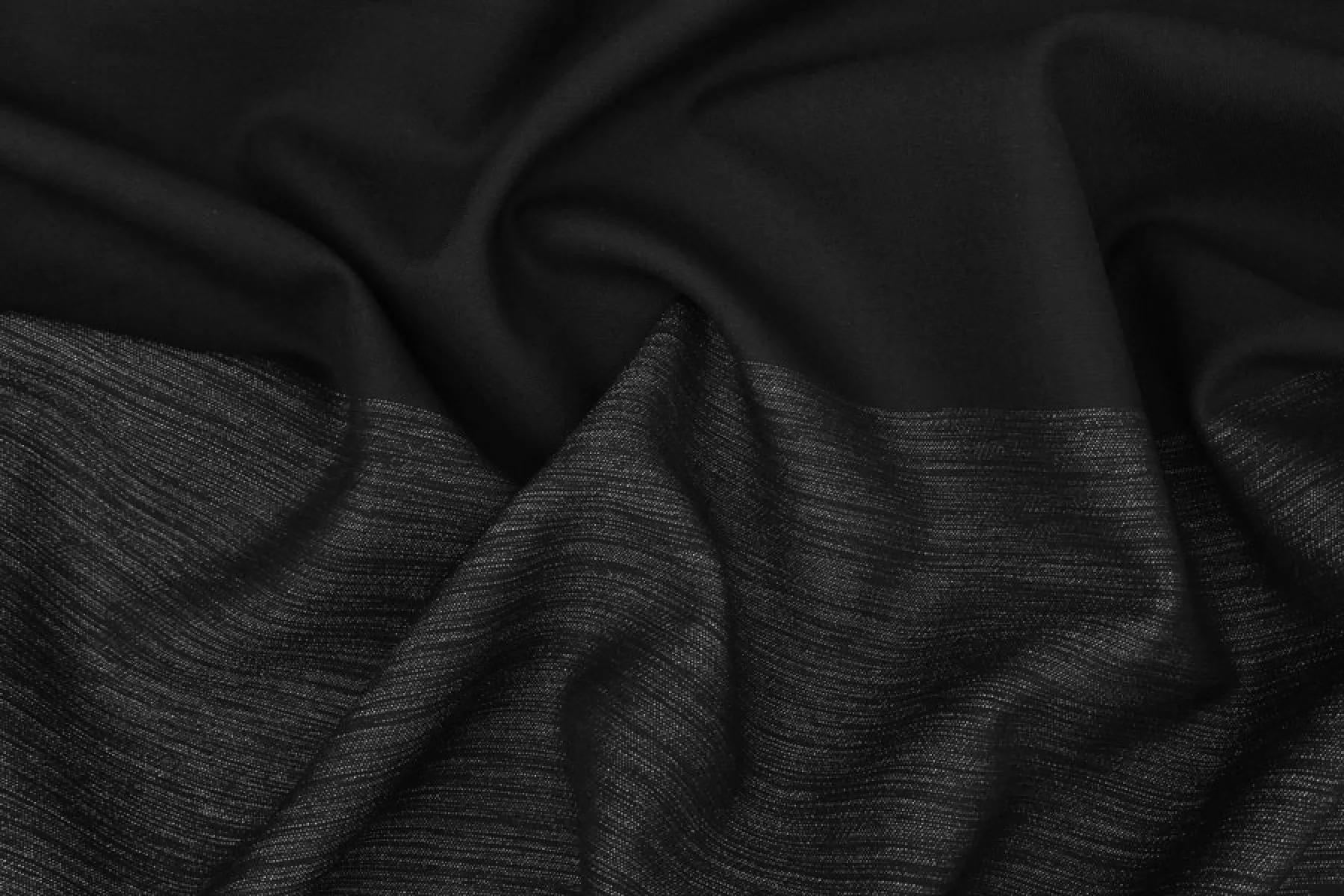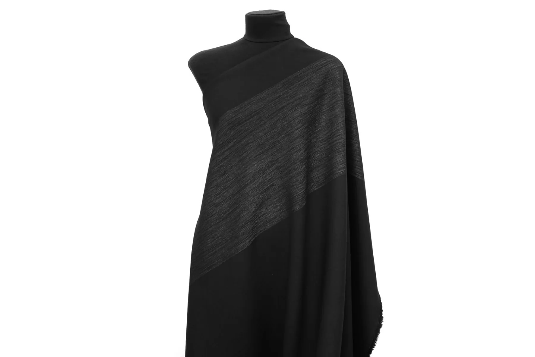 Итальянская плотная костюмная шерсть черного цвет диагонального плетения. Толстенькая, примерно 0,8 мм толщиной. Шероховатая, совсем слегка суховатая, чувствуется плетение наощупь. Плотная, форму не держит, не просвечивает, совсем немножко тянется. Подойдет для пошива жакета, теплой юбки, костюма, брюк. Уход деликатный.