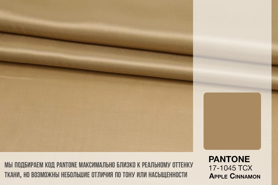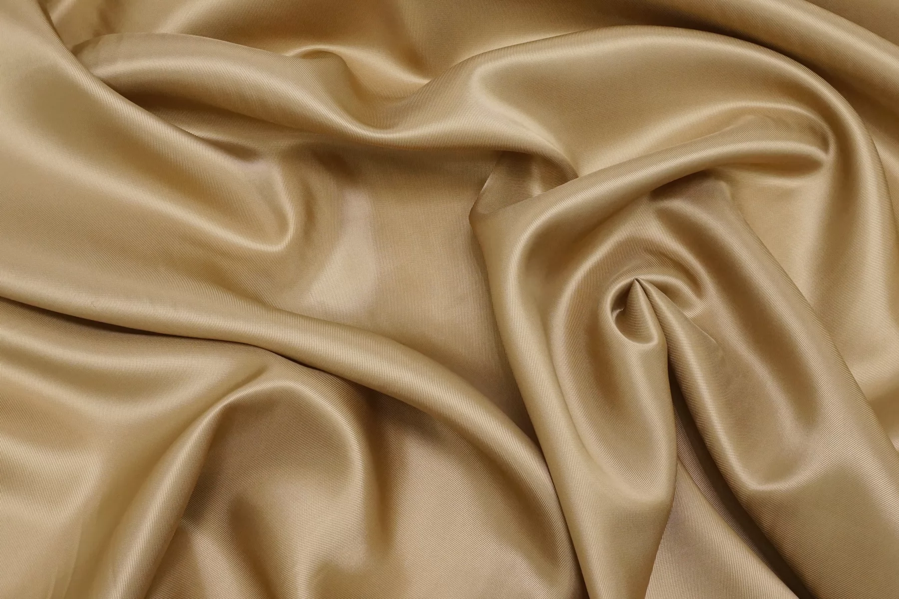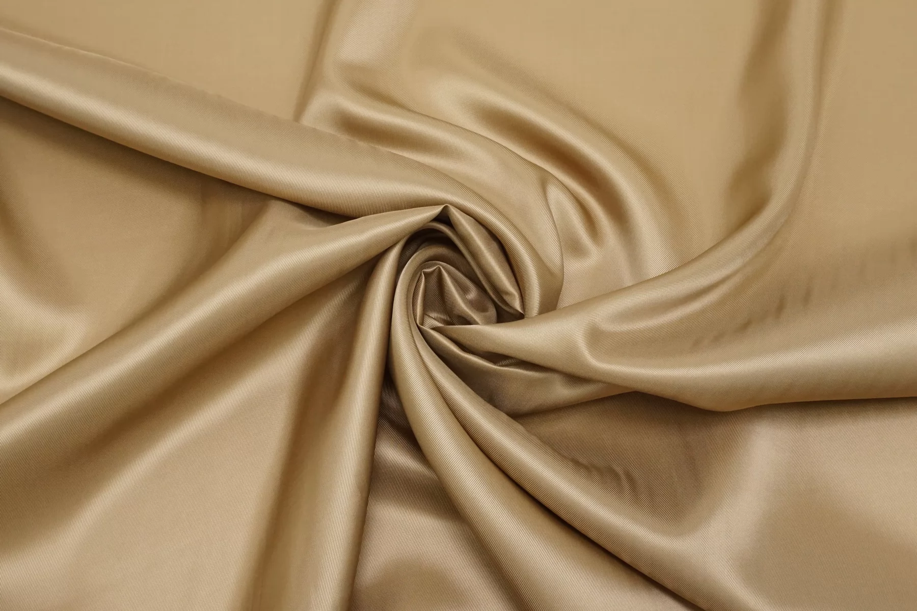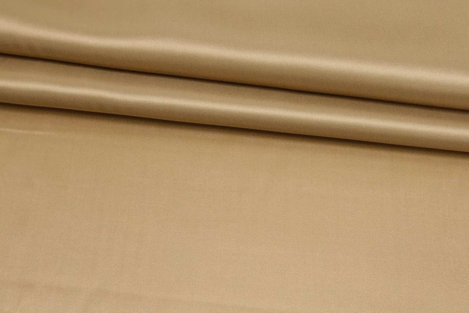 Подкладочная вискоза красивого бежевого оттенка кэмел, саржевое плетение. Гладкая, тонкая, обладает красивым лоском. Не тянется. Мнется. Подойдет как подкладочный материал к костюмной группе, демисезонным пальто, курткам. Обязательно учитывайте возможную усадку 5-10%