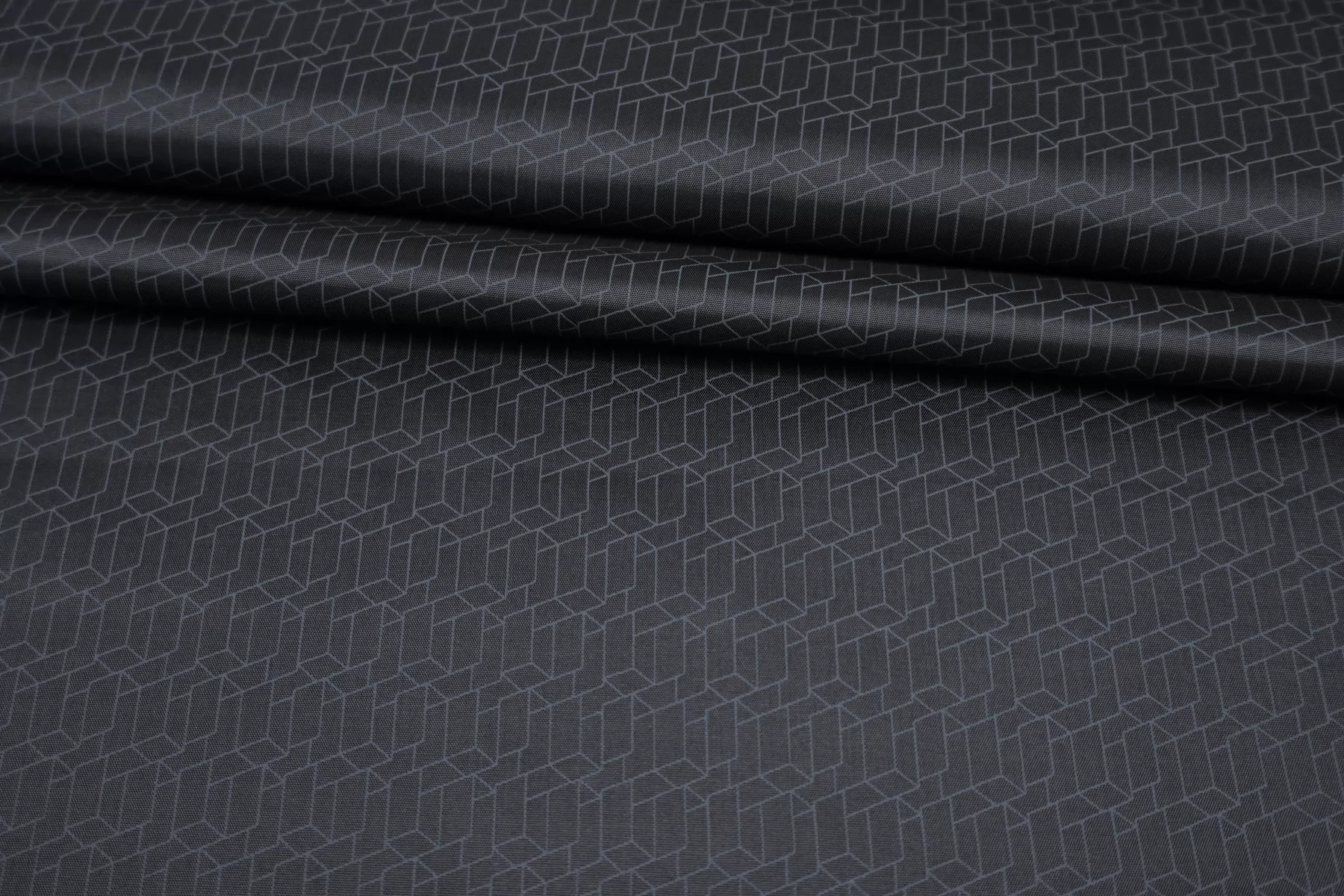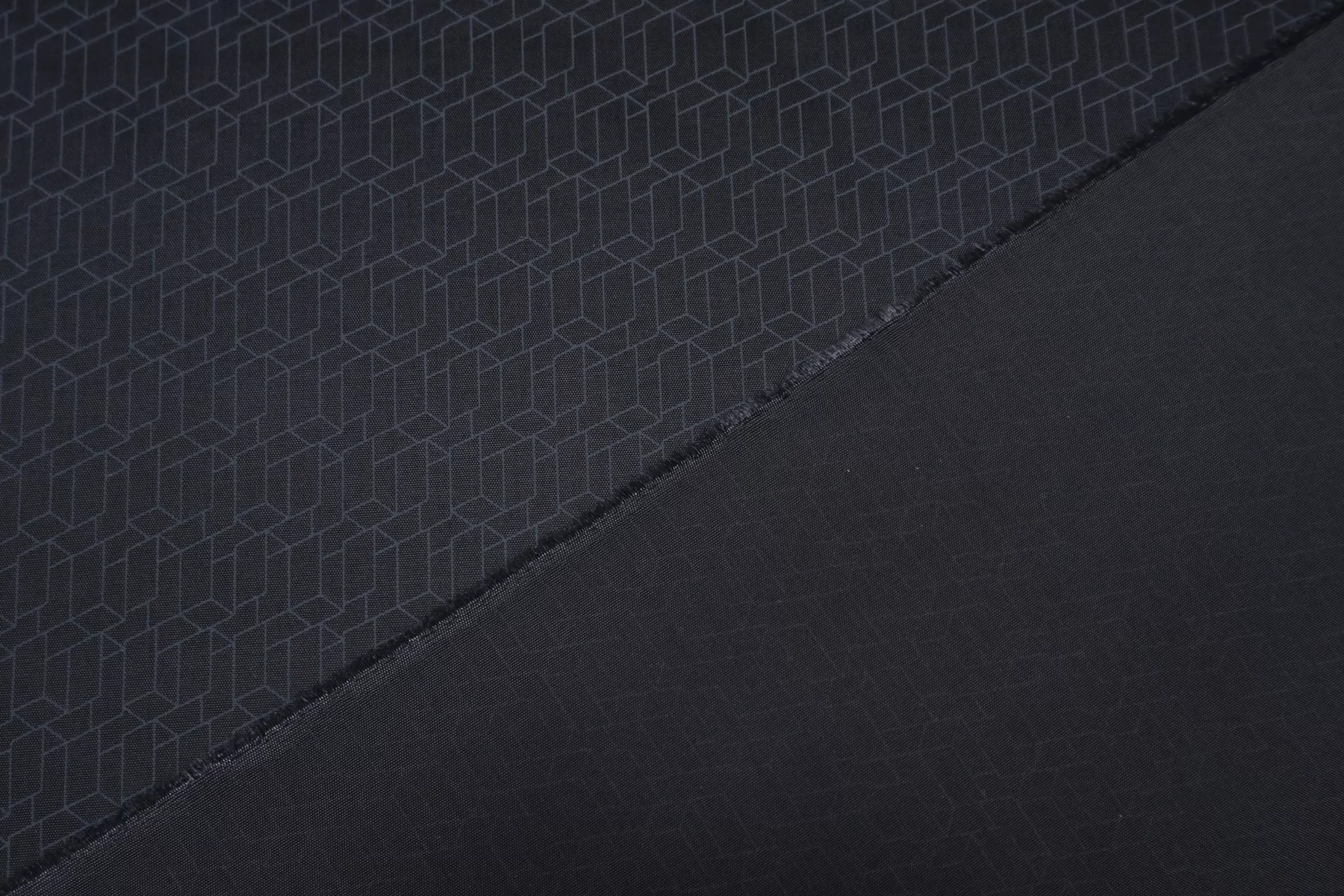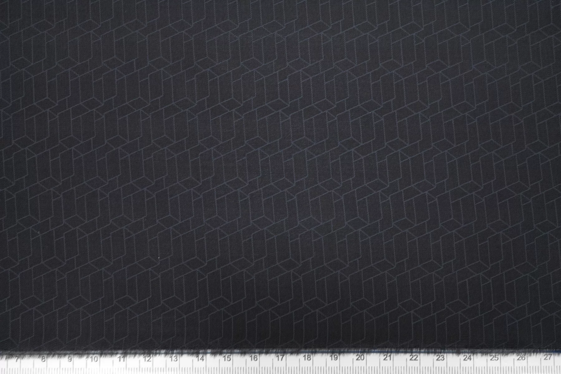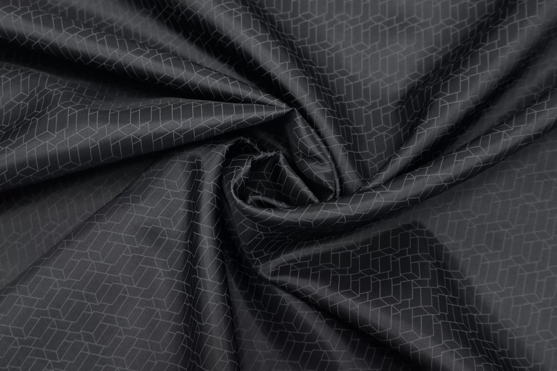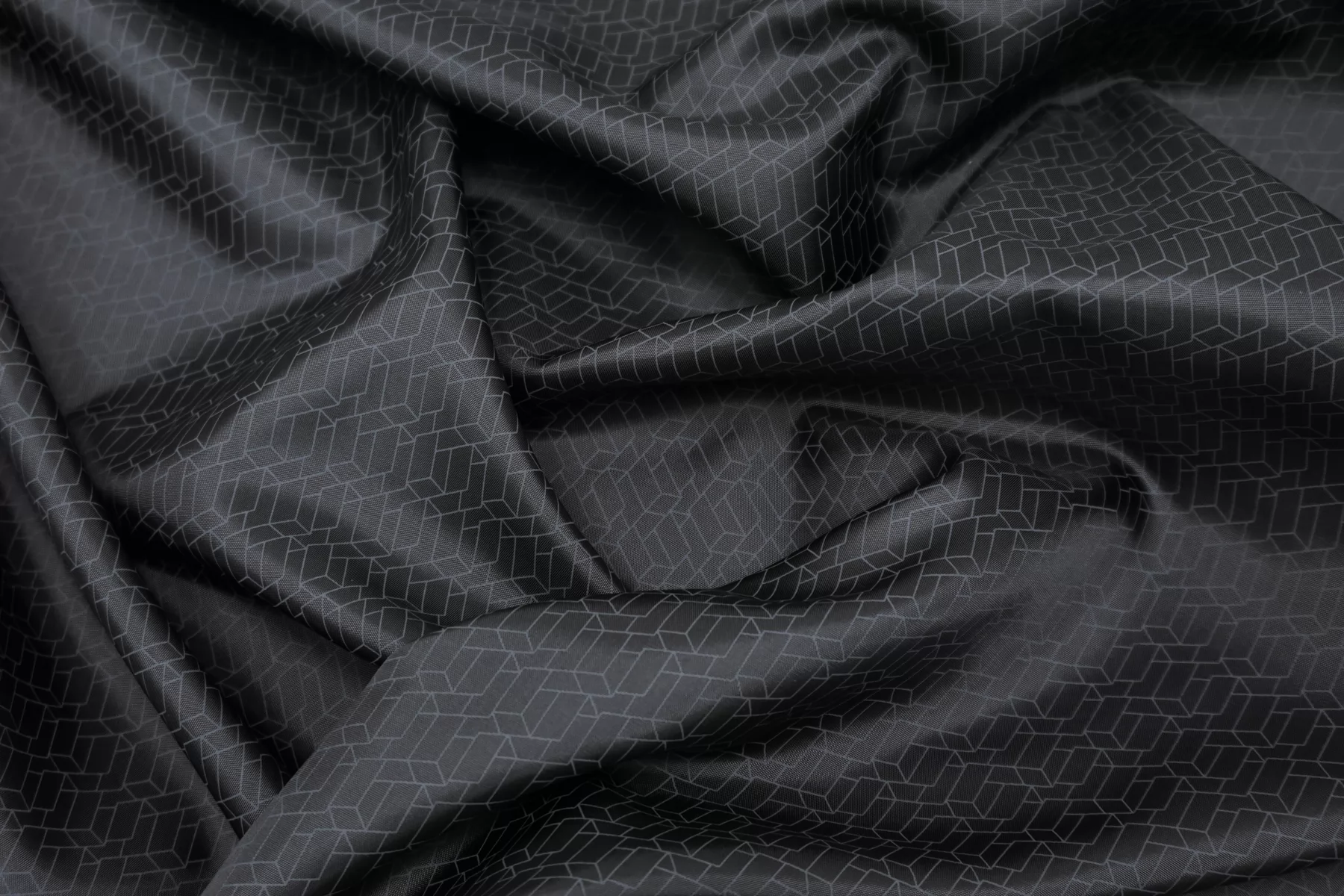 Подкладочная итальянская вискоза с геометрическим принтом тонкой серой линией на тёмно-сером, почти чёрном фоне, плетение полотняное. Шелковистая, обладает легким блеском, тонкая. Подойдет на подкладку к костюмно-плательной группе.