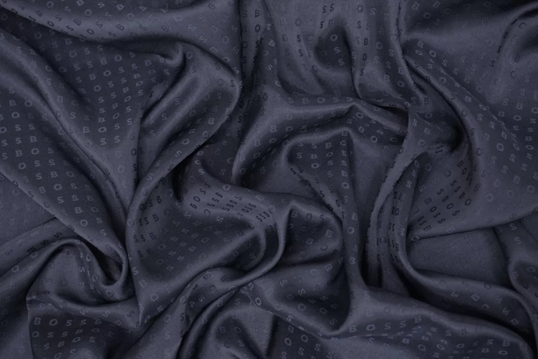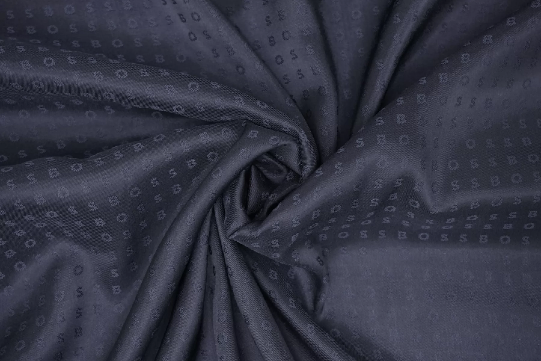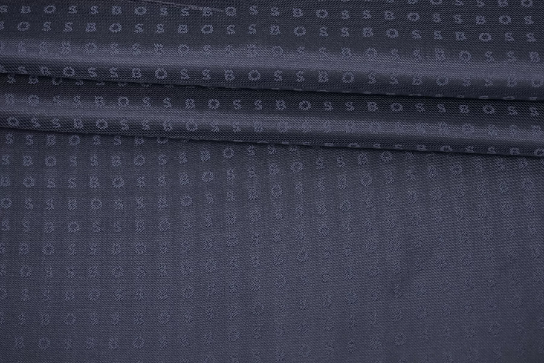 Жаккардовая подкладочная вискоза BOSS стрейч темно-синего оттенка, диагонального плетения с выработкой букв логотипа ( высота букв ~5 мм). Тактильно приятная, мягкая. Неплохо тянется за счет эластана. Просвечивает силуэт. Достаточно тонкая и легкая. Шелковистая, обладает приятным лоском. Немного мнется. Форму не держит. Отличный вариант подкладки к костюмно-плательной группе. Обязательно учитывайте возможную усадку 5-10%