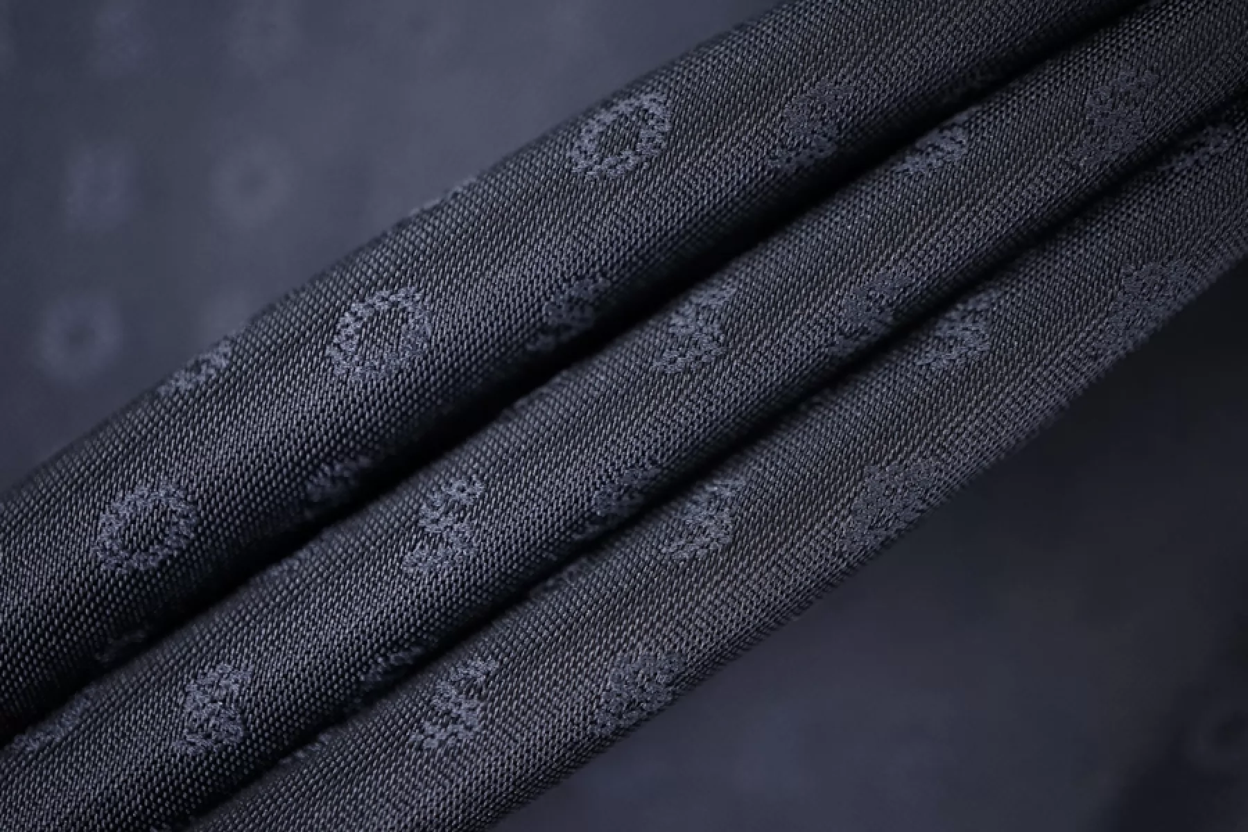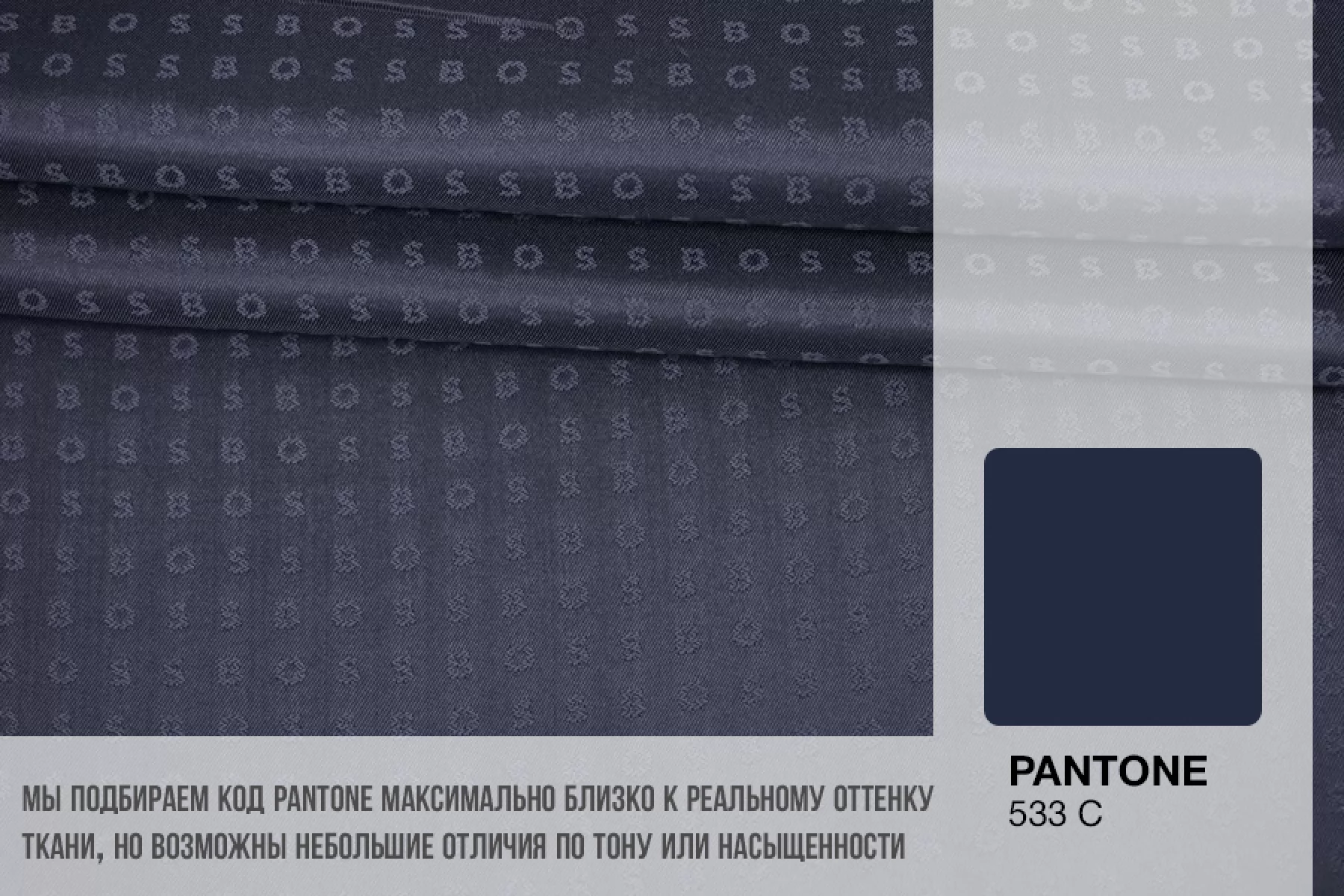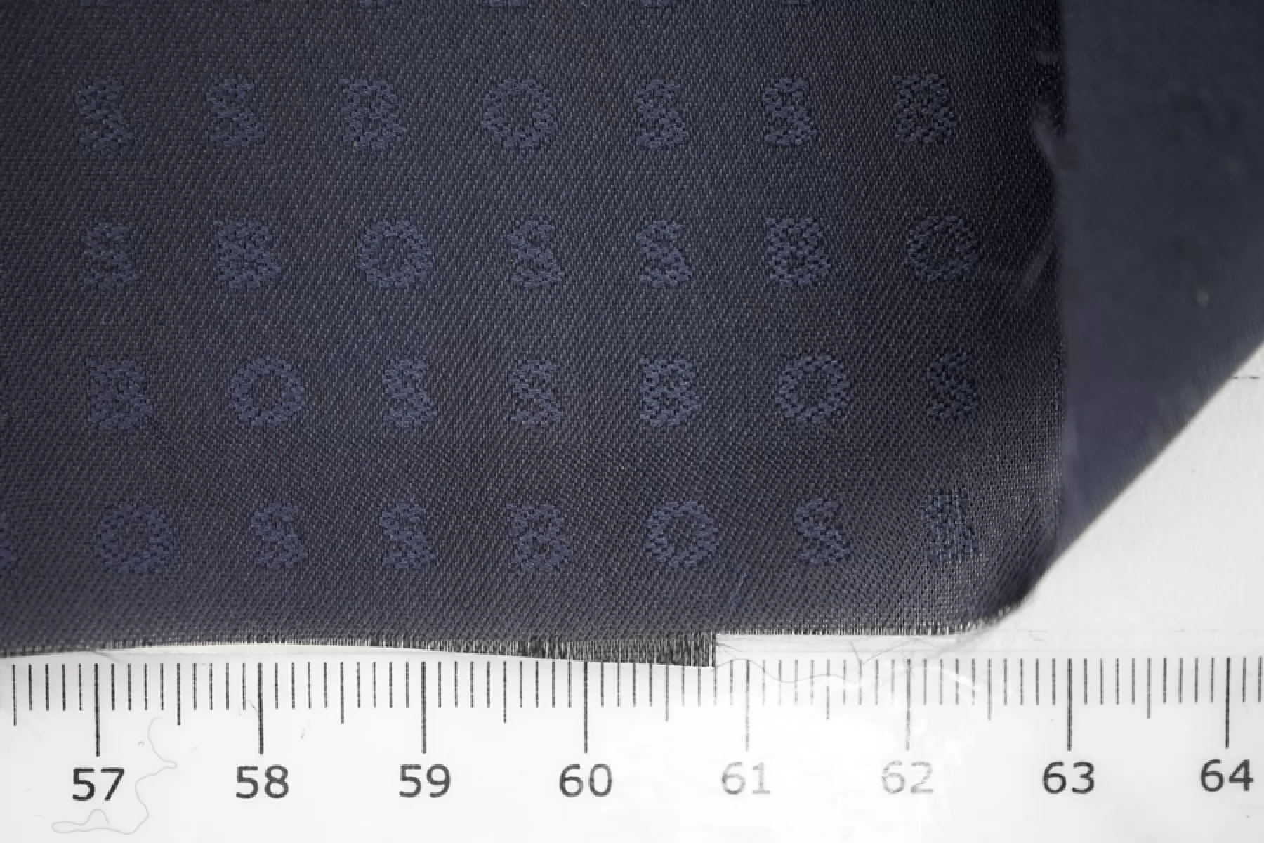 Жаккардовая подкладочная вискоза BOSS стрейч темно-синего оттенка, диагонального плетения с выработкой букв логотипа ( высота букв ~5 мм). Тактильно приятная, мягкая. Неплохо тянется за счет эластана. Просвечивает силуэт. Достаточно тонкая и легкая. Шелковистая, обладает приятным лоском. Немного мнется. Форму не держит. Отличный вариант подкладки к костюмно-плательной группе. Обязательно учитывайте возможную усадку 5-10%