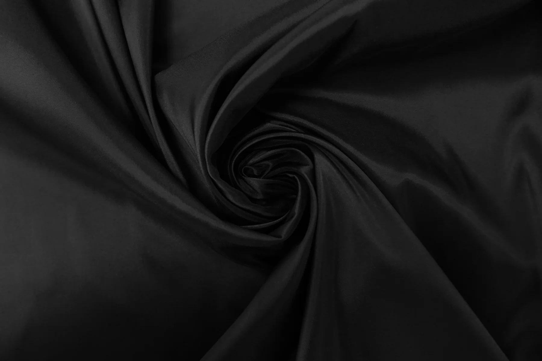 Подкладочная вискоза стрейч чёрного цвета с элитом в составе. Гладкая, тонкая, обладает легким красивым лоском. Тянется. Мнется. Подойдет как подкладочный материал к костюмно-плательной группе. Обязательно учитывайте возможную усадку 5-10%