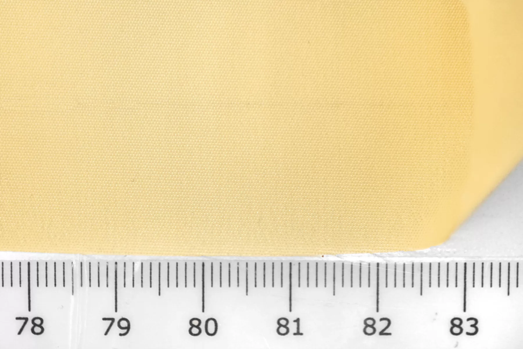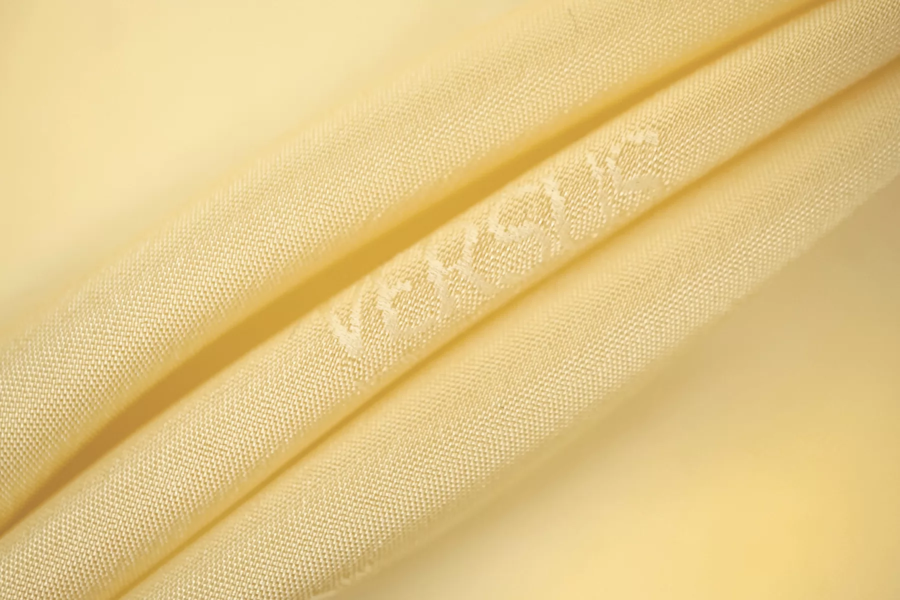 Подкладочная вискоза Versus Versace, стрейч, желтого оттенка, с жаккардовой выработкой логотипа. Тактильно суховатая, слегка шероховатая, мягкая, обладает легким красивым лоском. Немного тянется за счет эластана. Просвечивает силуэт. Мнется. Форму держит слабо. Подойдет как подкладочный материал к костюмно-плательной группе. Обязательно учитывайте возможную усадку 5-10%