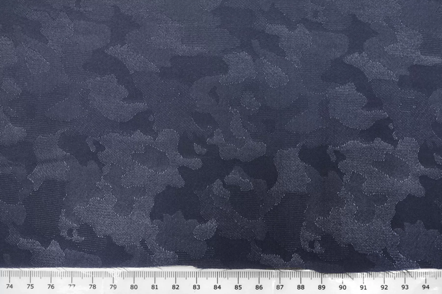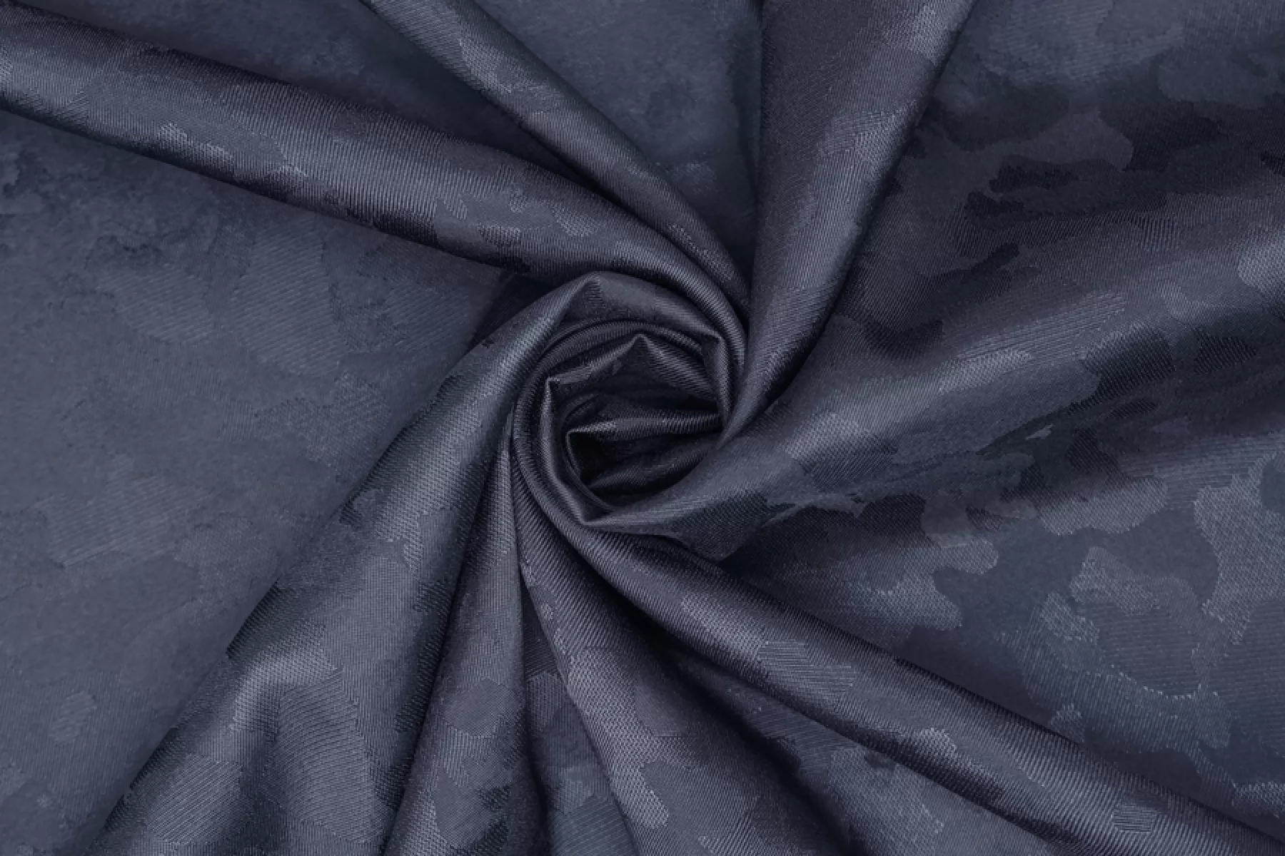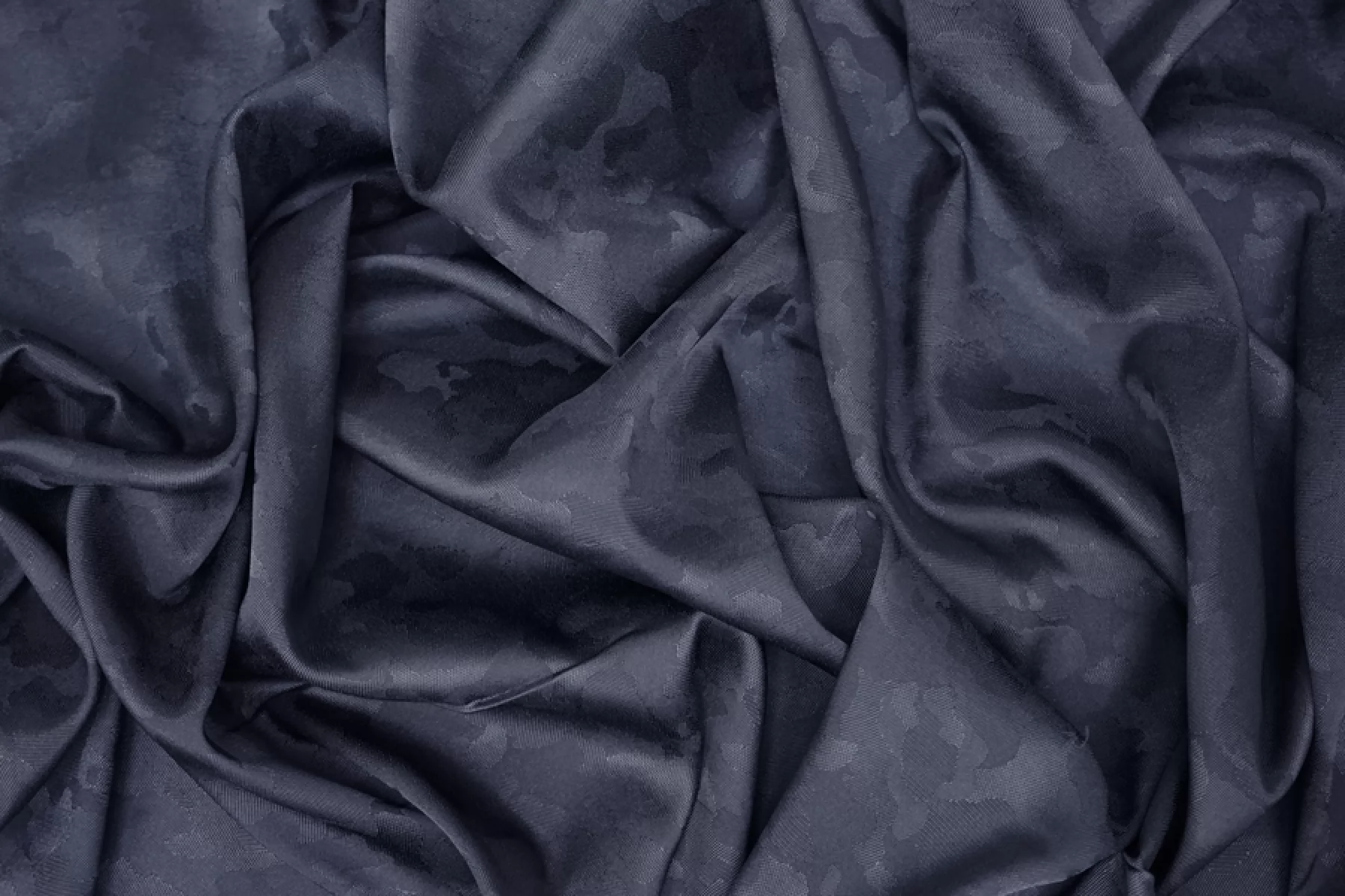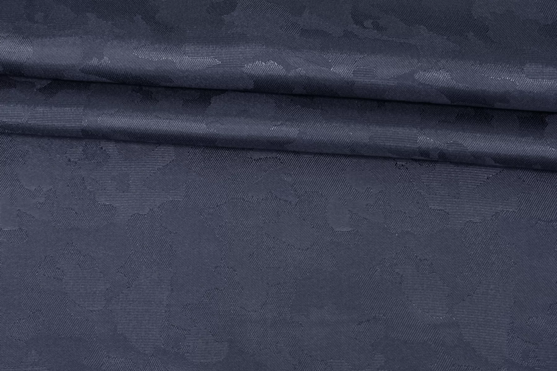 Жаккардовая подкладочная вискоза стрейч темно-синего глубокого оттенка и с абстрактной выработкой пятен. Тонкая, мягкая. Хорошо тянется за счет эластана. Просвечивает силуэт. Шелковистая, обладает приятным лоском. Мнется. Форму держит слабо. Прекрасный вариант подкладки к костюмно-плательной группе. Обязательно учитывайте возможную усадку 5-10%