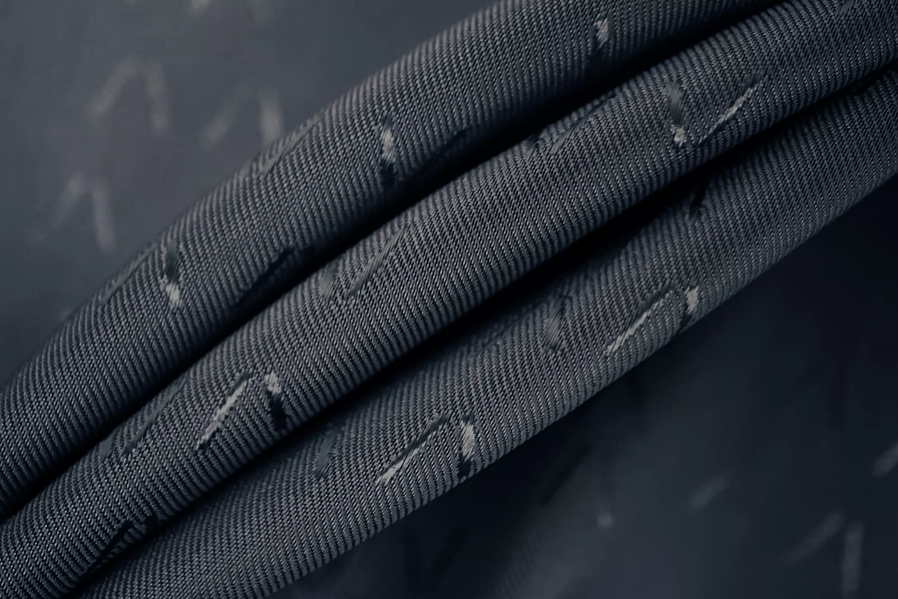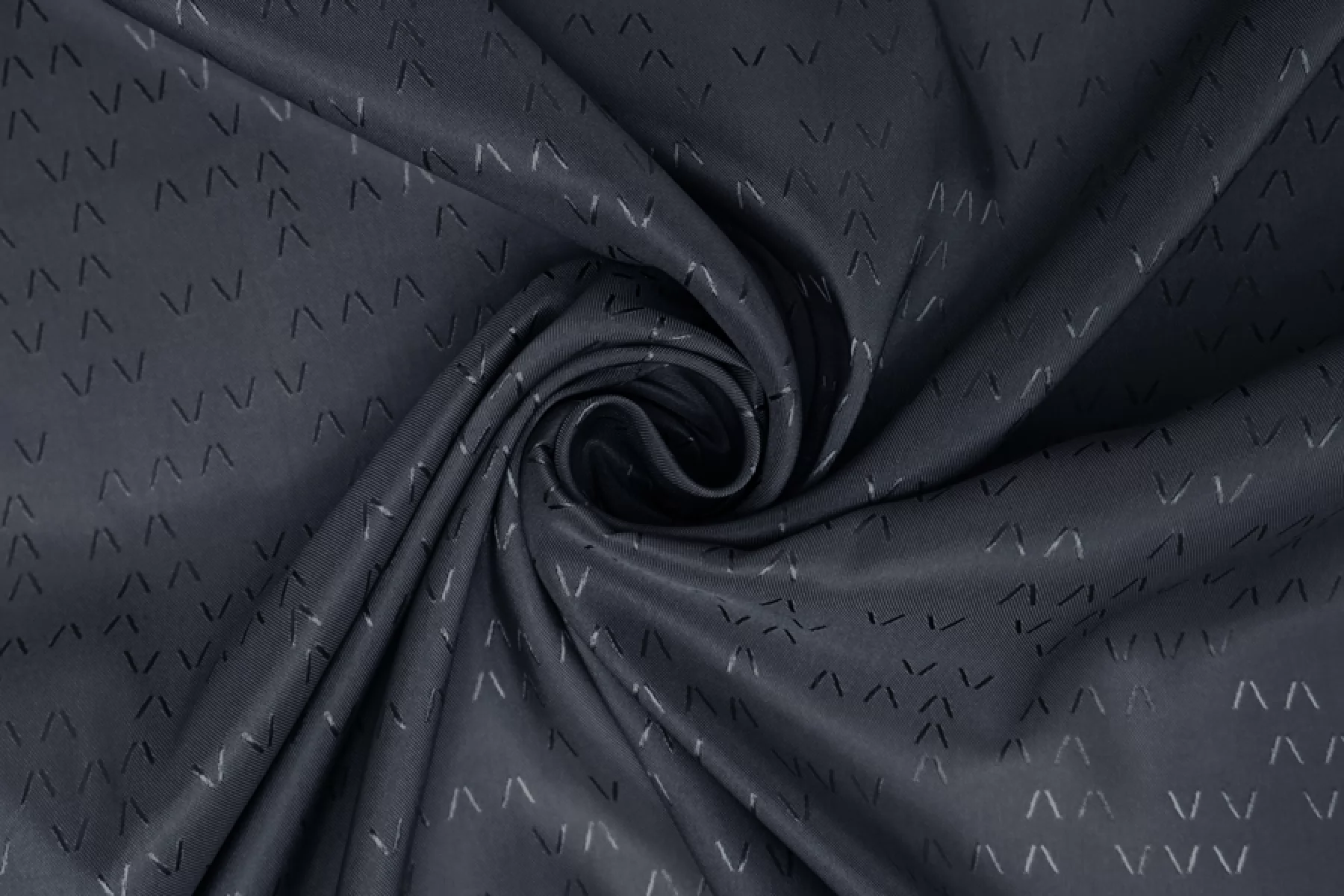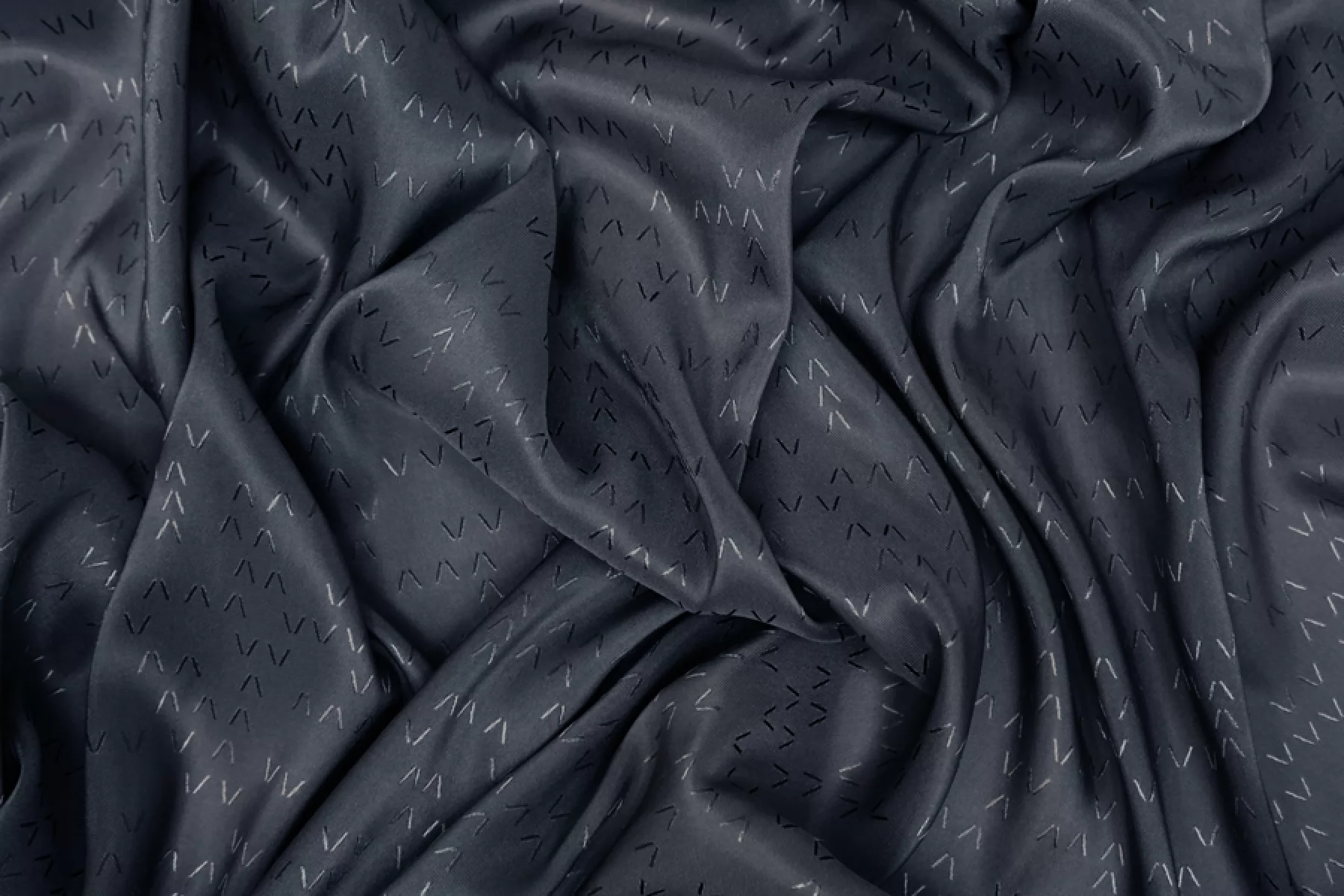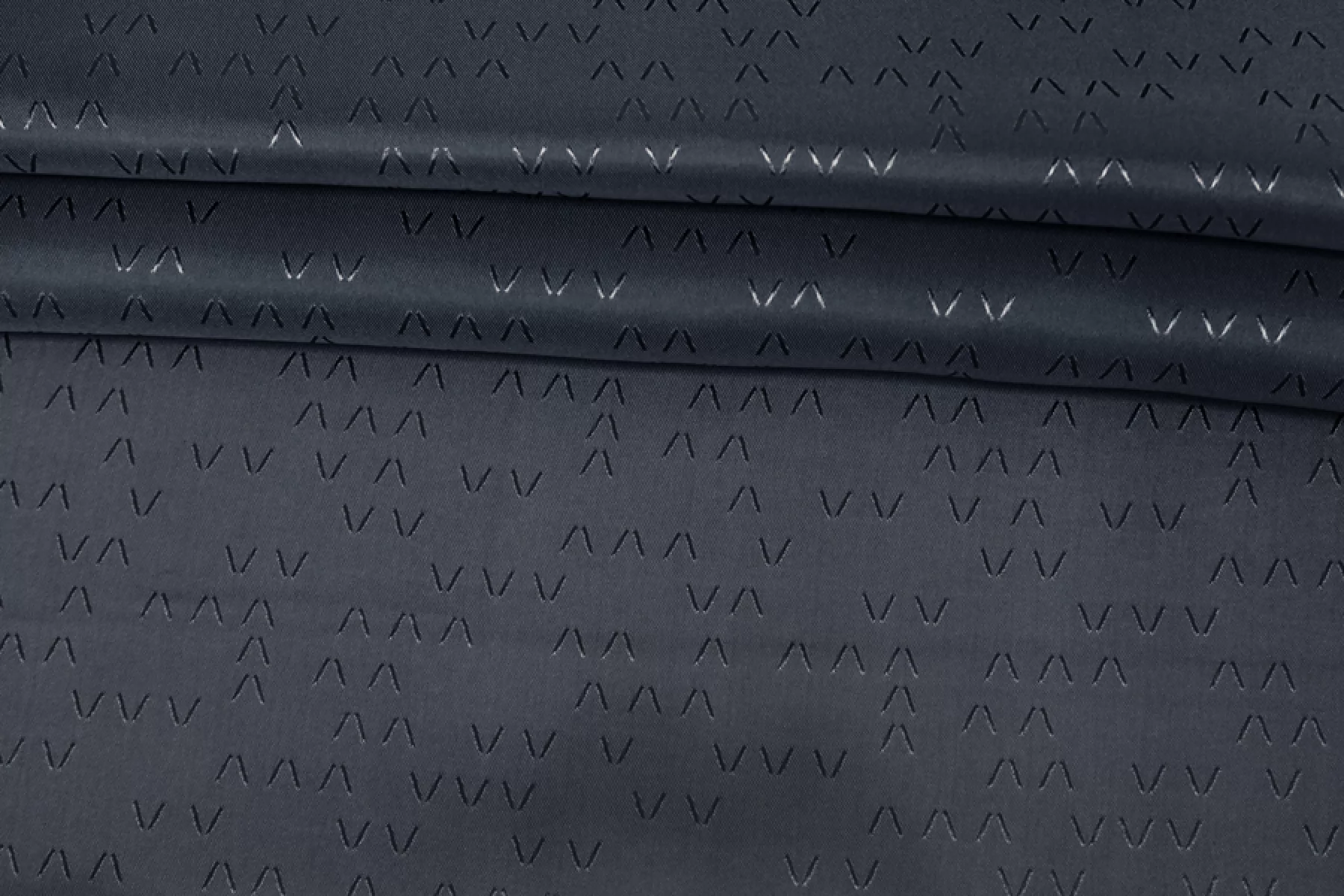 Подкладочная вискоза стрейч, сложного, очень темного синего оттенка с графитовым подтоном и с жаккардовой абстрактно-геометрической выработкой. Тонкая, тактильно приятная, мягкая. Неплохо тянется за счет эластана. Просвечивает силуэт. Шелковистая, с красивым лоском. Сминается. Форму держит слабо. Отлично подойдет как подкладочный материал к костюмно-плательной группе. Обязательно учитывайте возможную усадку 5-10%