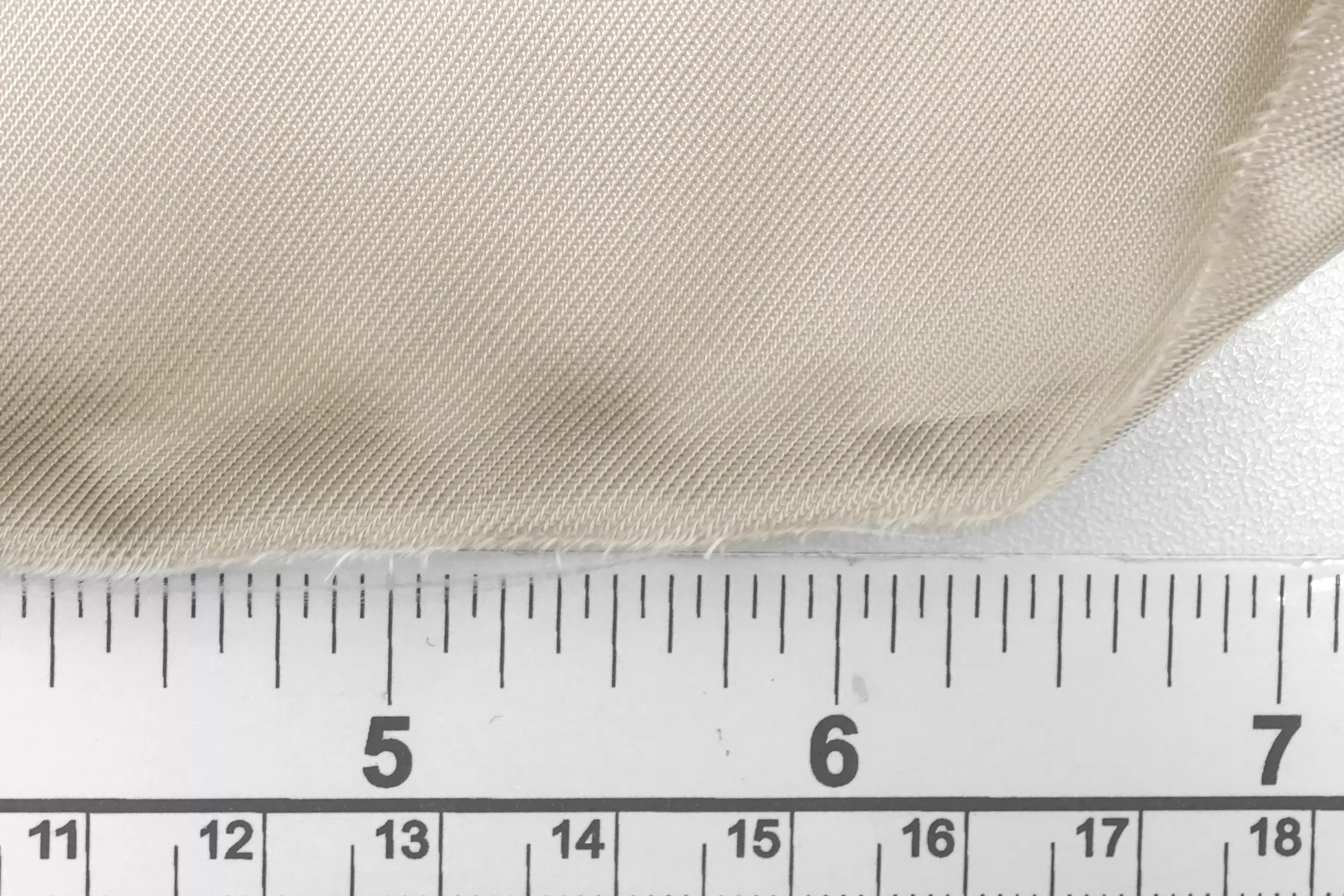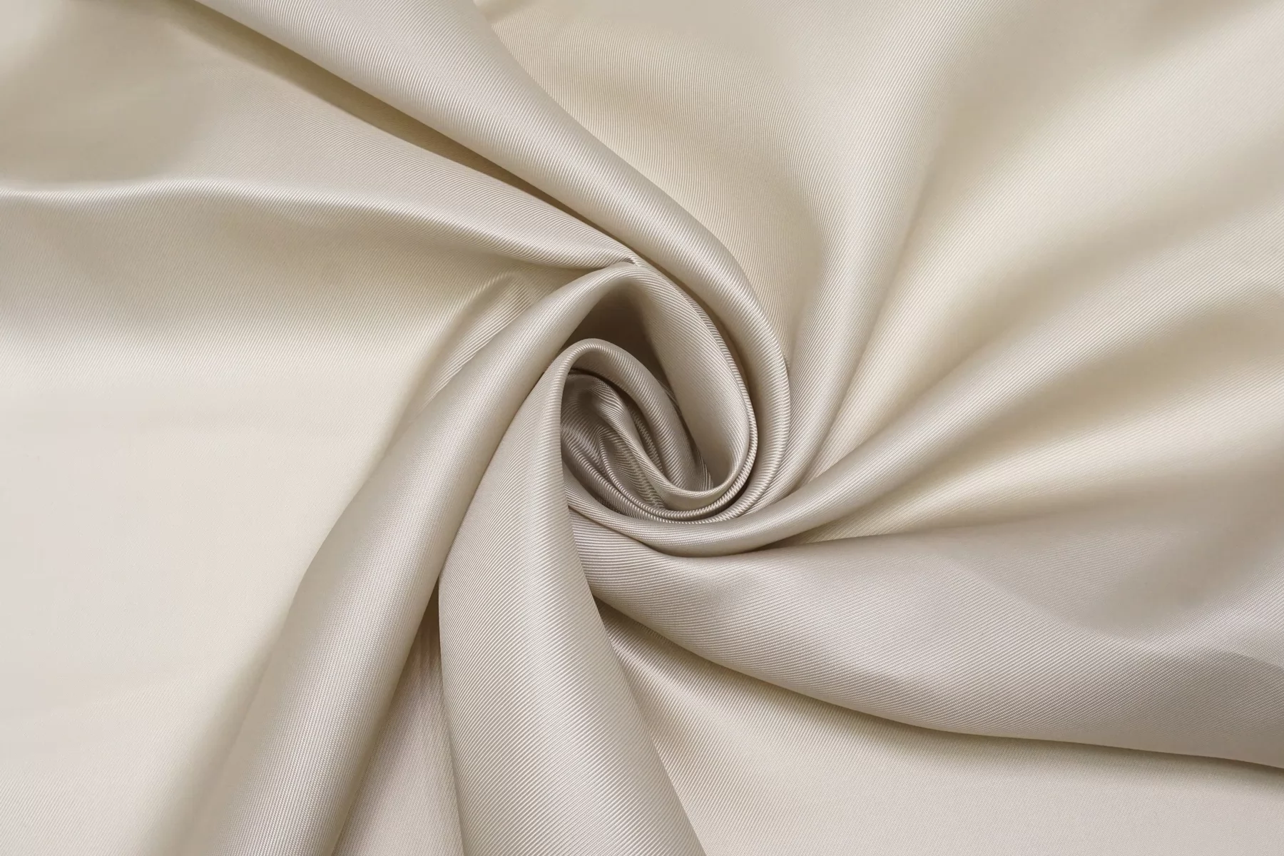 Подкладочная вискоза очень светлого бежевого цвета, диагональное плетение. Гладкая, тонкая, обладает красивым лоском. Не тянется. Мнется. Подойдет как подкладочный материал к костюмной группе, демисезонным пальто, курткам. Обязательно учитывайте возможную усадку 5-10%