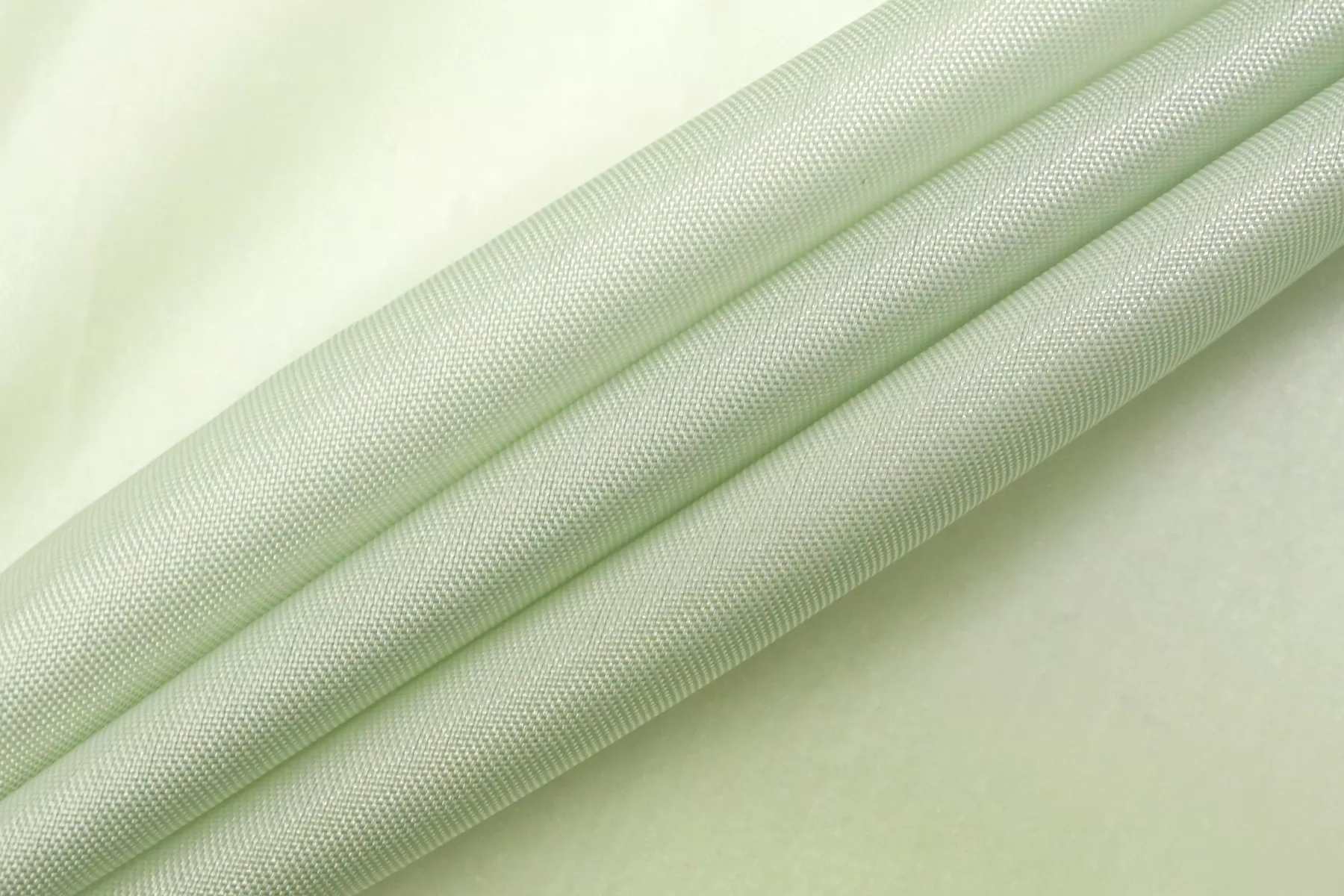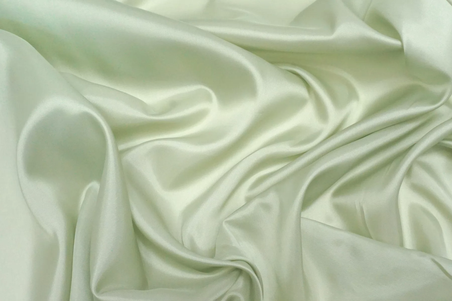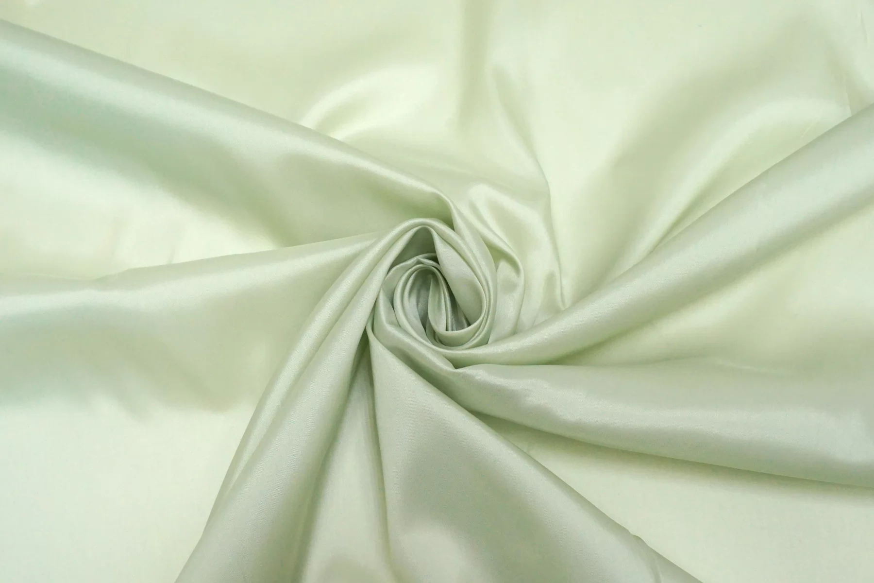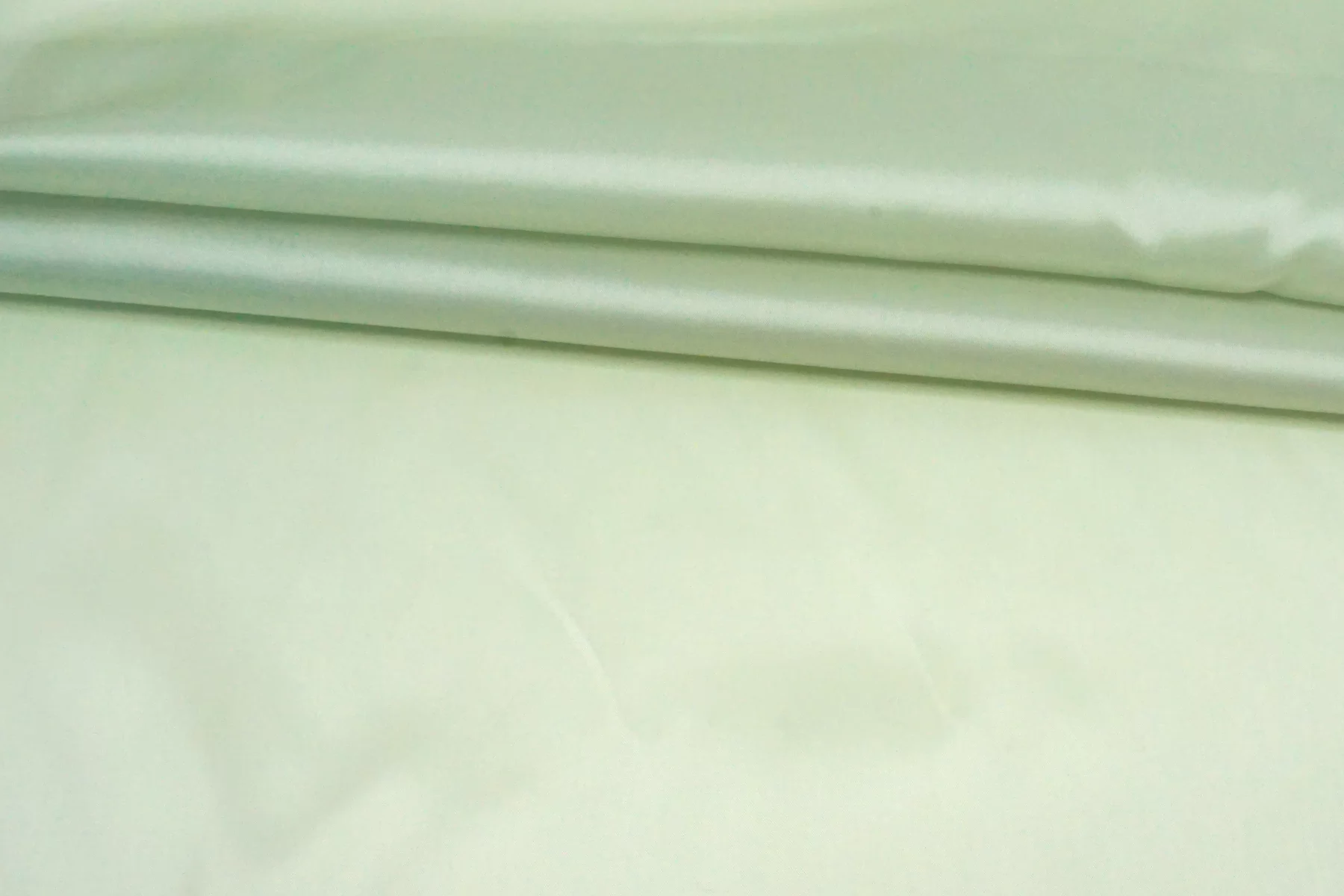 Подкладочная вискоза с ацетатом светлого, разбелённого оттенка зелёной мяты, полотняное плетение. Гладкая, тонкая, обладает красивым лоском. Не тянется. Мнется. Подойдет как подкладочный материал к костюмно-плательной группе. Обязательно учитывайте возможную усадку 5-10%
