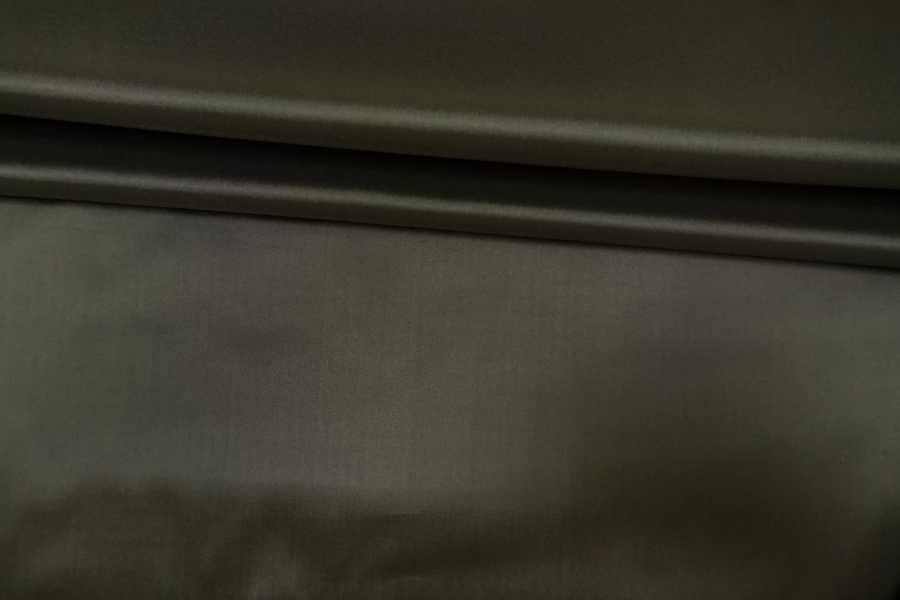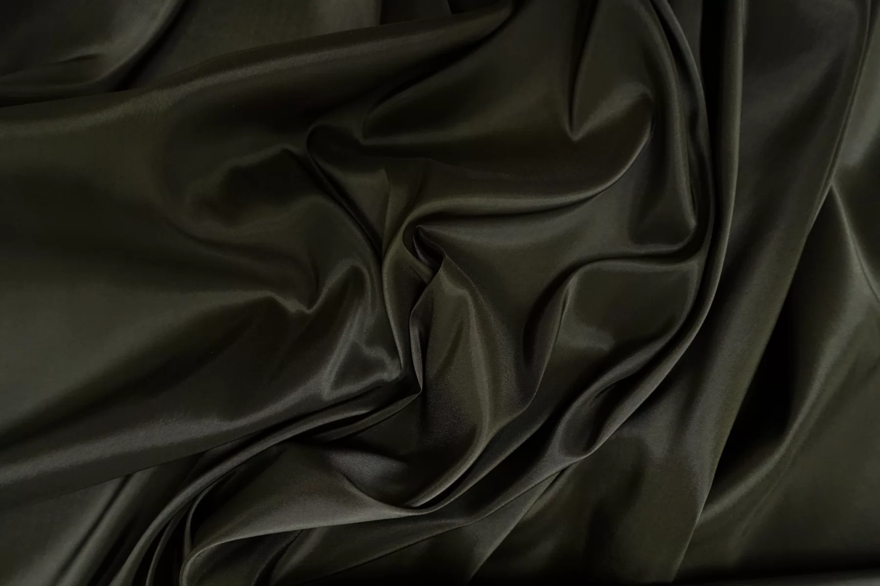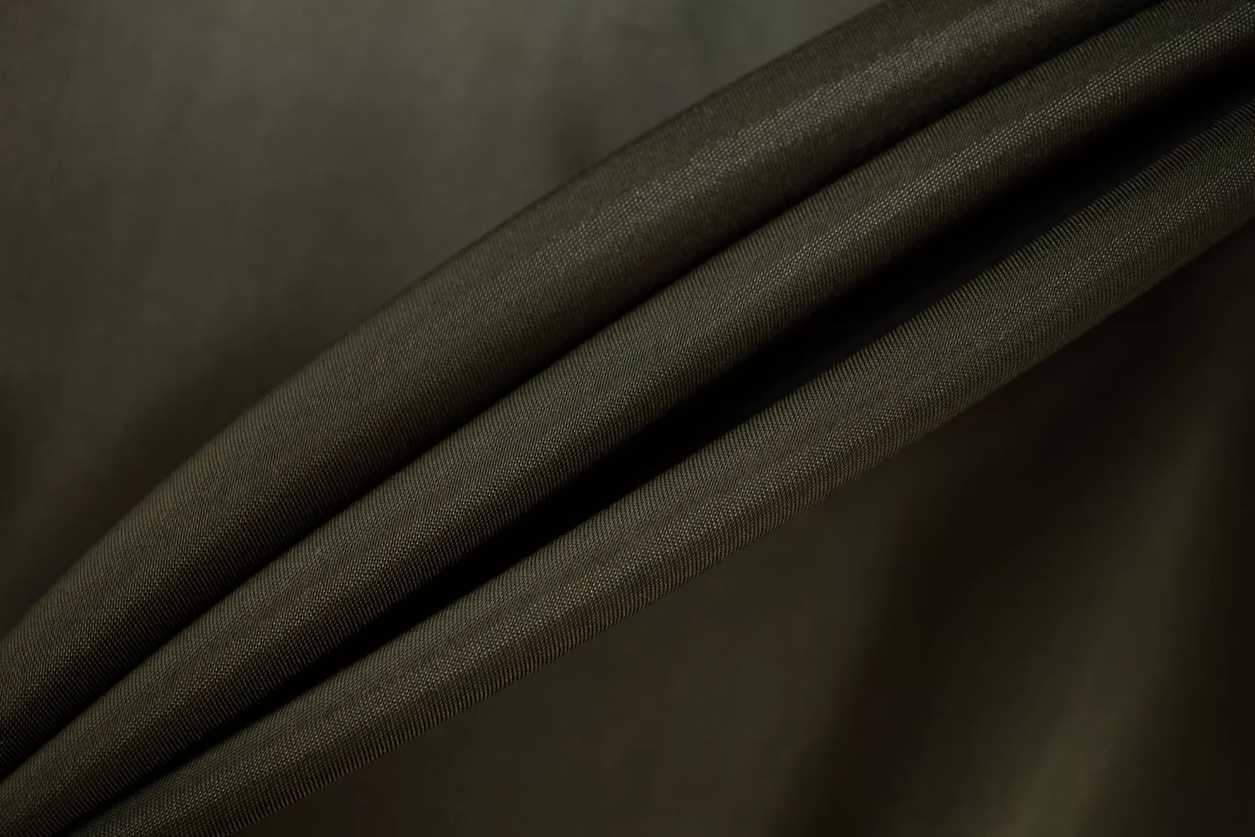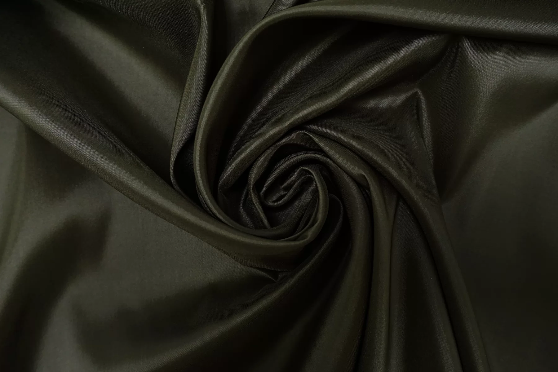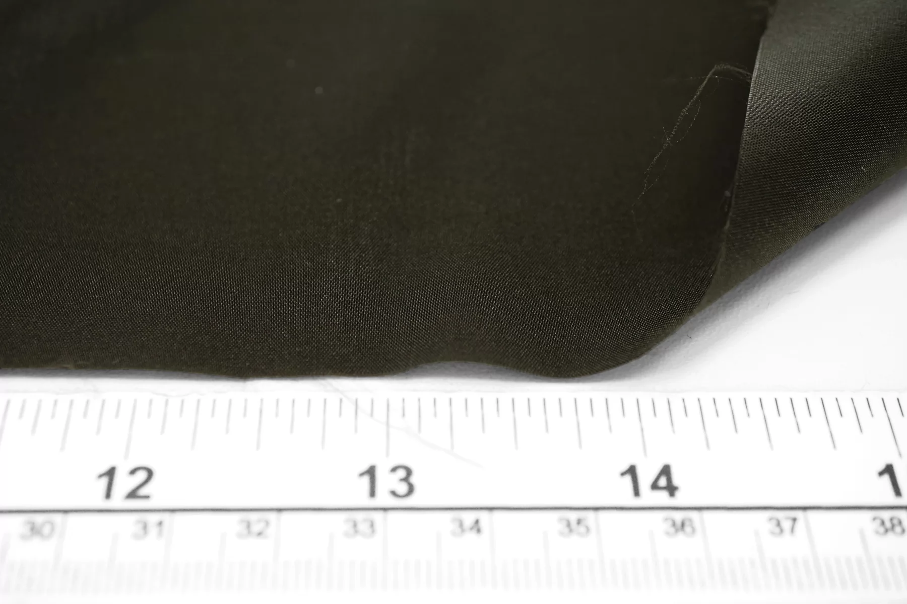 Подкладочная вискоза в тёмно-зелёном цвете (с тёплым подтоном), полотняное плетение. Гладкая, тонкая, обладает мягким лоском. Немного тянется благодаря элиту в составе. Мнется. Подойдет как подкладочный материал к костюмно-плательной группе. Обязательно учитывайте возможную усадку 5-10%