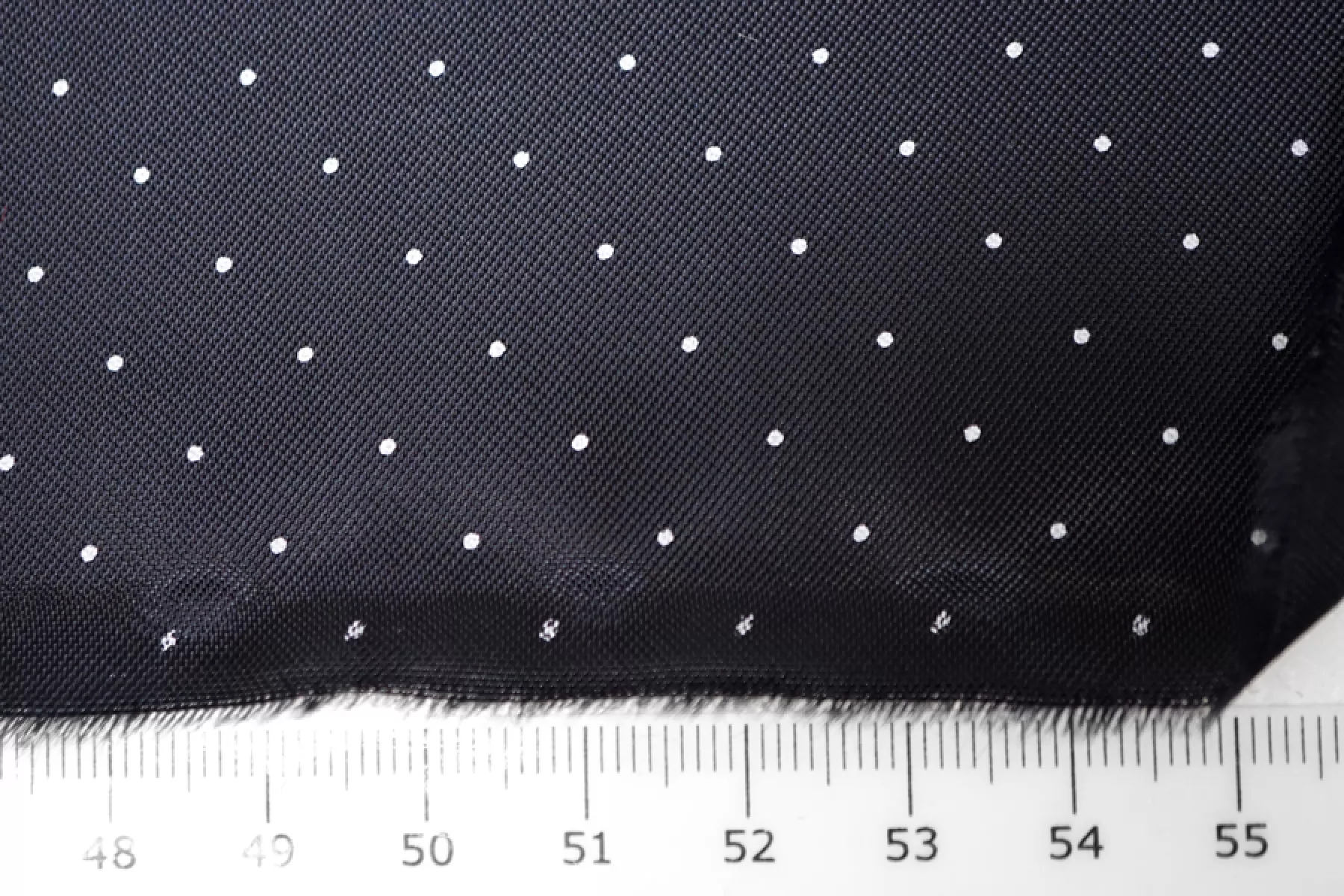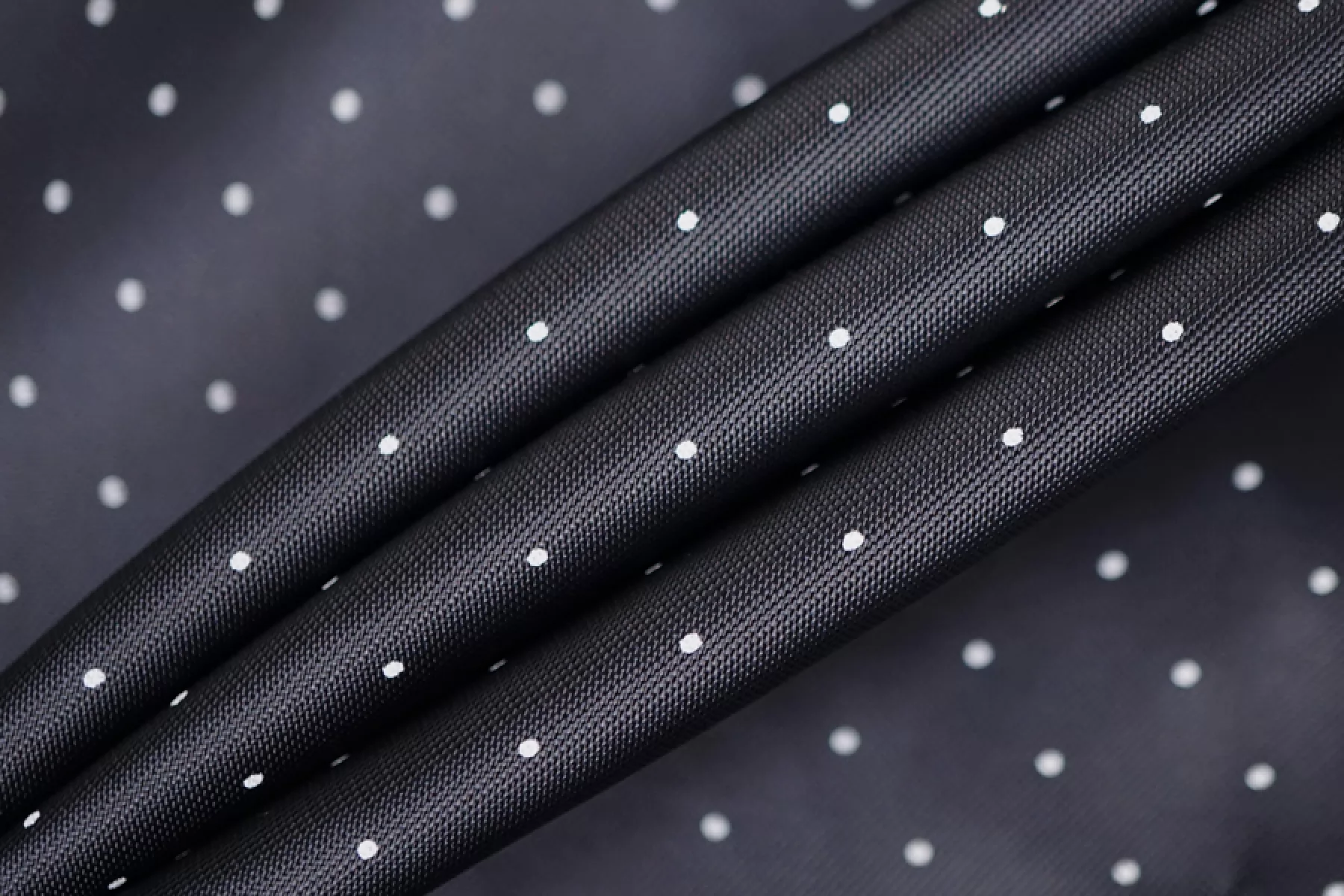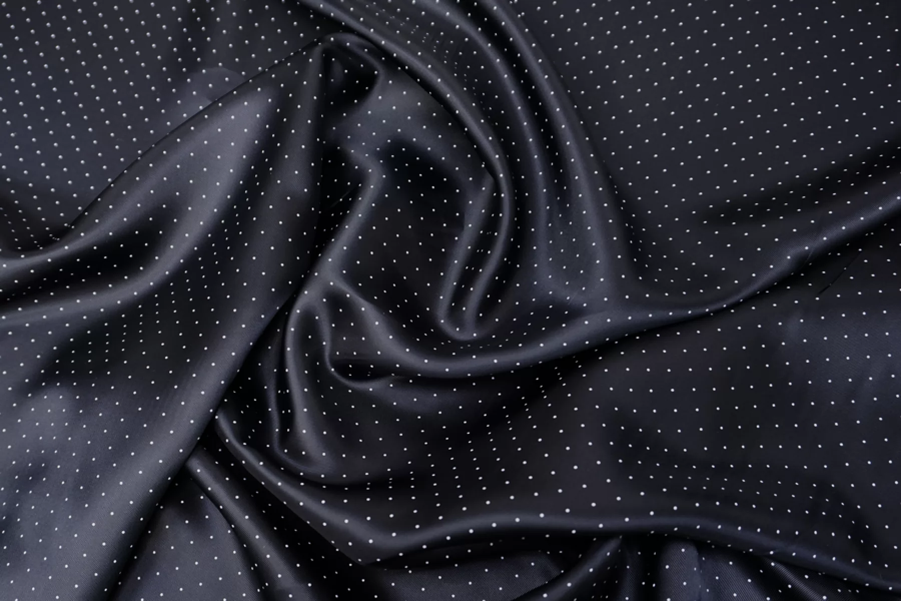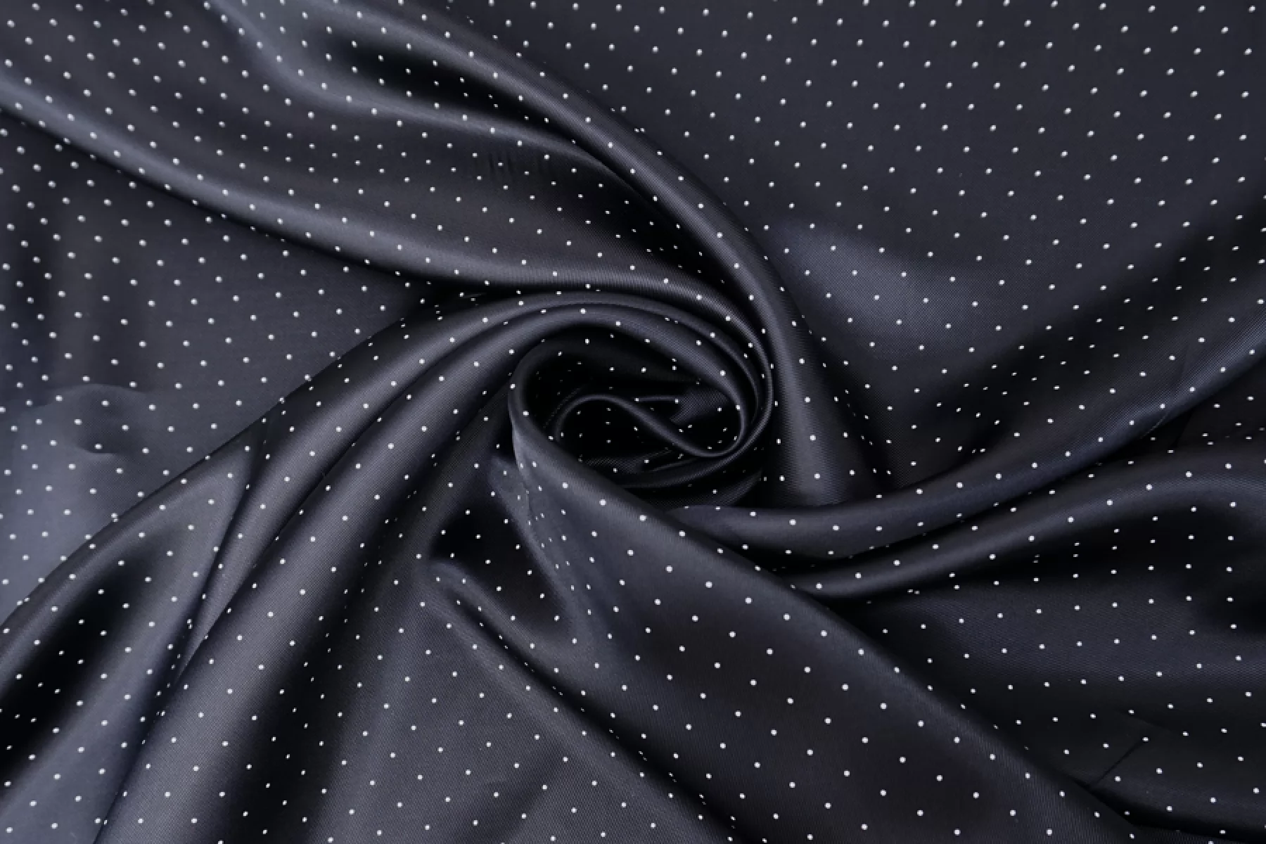 Классная подкладочная вискоза темно-синего цвета в мелкий белый горошек плетение диагональное. Гладкая, шелковистая, плотненькая. Красиво блестит. Просвечивает силуэт. Форму держит. Подойдет для изделий на костюмы: к пиджакам, жилеткам, юбкам и брюкам и на верхнюю группу. Обязательно учитывайте усадку 5-10%.