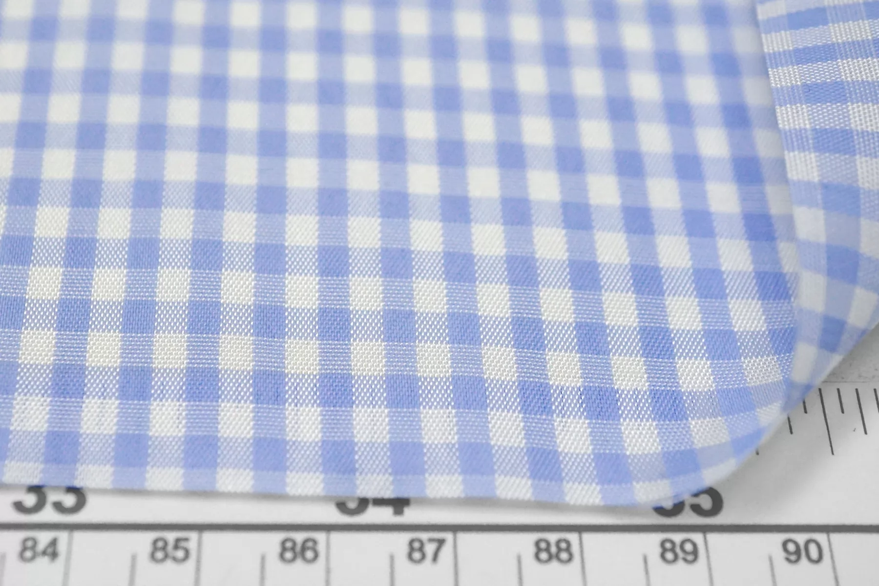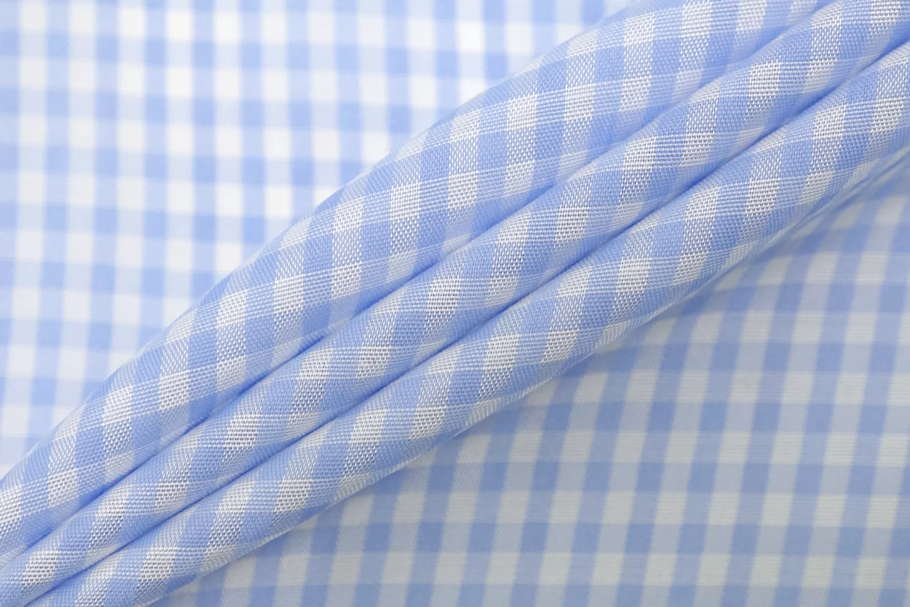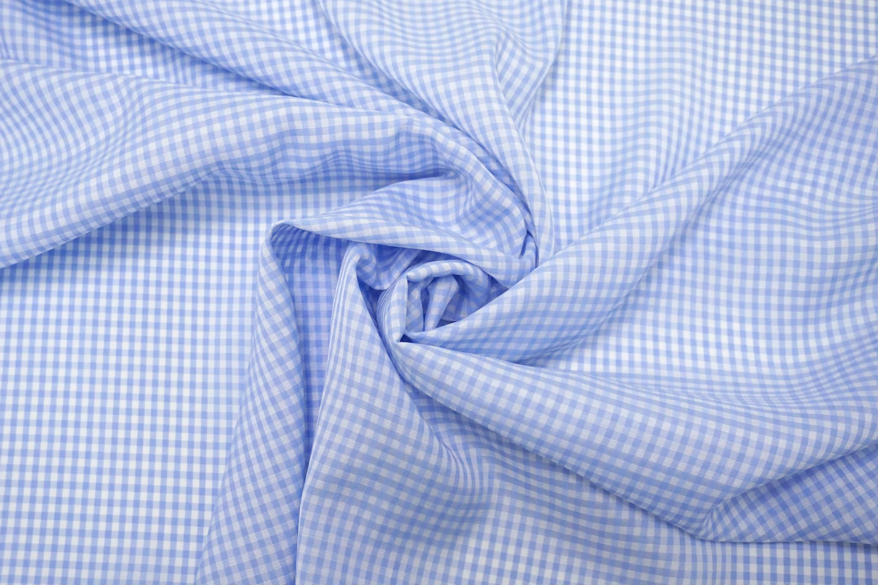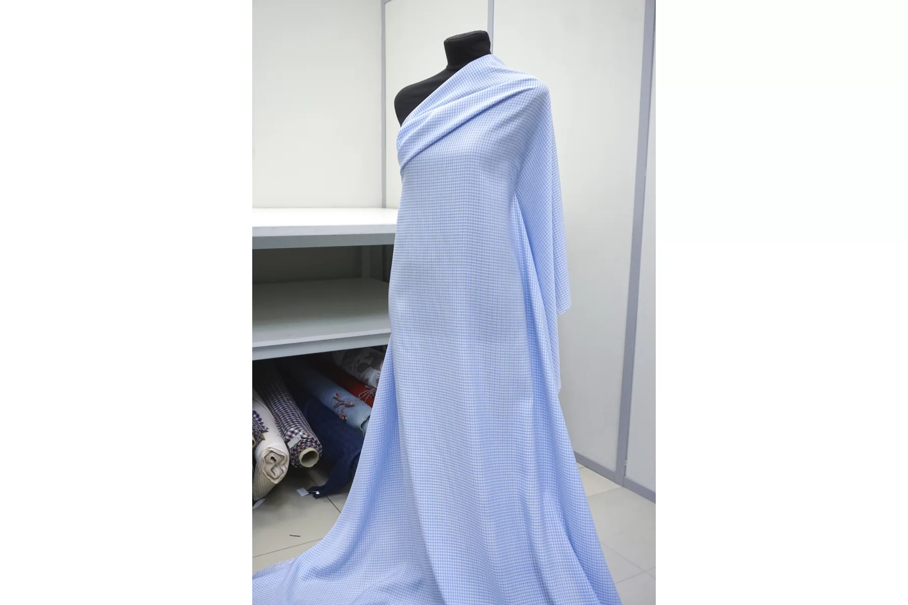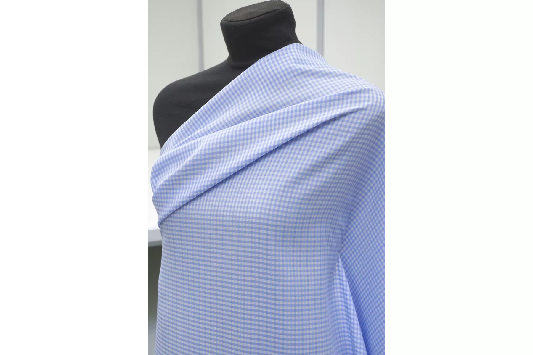 Подкладочная итальянская вискоза с небольшой добавкой ацетата, с узором-клеткой, бело-голубого цвета. Шелковистая, обладает легким блеском, тонкая. Подойдет на подкладку к платьям, юбкам.